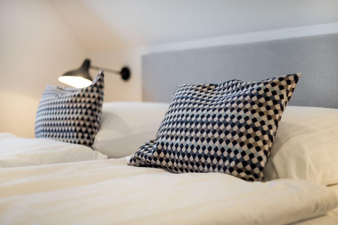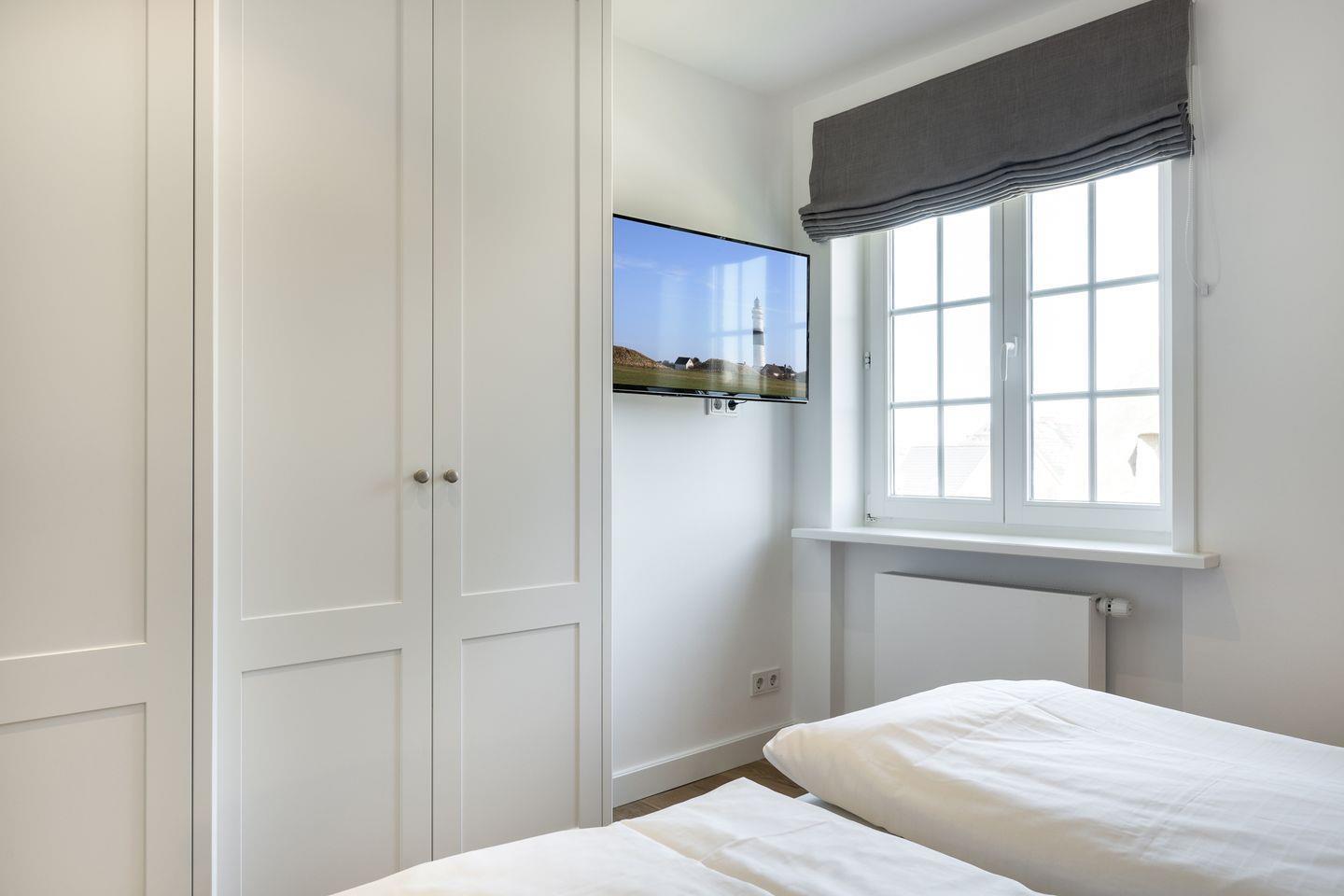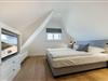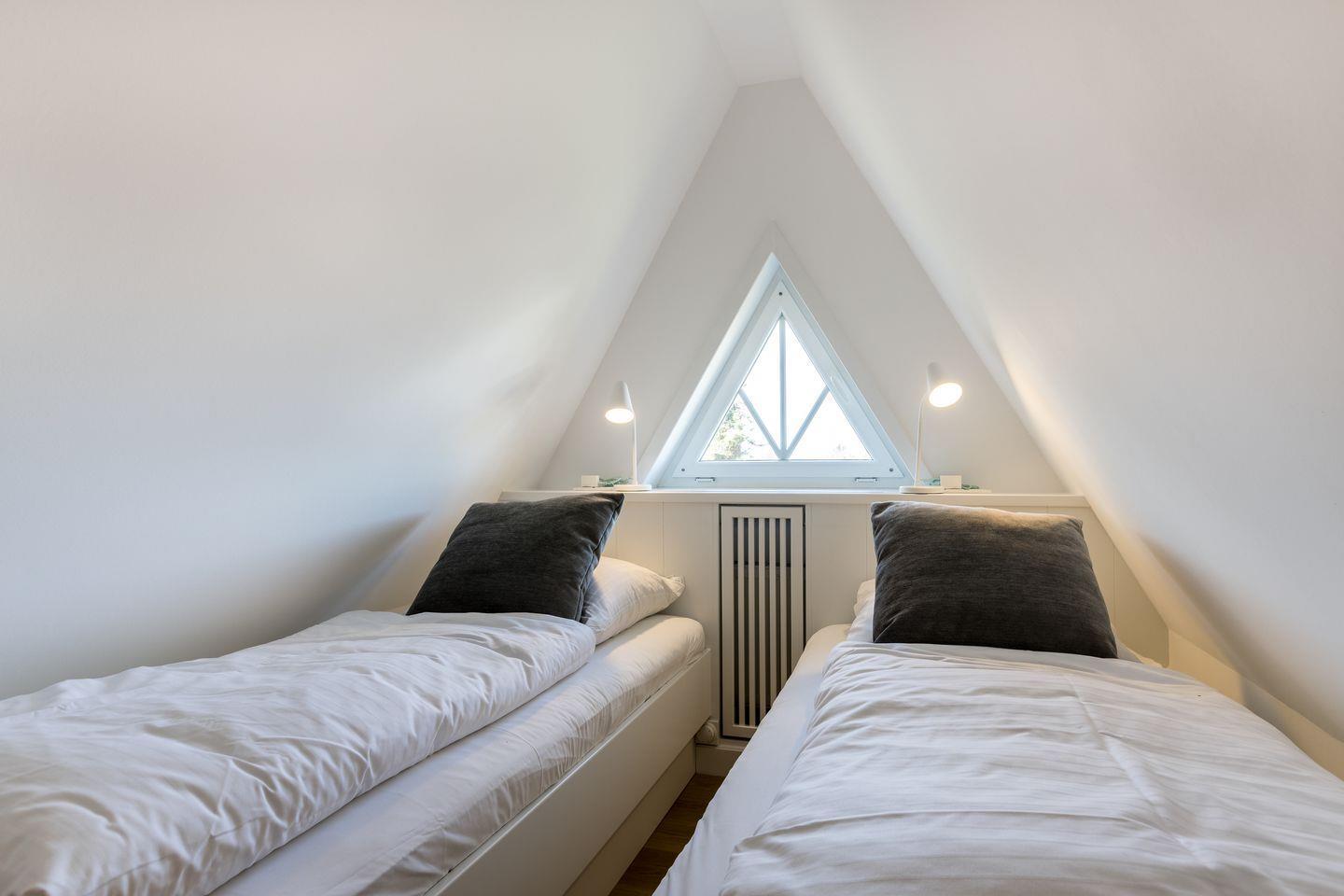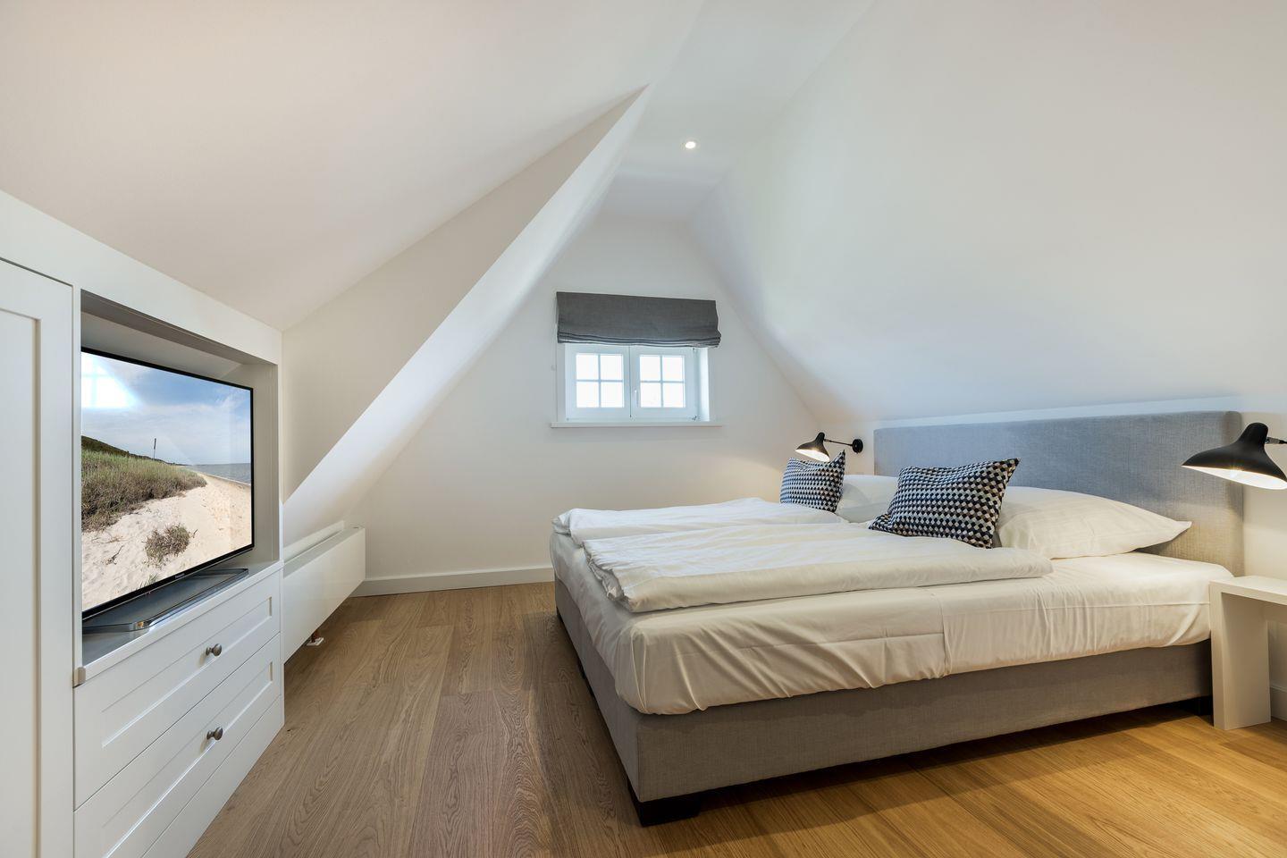 DG: Raum mit Boxspring Bett (ca. 1,8m x 2m) und sogar kleinem Dünen- und Meerblick. Kleines Bad mit Dusche und WC.