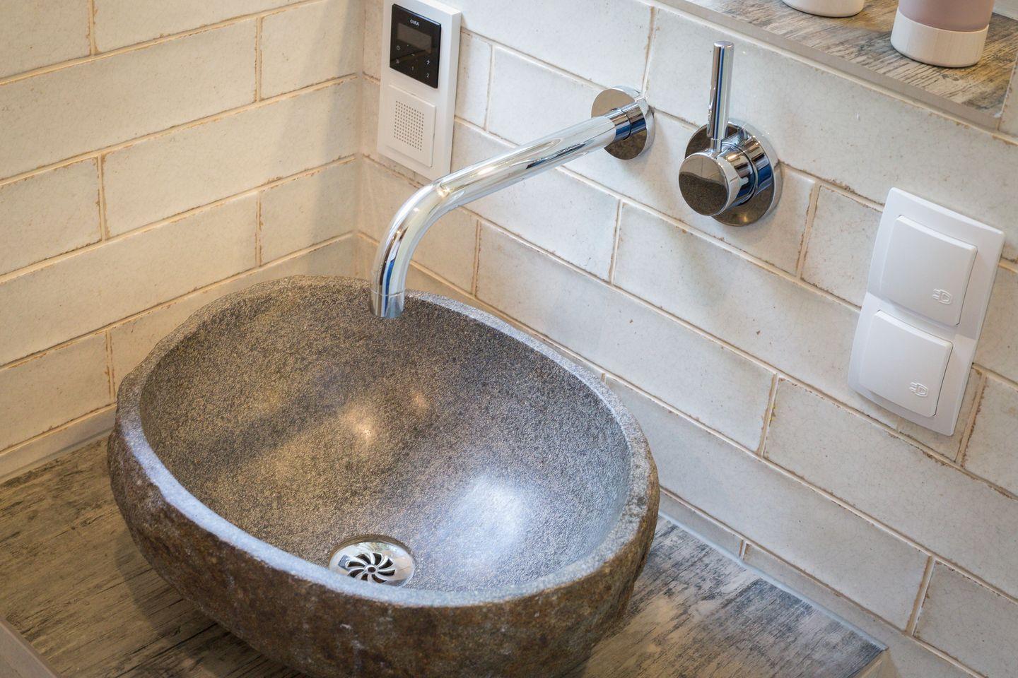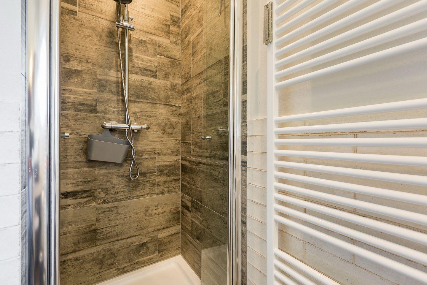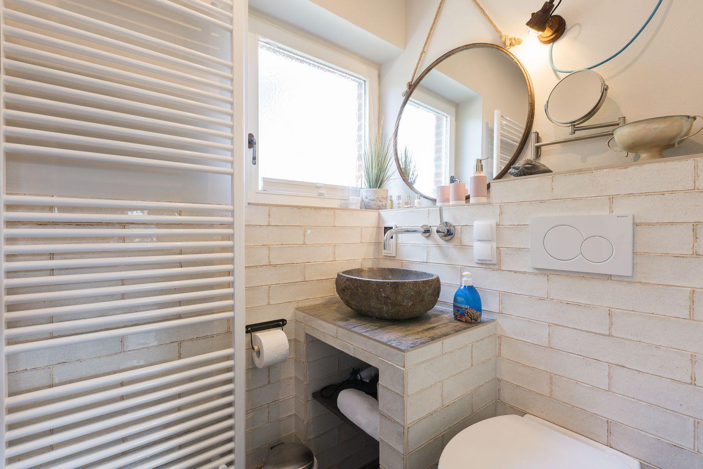 Das Appartement verfügt über ein Tageslichtbad mit WC und Regendusche, in dem Sie sich sicher wohl fühlen werden. Die Einrichtung des Bades besticht durch außergewöhnliche Möbel und Fliesen.