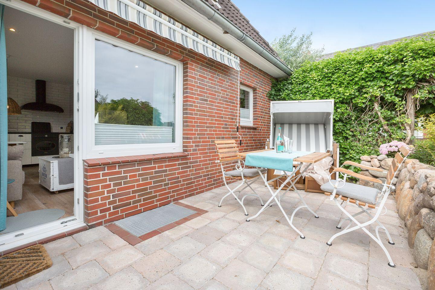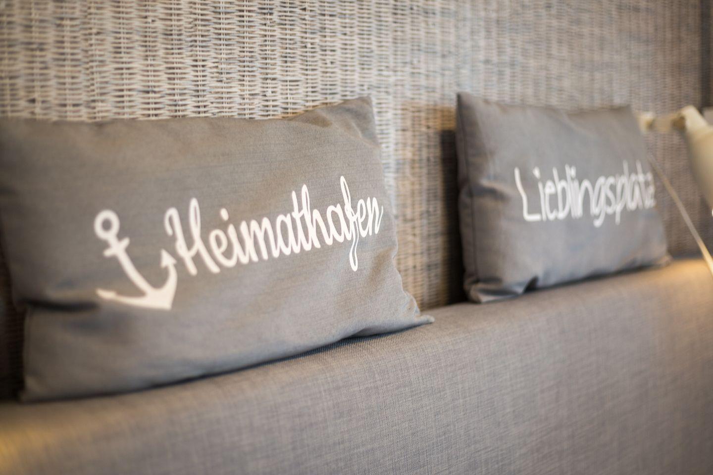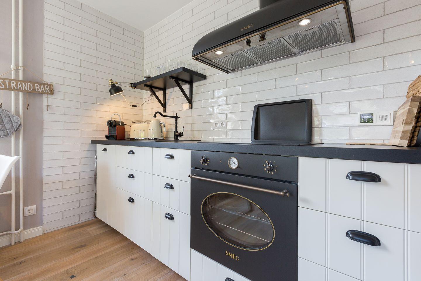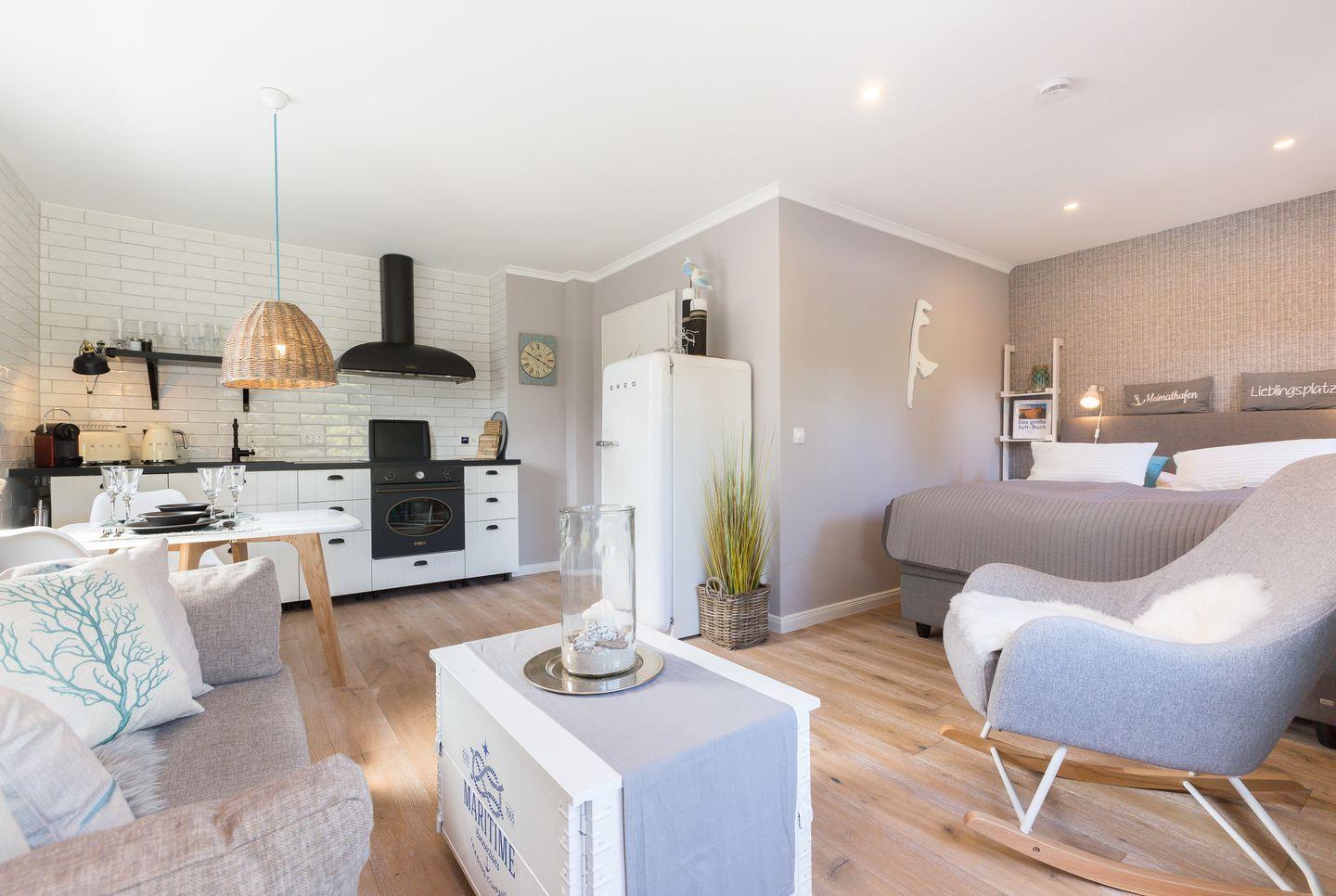Vom kombinierten Wohn- und Schlafraum erreichen Sie Ihre geschützte möblierte Sonnenterrasse, auf der Sie es sich im Sommer mit einem kühlen Glas Wein im eigenen Strandkorb unter der Markise gemütlich machen können. Die Ferienwohnung bietet Ihnen ein modernes Boxspringbett von Ruf, um nachts ungestört von der Nordseeluft träumen zu können. Der Wohnbereich wird ergänzt durch eine top-ausgestattete Küchenzeile, mit 4 Platten Induktionsherd, Backofen und hochwertigen SMEG-Küchengeräten.