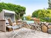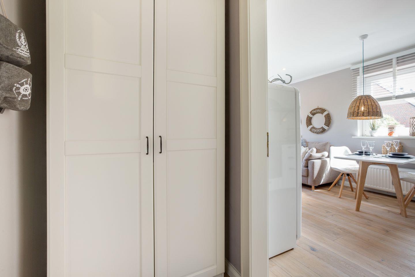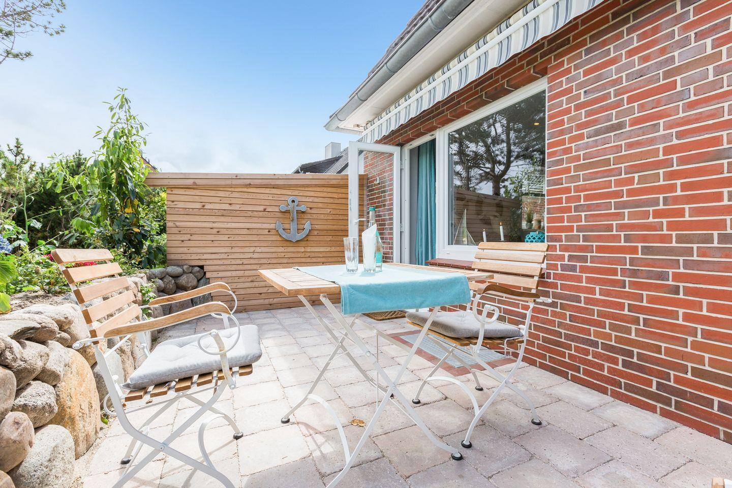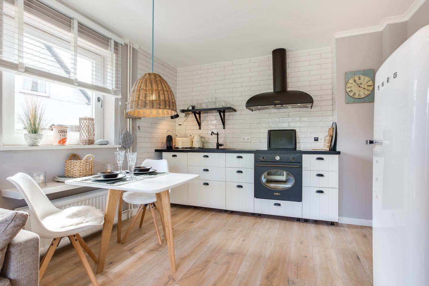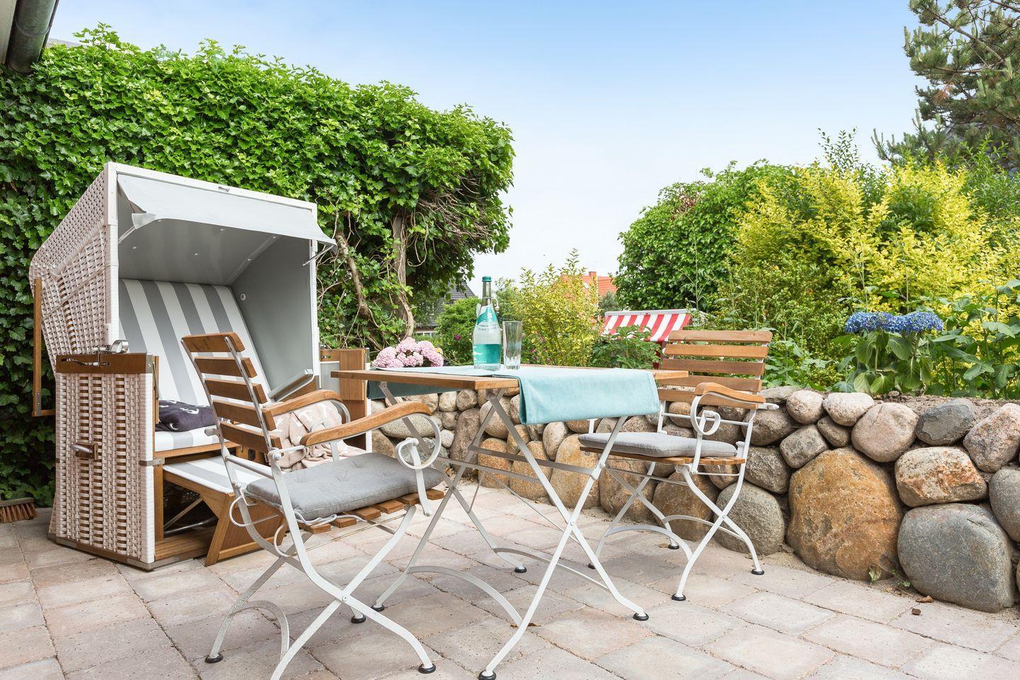 Vom kombinierten Wohn- und Schlafraum erreichen Sie Ihre geschützte möblierte Sonnenterrasse, auf der Sie es sich im Sommer mit einem kühlen Glas Wein im eigenen Strandkorb unter der Markise gemütlich machen können. Die Ferienwohnung bietet Ihnen ein modernes Boxspringbett von Ruf, um nachts ungestört von der Nordseeluft träumen zu können. Der Wohnbereich wird ergänzt durch eine top-ausgestattete Küchenzeile, mit 4 Platten Induktionsherd, Backofen und hochwertigen SMEG-Küchengeräten.
