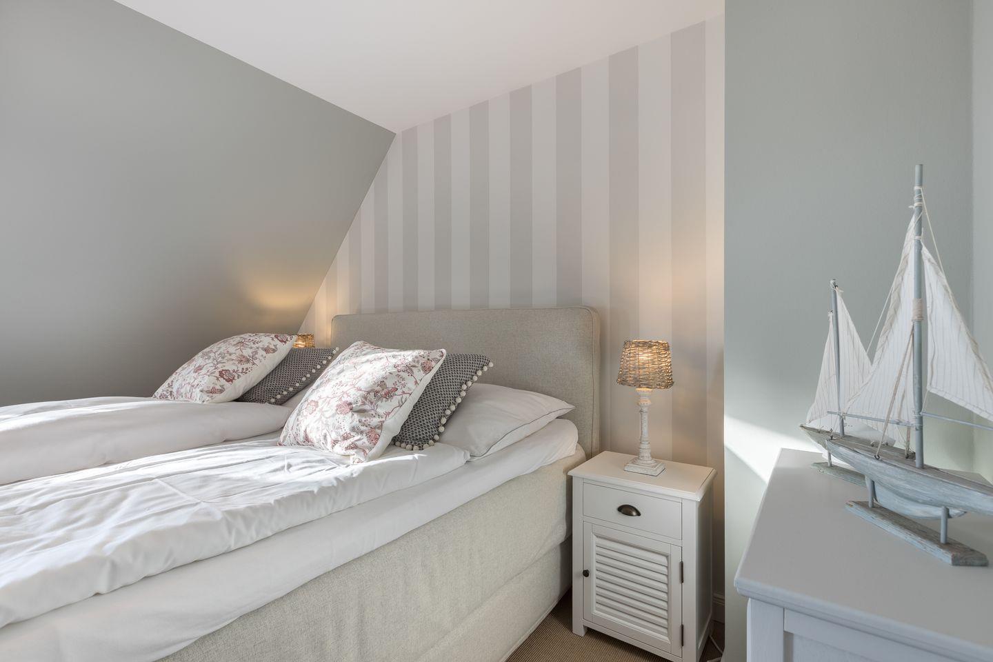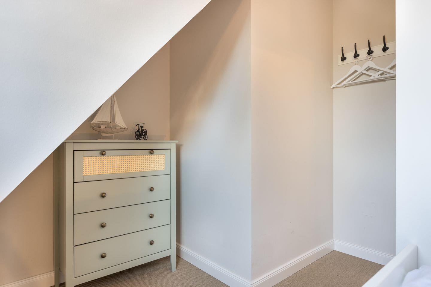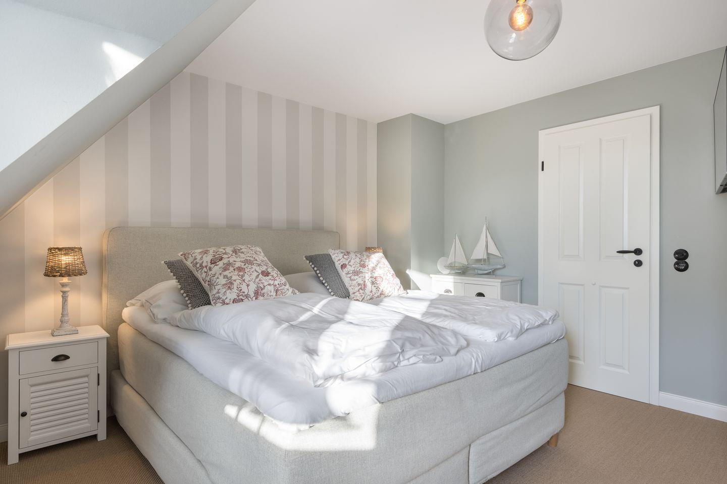 Vom Wohnzimmer aus erreichen Sie eine kleine Südterrasse, die mit einem Strandkorb möbliert ist. Das Erdgeschoss der Wohnung verfügt außerdem über ein Gäste-WC. Über die Treppe erreichen Sie das Obergeschoss, in dem Sie ein großes Schlafzimmer mit Doppelbett, einen Schlafraum mit einem Einzelbett und ein Badezimmer mit Dusche und WC. Im Dachgeschoss befindet sich das dritte Schlafzimmer, das über zwei Einzelbetten verfügt.