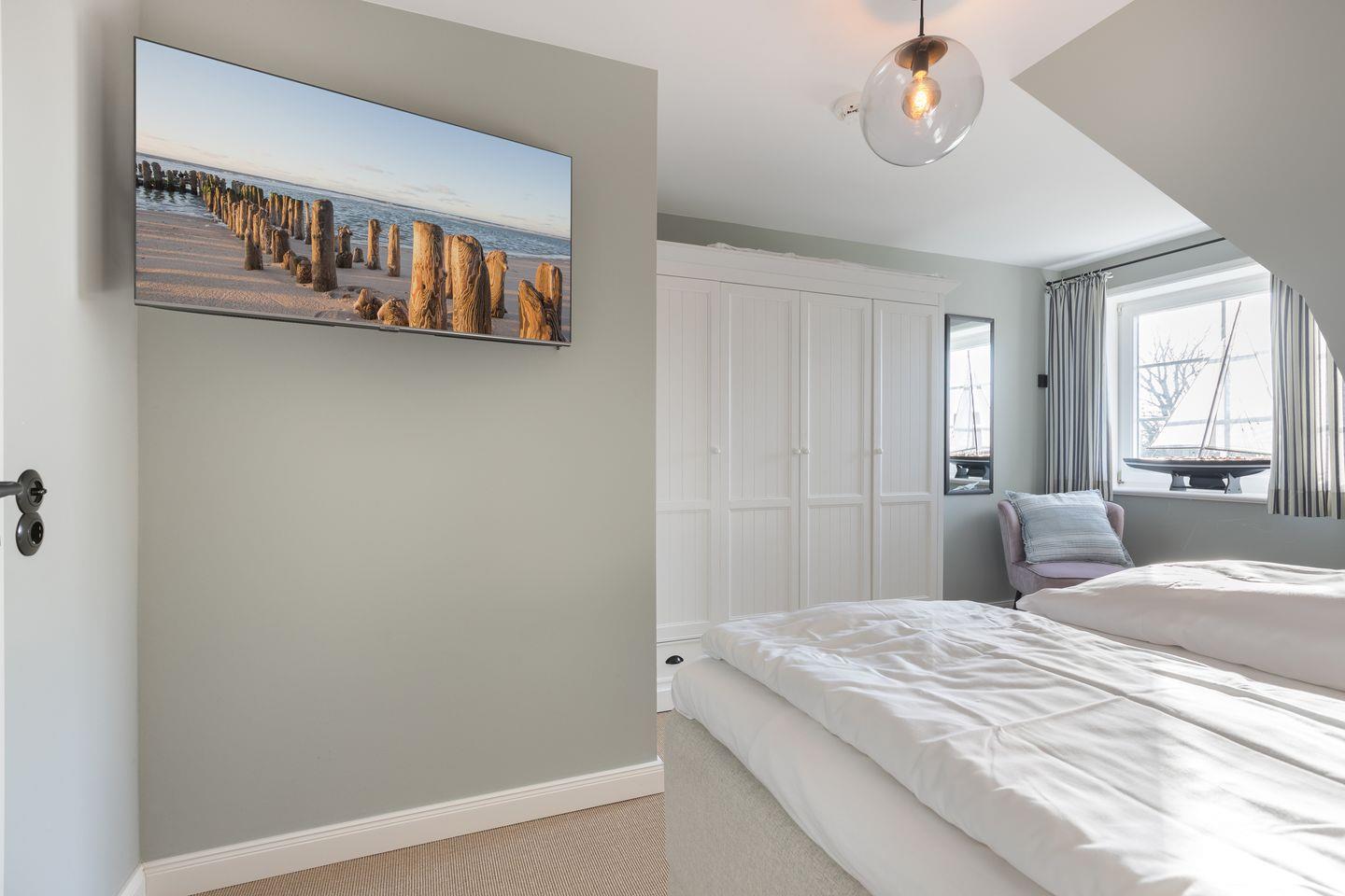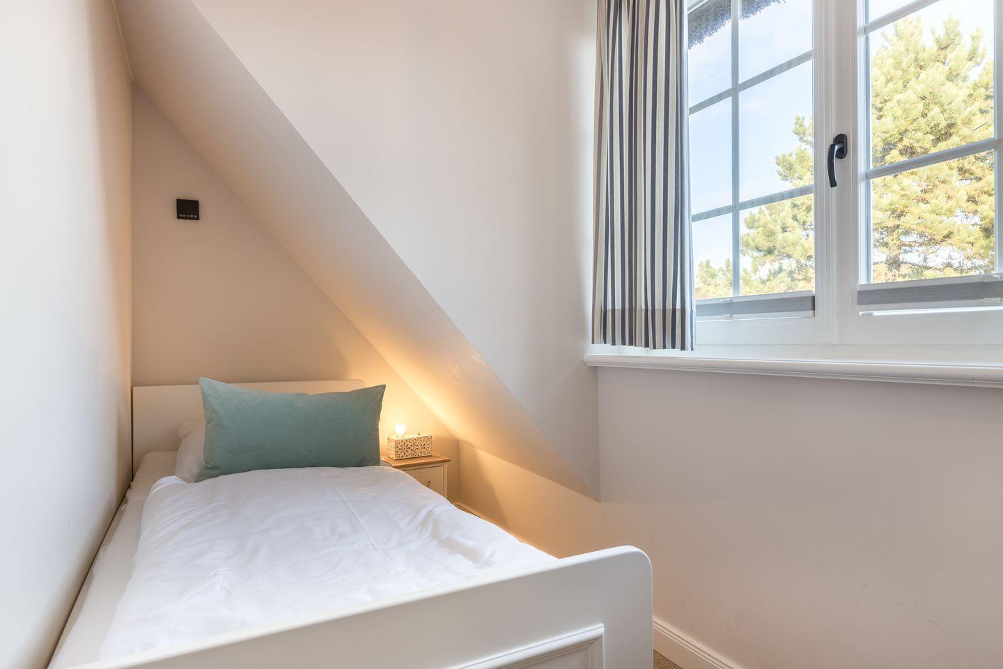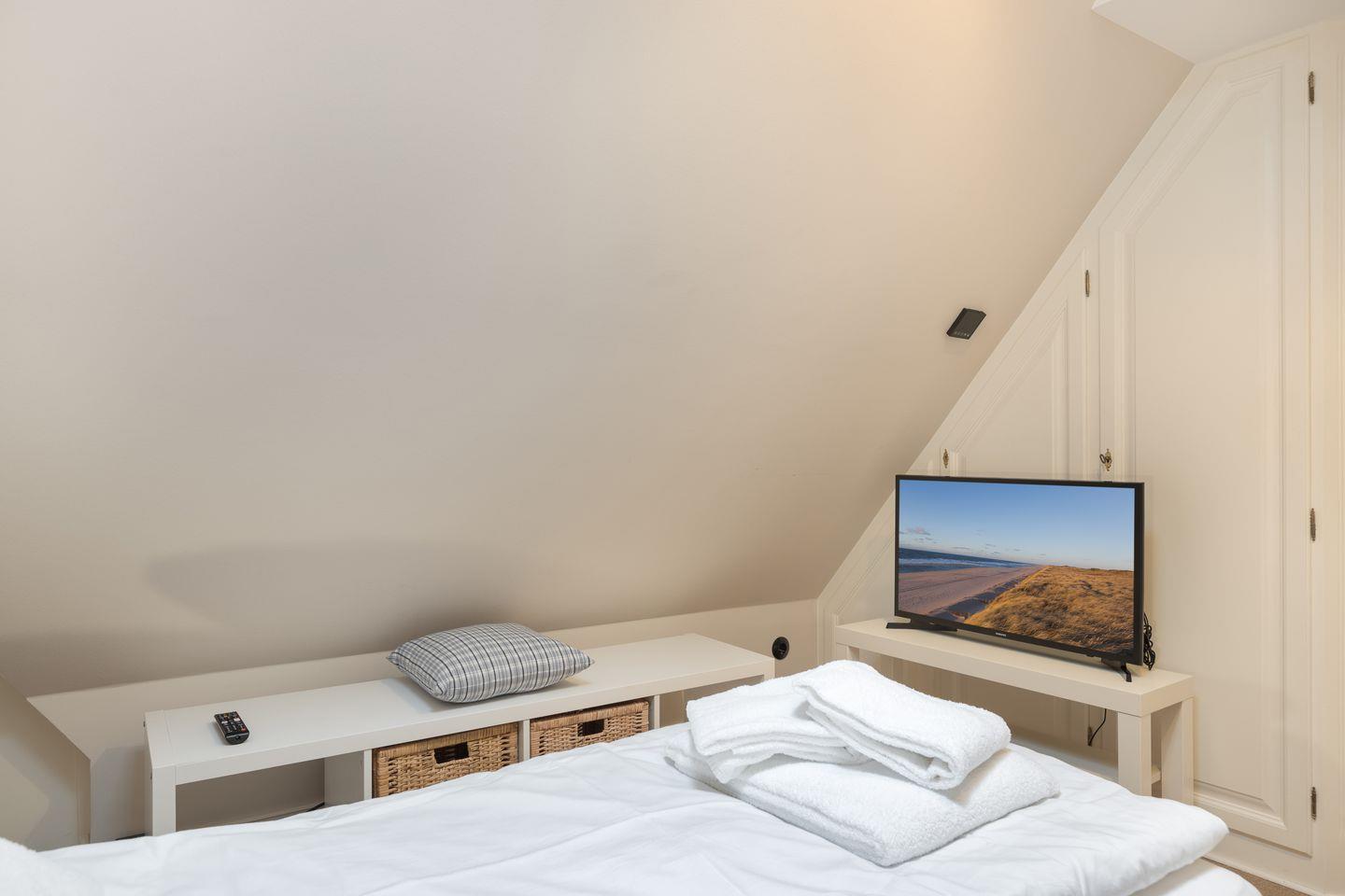 Vom Wohnzimmer aus erreichen Sie eine kleine Südterrasse, die mit einem Strandkorb möbliert ist. Das Erdgeschoss der Wohnung verfügt außerdem über ein Gäste-WC. Über die Treppe erreichen Sie das Obergeschoss, in dem Sie ein großes Schlafzimmer mit Doppelbett, einen Schlafraum mit einem Einzelbett und ein Badezimmer mit Dusche und WC. Im Dachgeschoss befindet sich das dritte Schlafzimmer, das über zwei Einzelbetten verfügt.