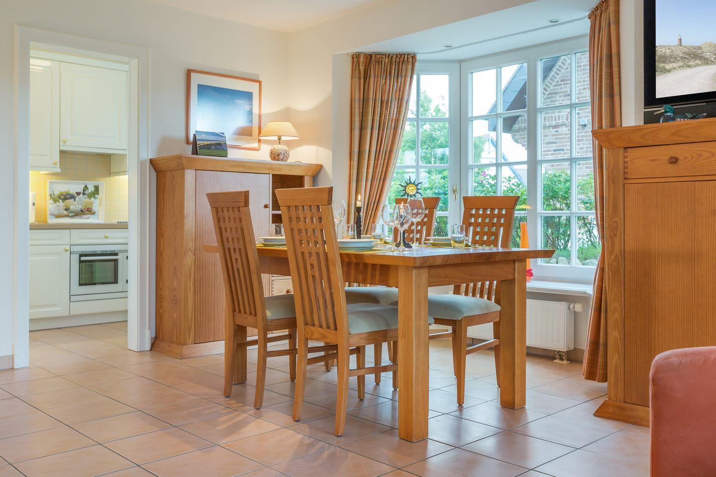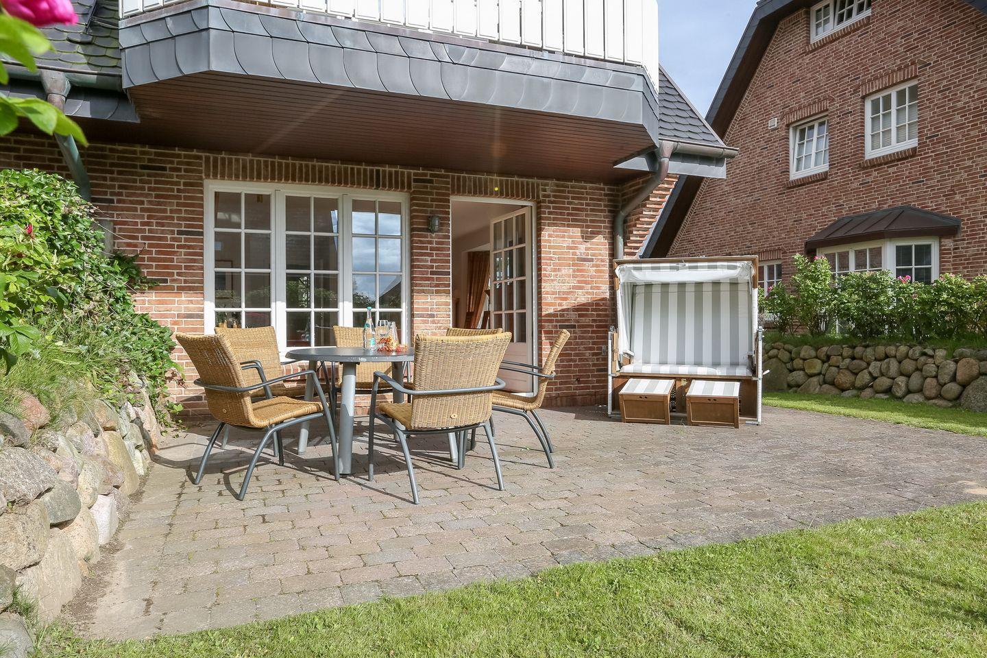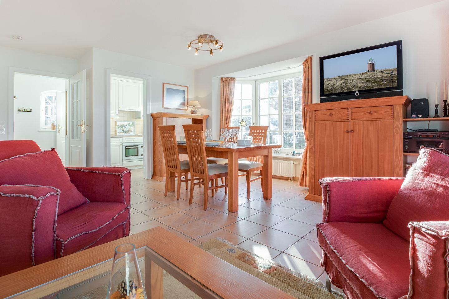 Erdgeschoss: Geschmackvoll und hochwertige möblierter Wohnraum mit Flatscreen-Kabel-TV, Hifi-Anlage und Telefon. Luxuriöse Küche mit Geschirrspüler, Mikrowellen-Backofen-Kombination. Gäste-WC. Sonnige West-Terrasse mit Gartenmöbeln und Strandkorb.