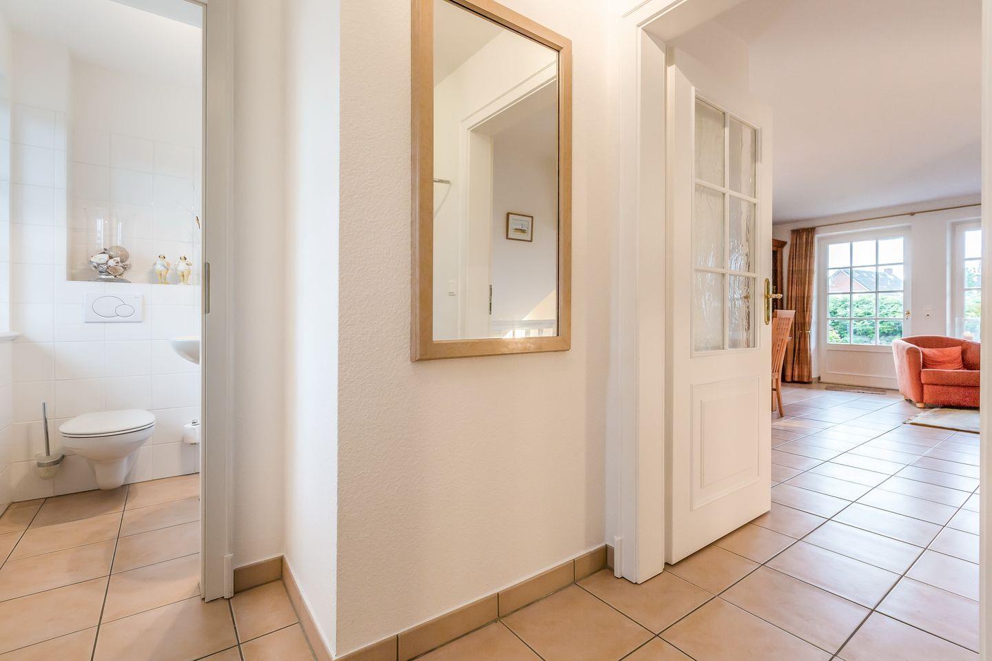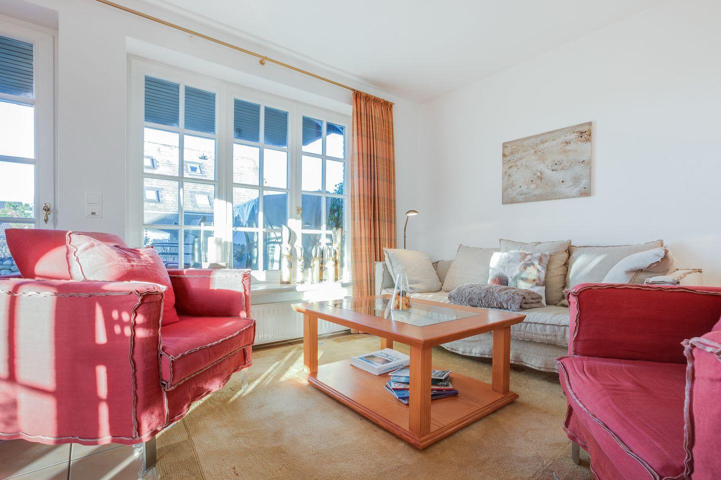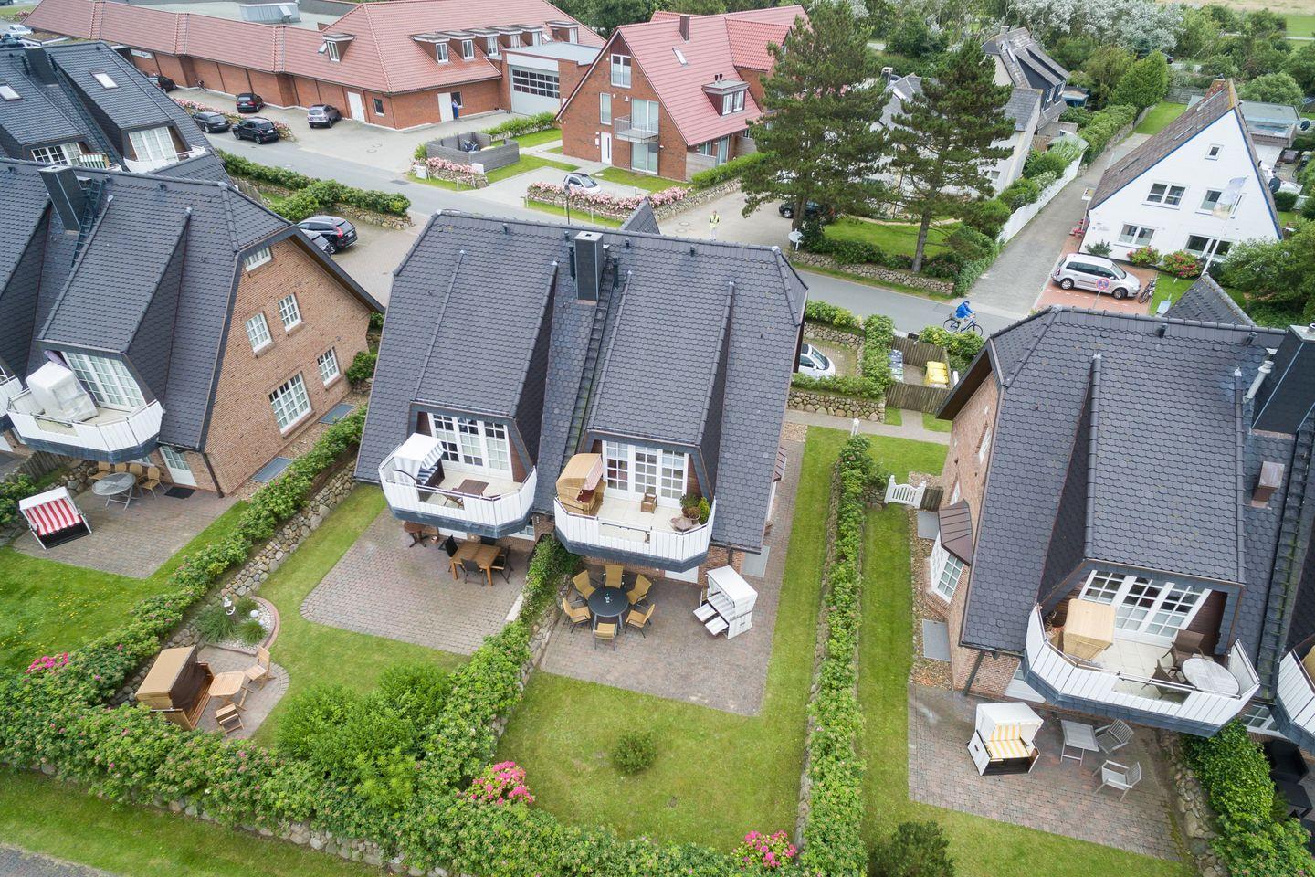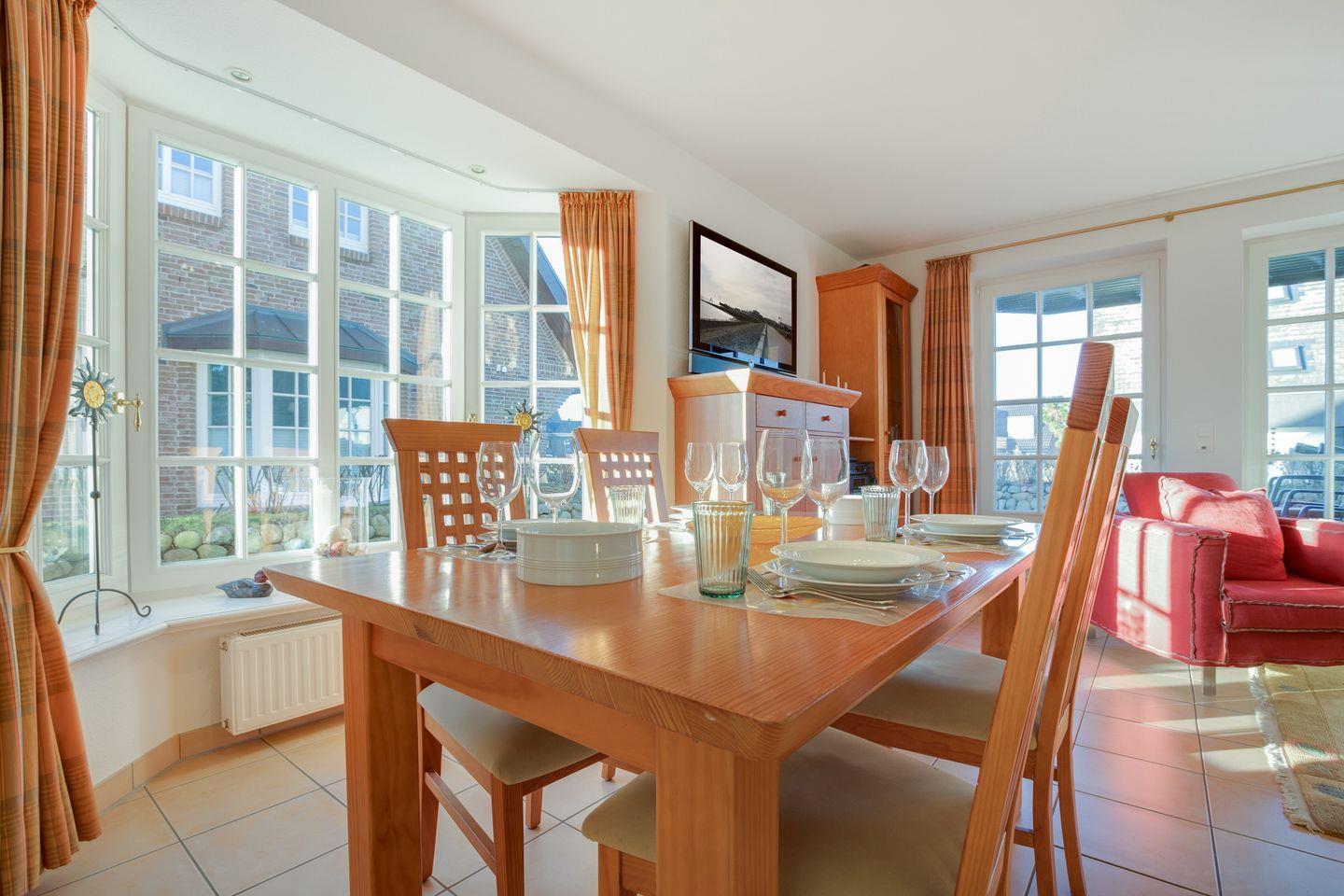 Erdgeschoss: Geschmackvoll und hochwertige möblierter Wohnraum mit Flatscreen-Kabel-TV, Hifi-Anlage und Telefon. Luxuriöse Küche mit Geschirrspüler, Mikrowellen-Backofen-Kombination. Gäste-WC. Sonnige West-Terrasse mit Gartenmöbeln und Strandkorb.