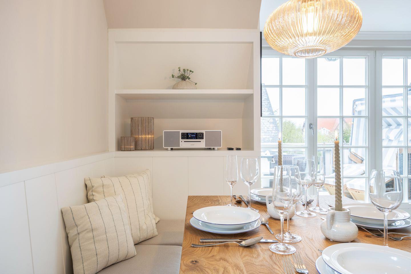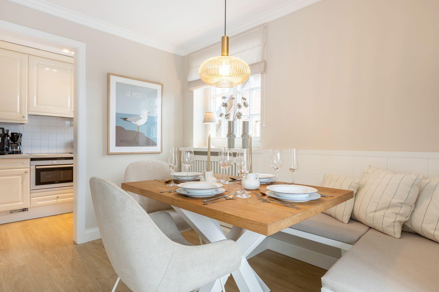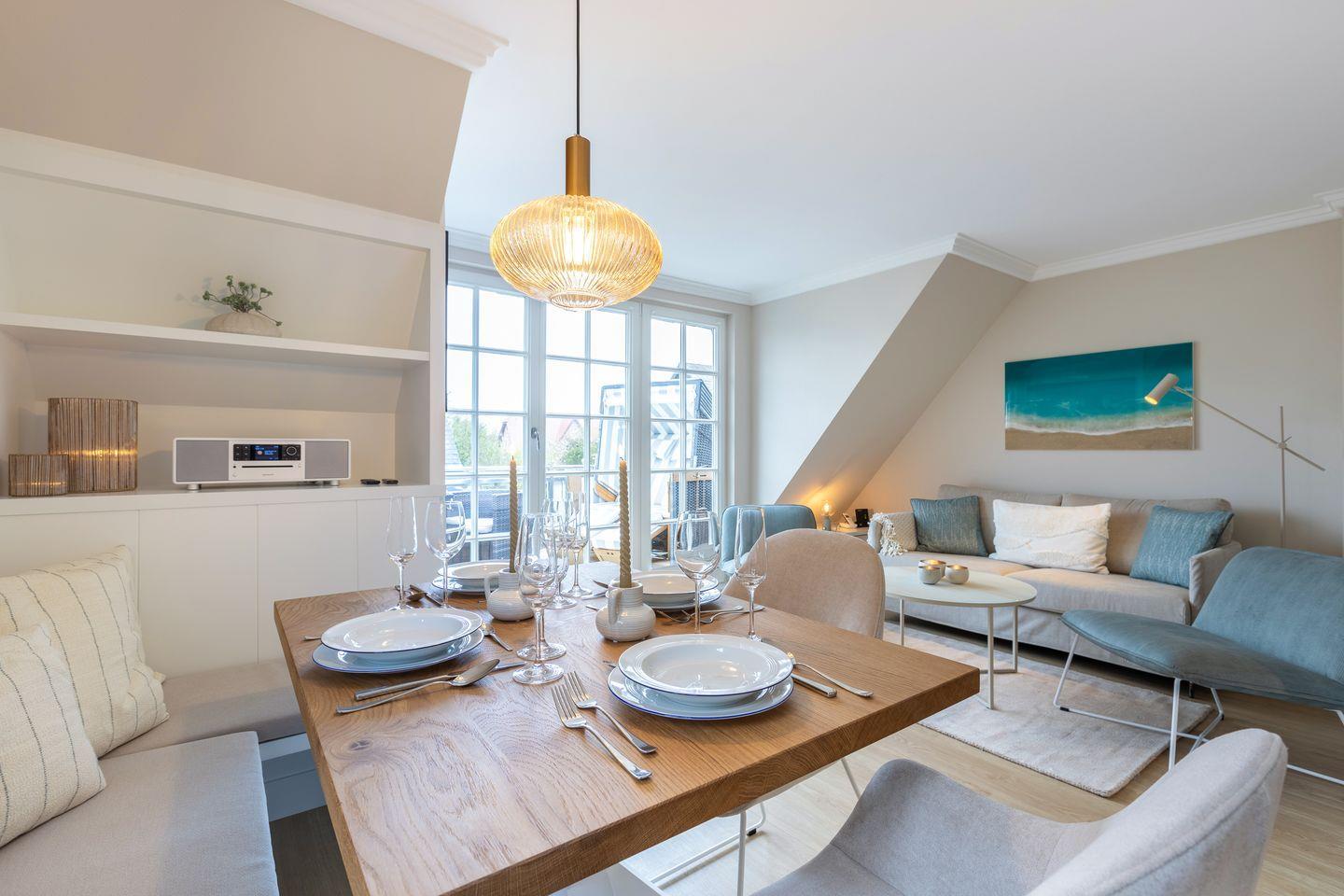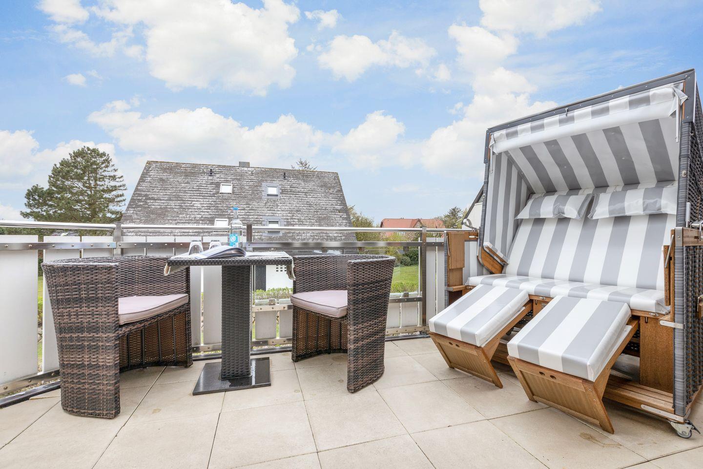 Obergeschoss: geschmackvoll möblierter Wohnraum mit korrespondierenden Farben und Stoffen. Kabel-Flatscreen TV, DVD-Player, Fax, Drucker/Scanner/Kopierer, DSL und Telefon. Luxuriöse integrierte Küche mit Geschirrspüler und Backofen. 1 Schlafraum mit kl. Doppelbett (140x200) und sehr schönen Einbauten. Wohlfühl-Bad mit großzügiger Dusche und WC. Sonniger West-Balkon mit Strandkorb (ca. von April - Oktober).