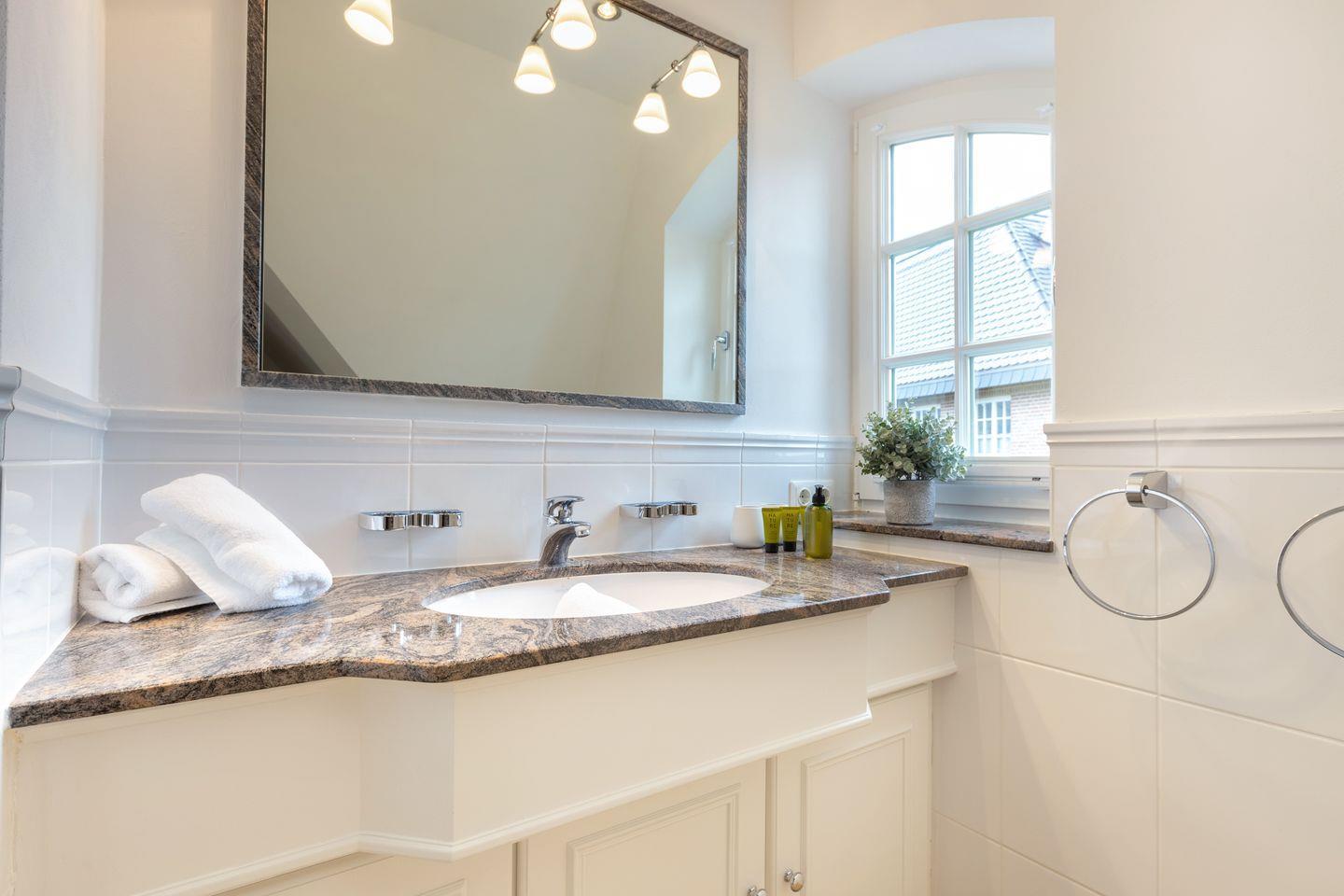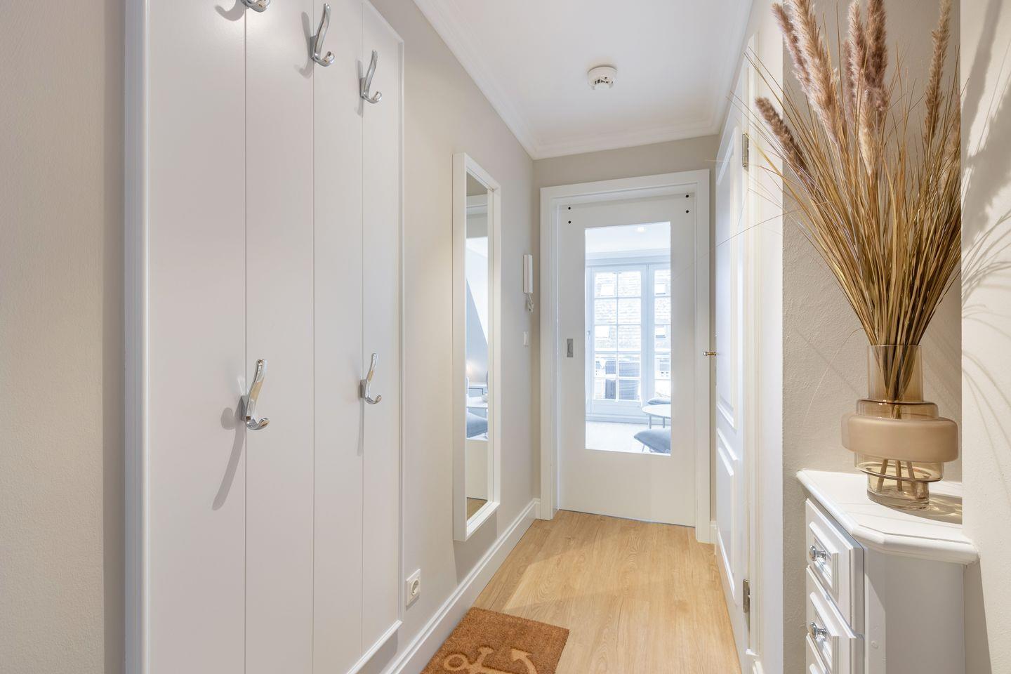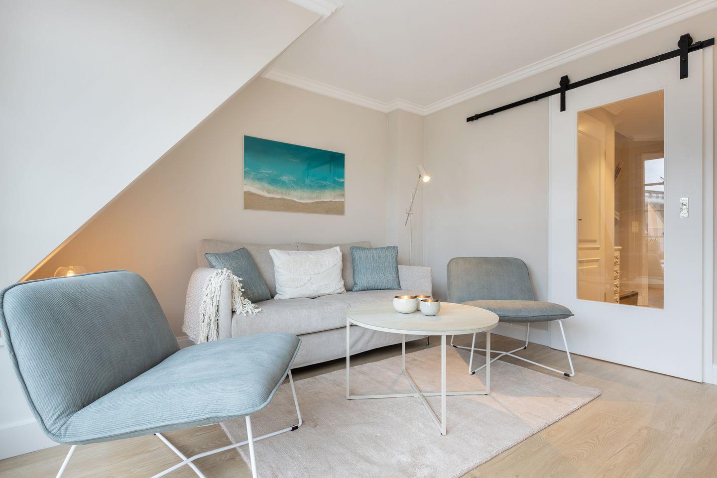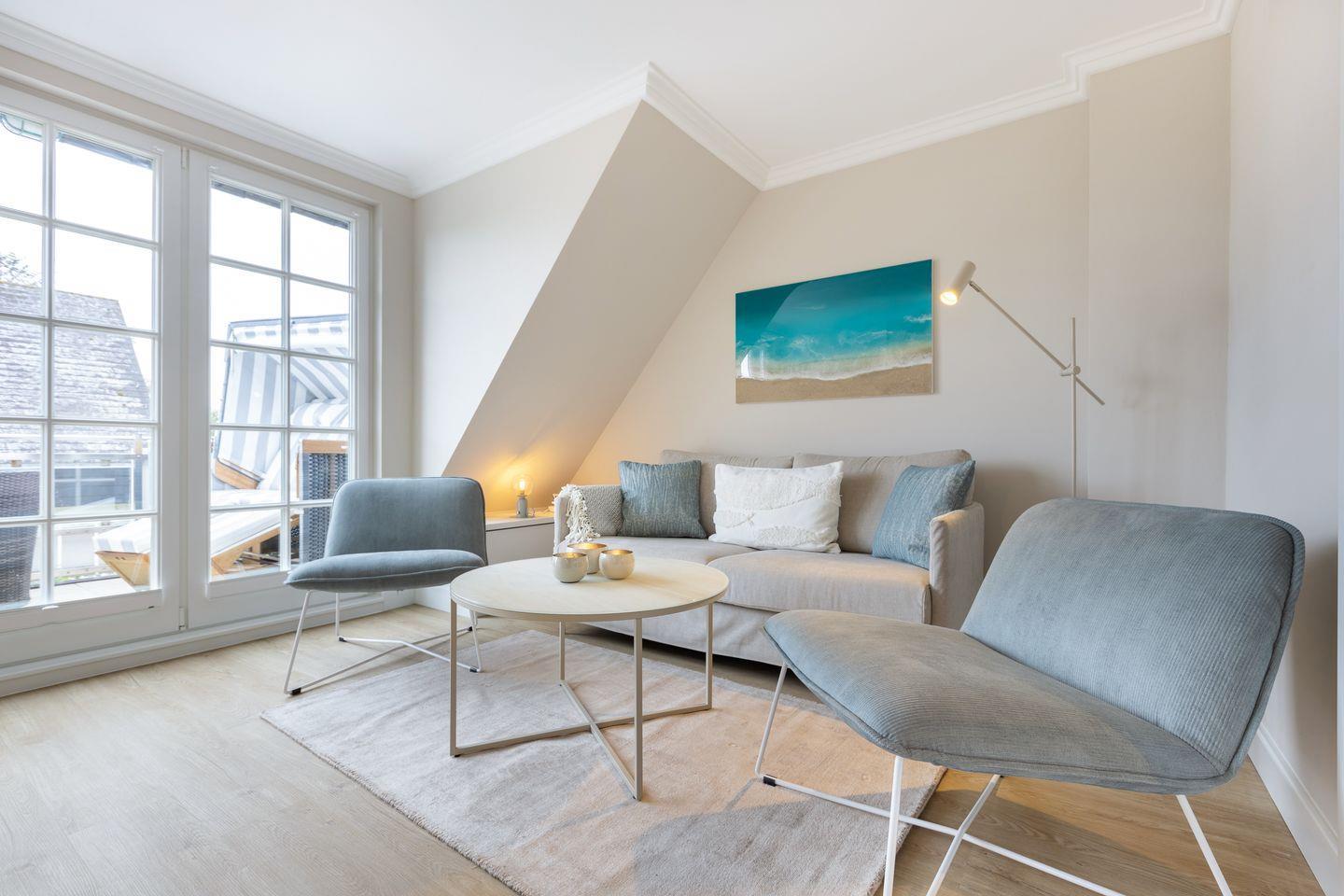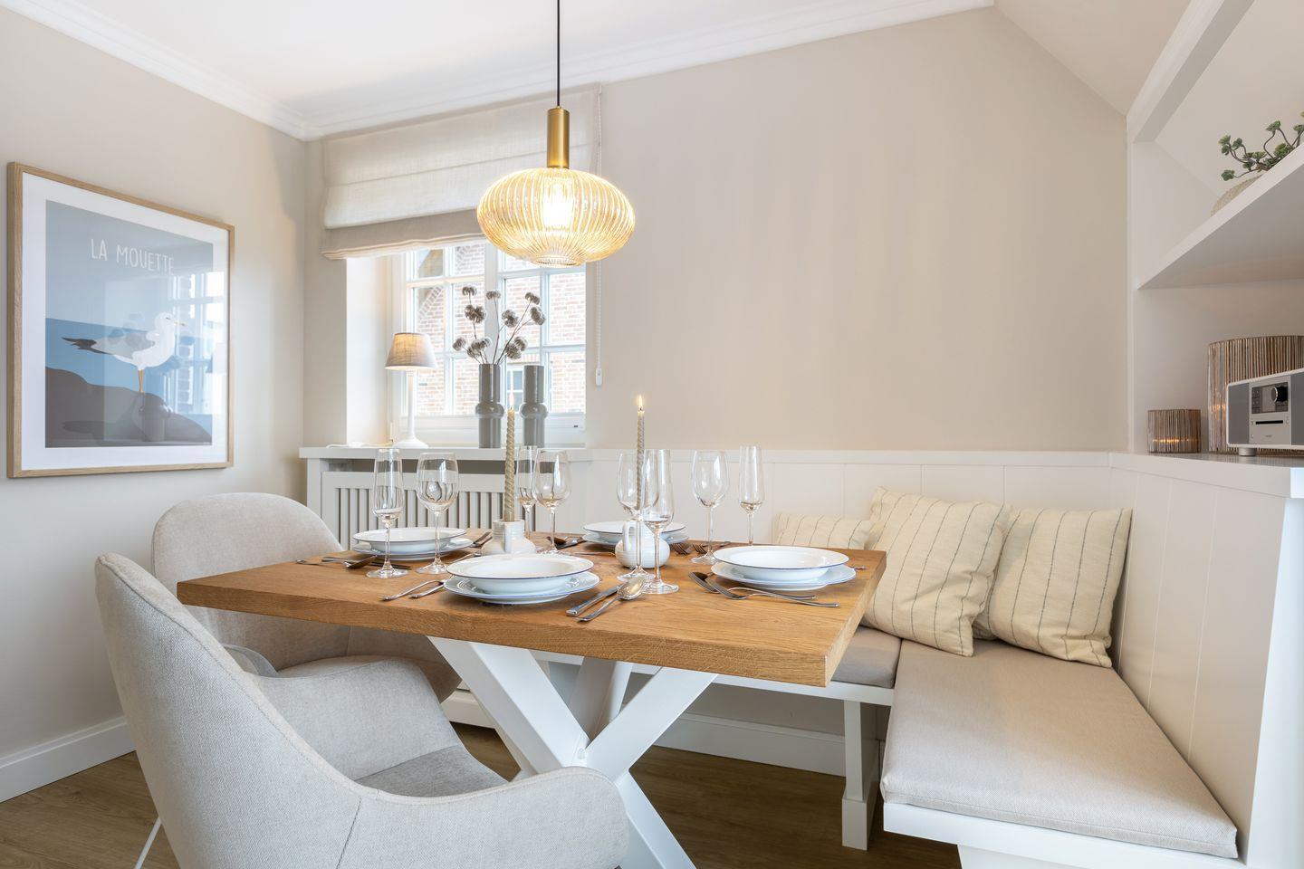 Obergeschoss: geschmackvoll möblierter Wohnraum mit korrespondierenden Farben und Stoffen. Kabel-Flatscreen TV, DVD-Player, Fax, Drucker/Scanner/Kopierer, DSL und Telefon. Luxuriöse integrierte Küche mit Geschirrspüler und Backofen. 1 Schlafraum mit kl. Doppelbett (140x200) und sehr schönen Einbauten. Wohlfühl-Bad mit großzügiger Dusche und WC. Sonniger West-Balkon mit Strandkorb (ca. von April - Oktober).