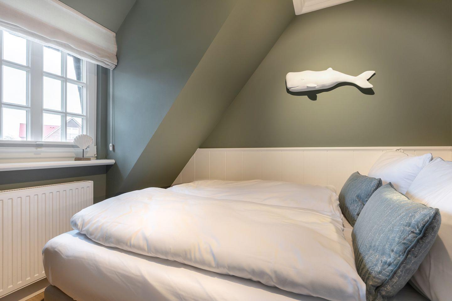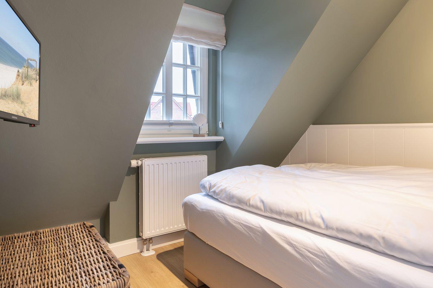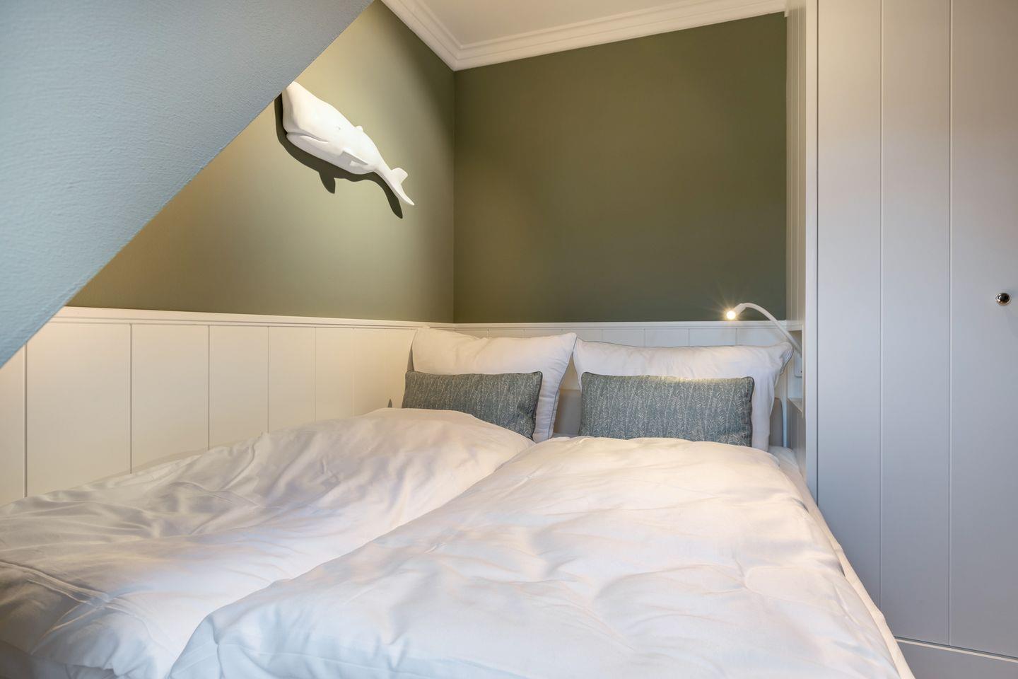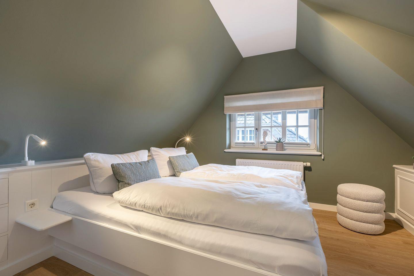Dachgeschoss: 1 Raum mit Doppelbett (180x200) und gekonnt designten Einbauten. Waschmaschine und Trockner.