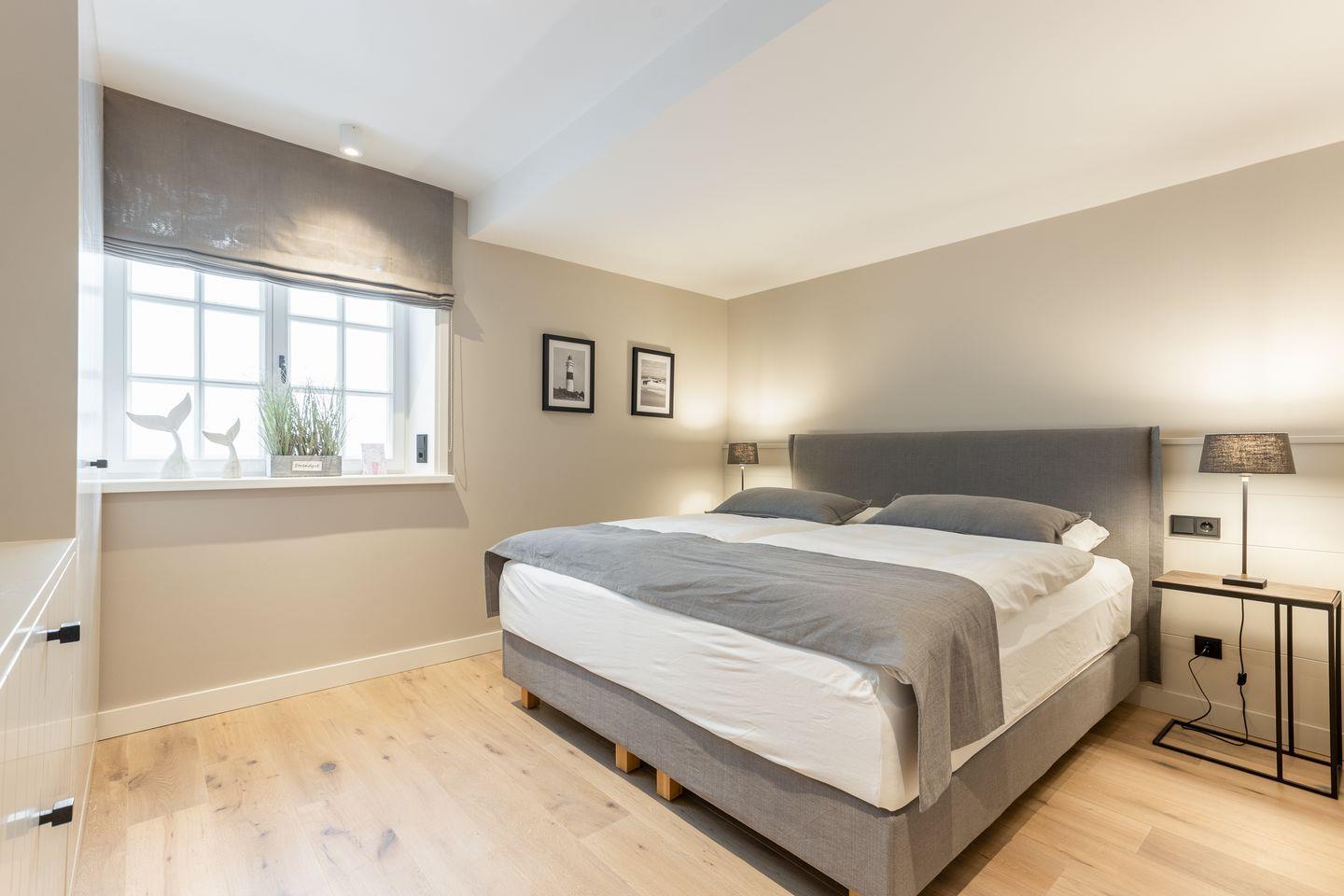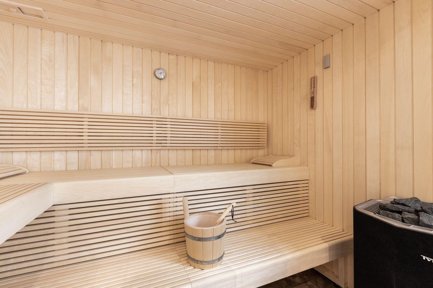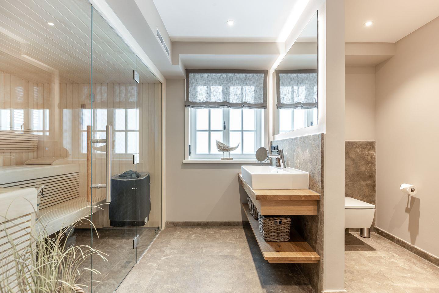 Im Obergeschoss des Hauses erwartet Sie ein Schlafzimmer mit Boxspring-Doppelbett und Flatscreen-TV sowie ein top-modernes Badezimmer mit Dusche und freistehender Badewanne, die zum Entspannen einlädt. Das Untergeschoss hält für Sie zwei weitere Räume mit je einem Boxspring-Doppelbett und Flatscreen-TV bereit. Eine weitere Besonderheit des Hauses ist das große Wellness-Badezimmer im Untergeschoss mit eigener Sauna, Regendusche und WC.