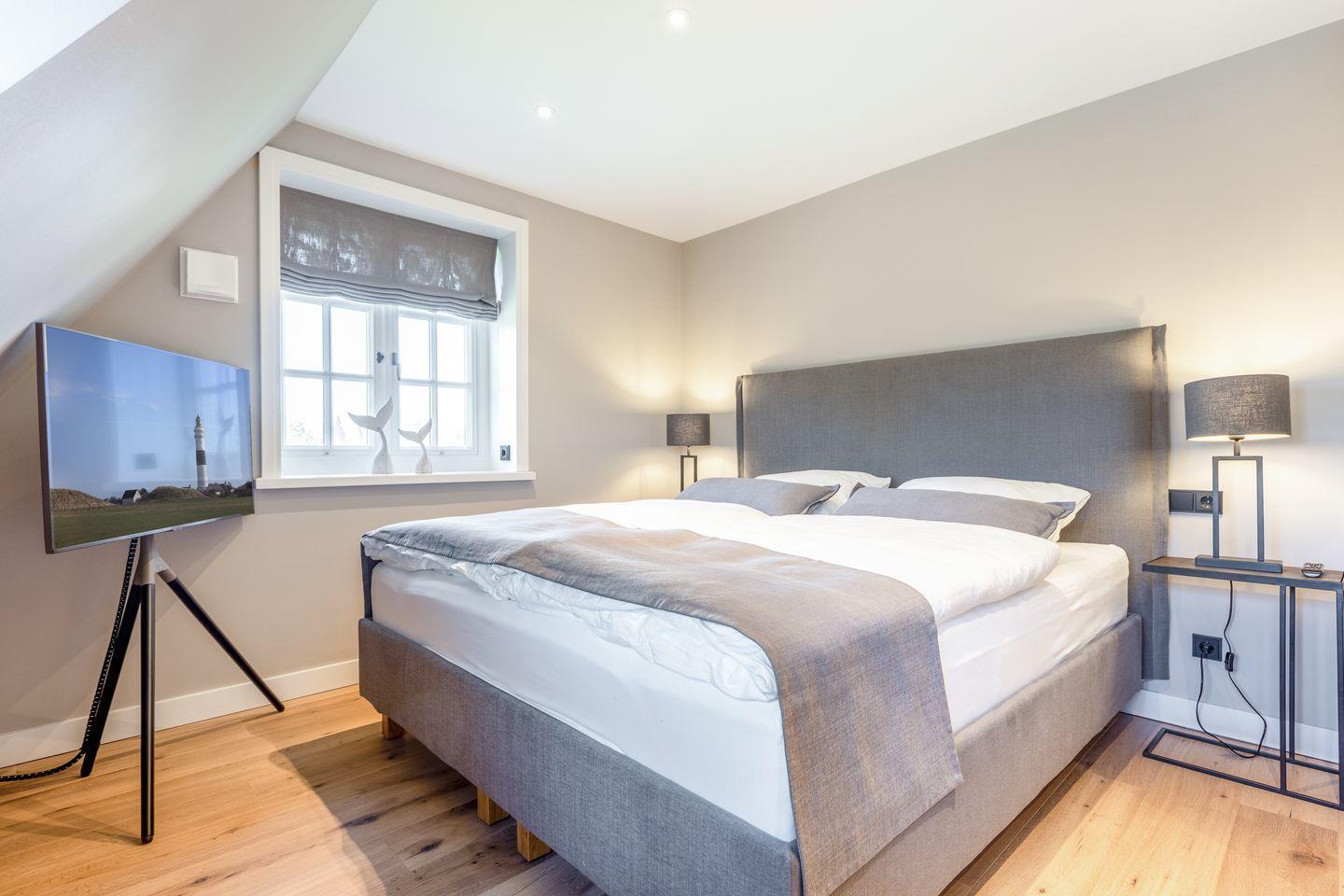 OG: ein Raum mit Doppelbett (180x200cm) und Flatscreen-TV, Badezimmer mit freistehender Badewanne, Dusche und WC