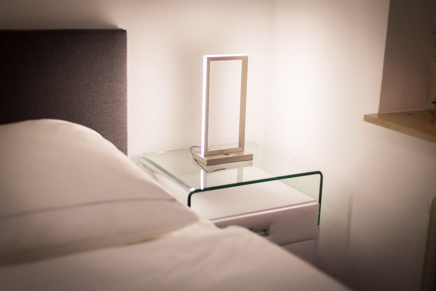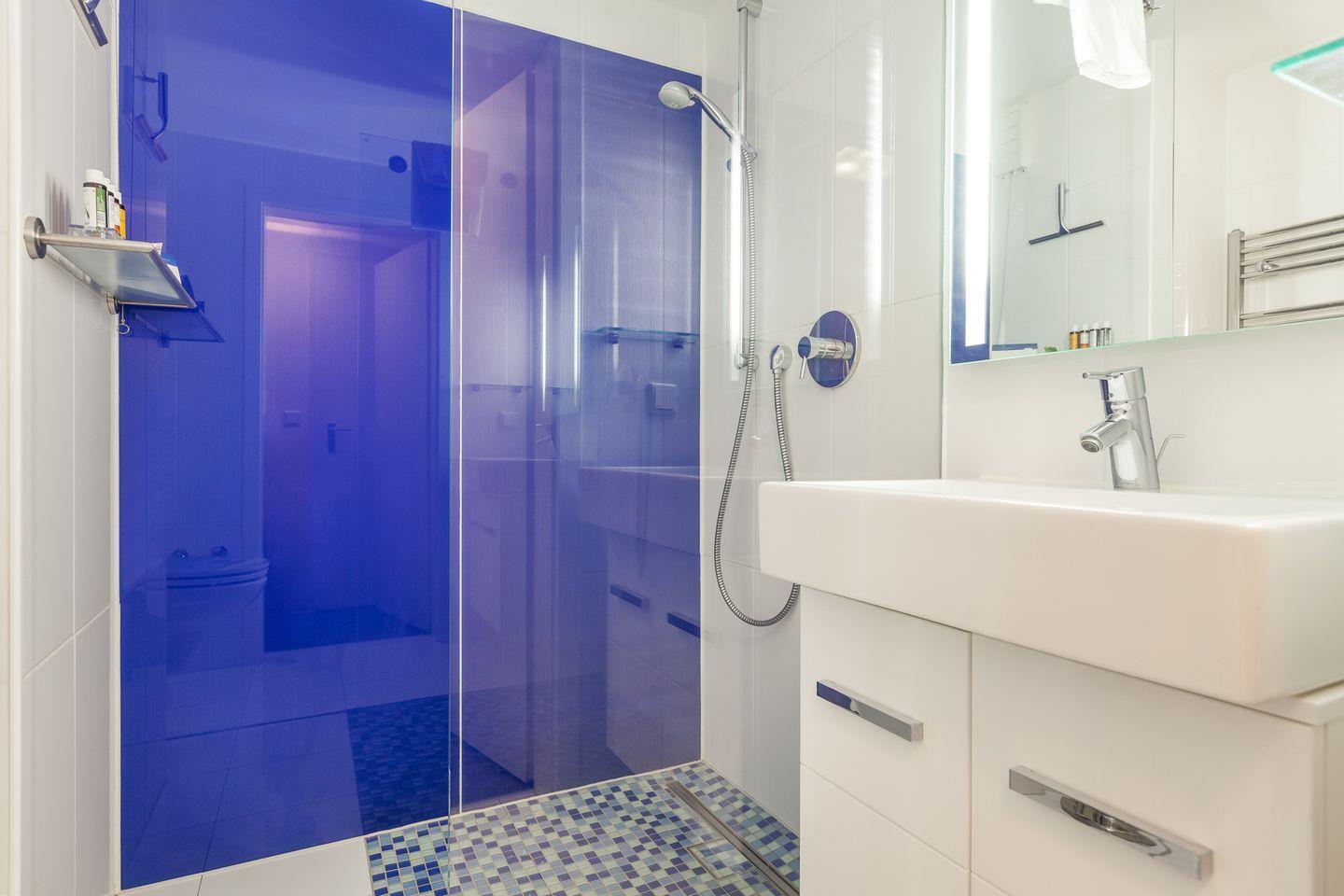 Im Untergeschoss der Wohnung finden Sie einen großen Raum mit Boxspringbett, viel Schrankplatz und einem 3D-Flatscreen TV. Auf gleicher Etage erwartet Sie ein Design-Badezimmer mit Dusche und WC.