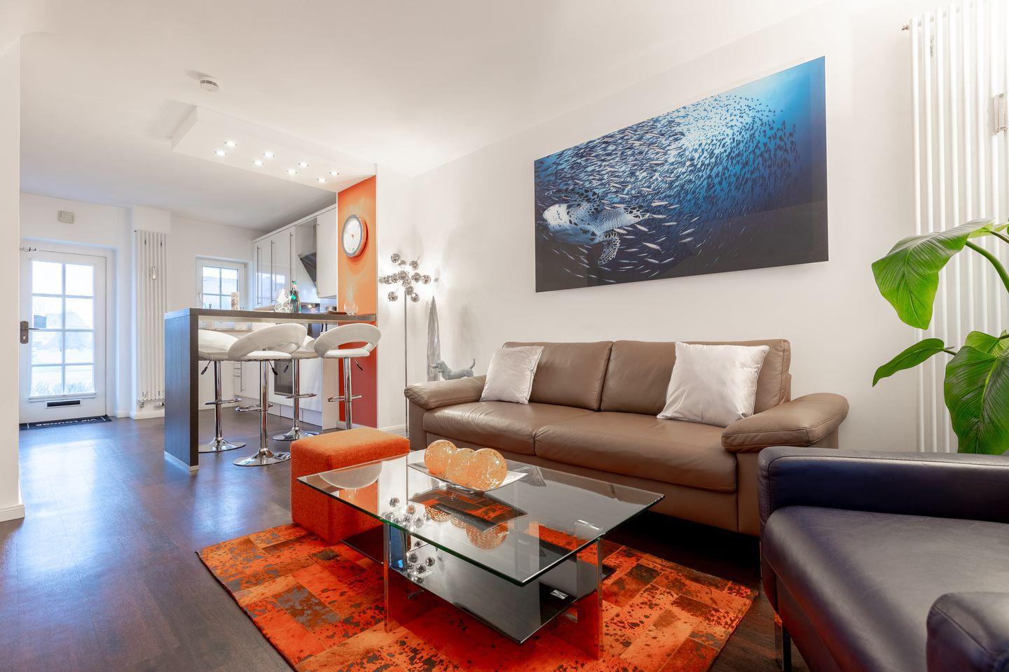EG: Wohnraum mit Rolf-Benz Couch-Ensemble, 3D-Flatscreen TV und 2 Blue-Ray-Playern, Internet-Radio, offene Küche mit Geschirrspülmaschine, Backofen, Ceranfeld,. Kaffeemaschine, Wasserkocher und Esstresen, sonnige, zum Süden ausgerichtete Terrasse mit Gartenmöbeln (ca. von April-Oktober)