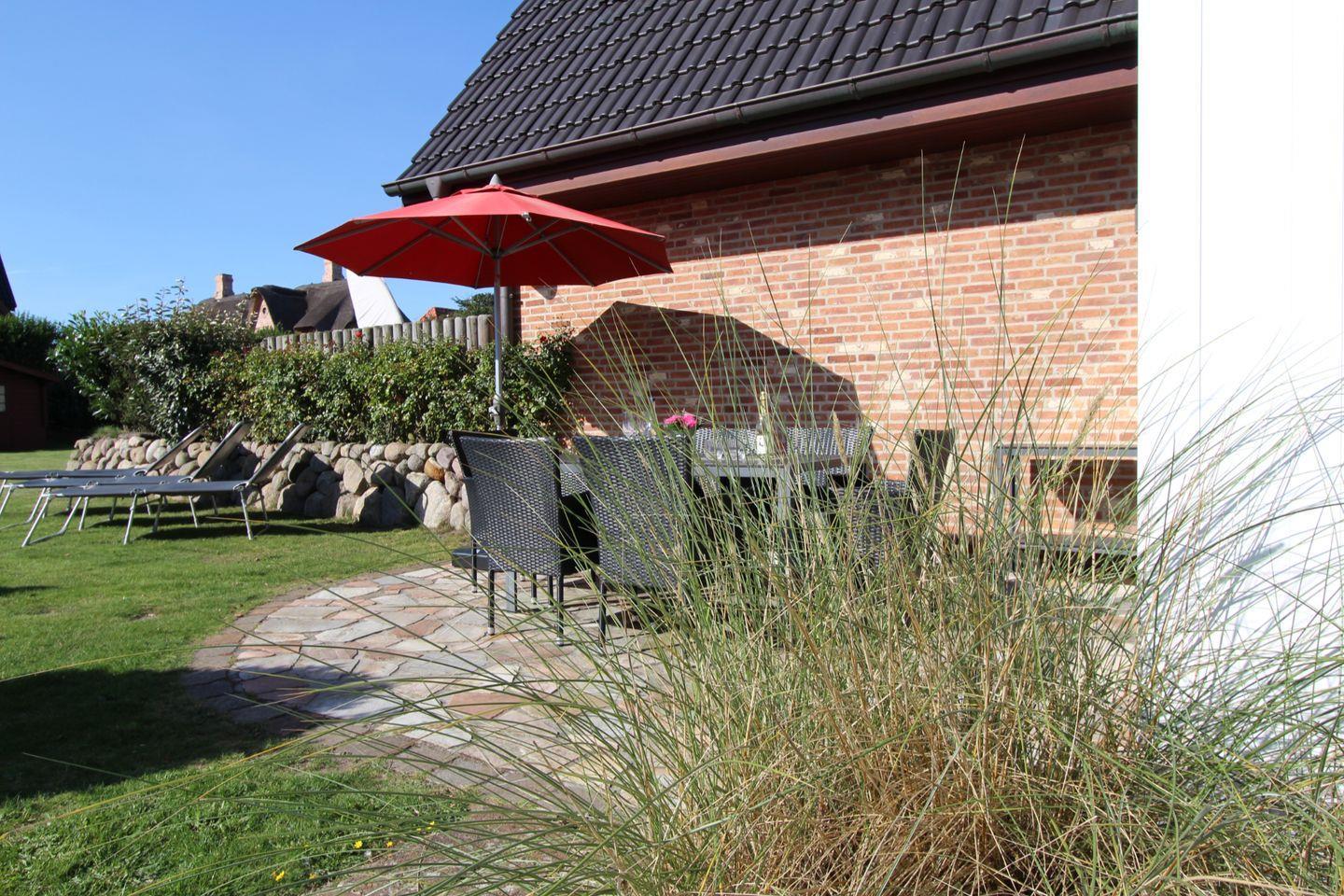 Vom Wohnbereich aus geht es in den Garten auf die Sonnenterrasse mit komfortablen Gartenmöbeln. Der Strandkorb lädt im schön angelegten Garten mit Süd-Lage zum Verweilen ein.
