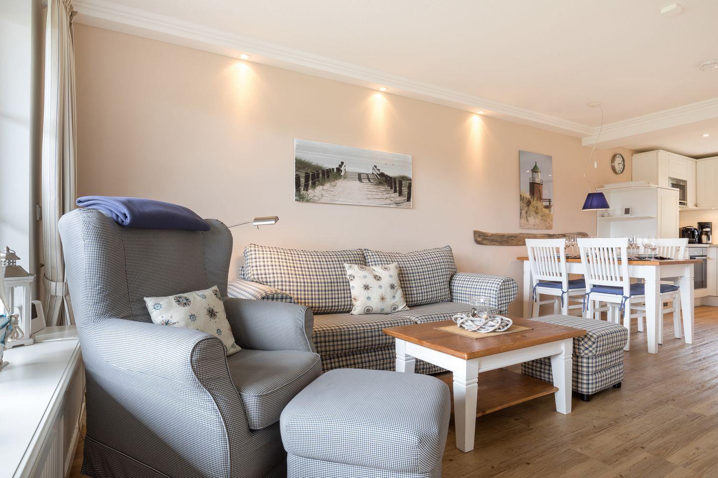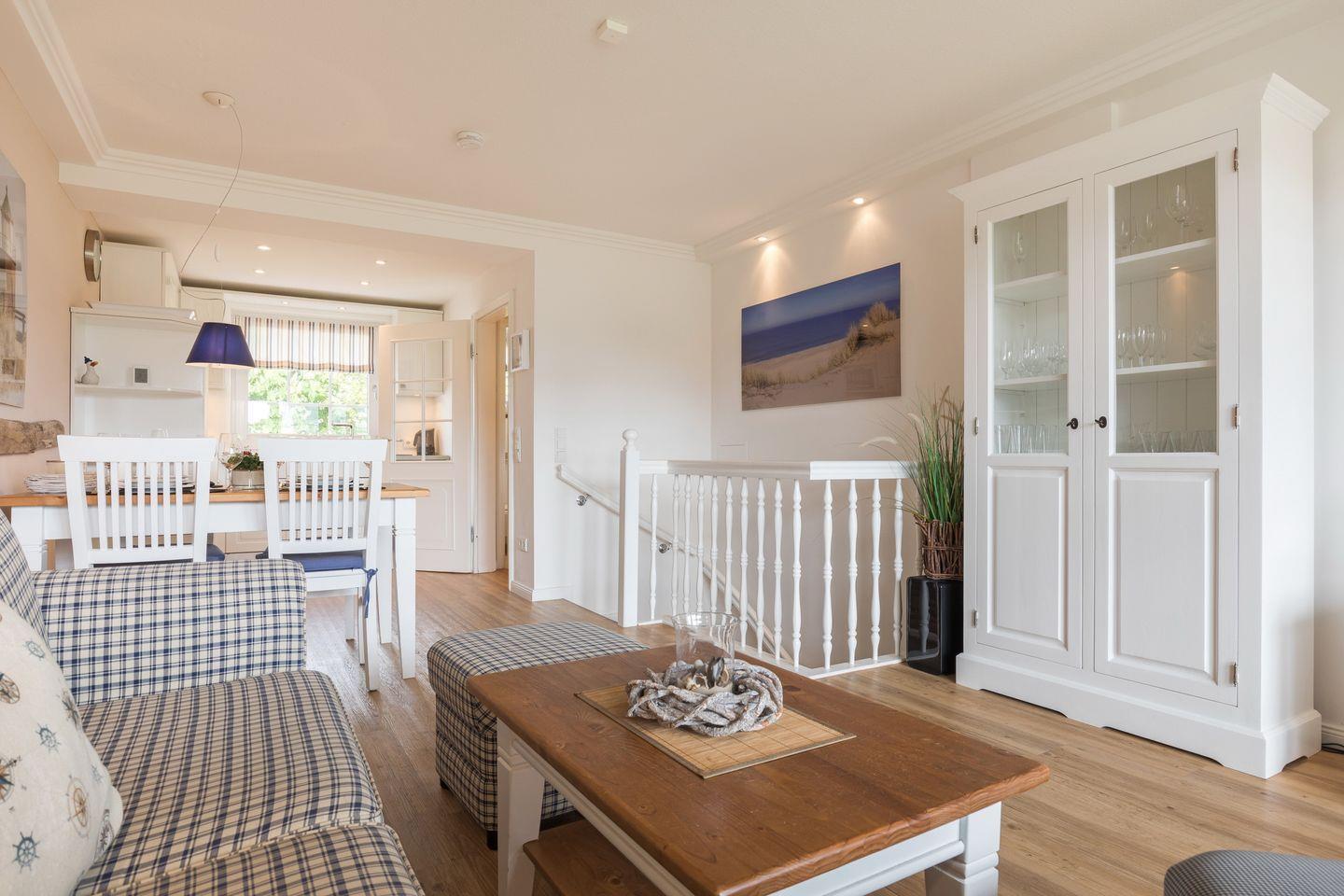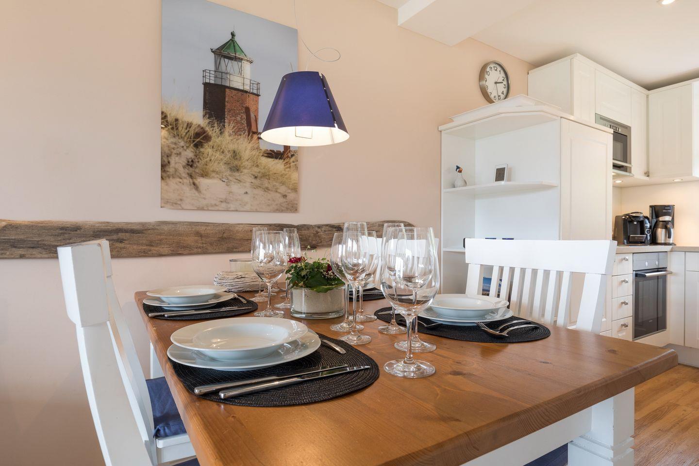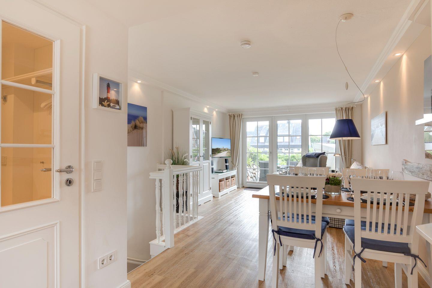 EG: Sehr schön gestalteter, lichtdurchfluteter Wohnraum mit gemütlicher Sitz- und Essecke. Charmante Bilder an den Wänden schaffen Sylt- und Urlaubsfeeling pur. Samsung Flat-TV und Bluetooth fähiges Internet Radio. WLAN mit Flatrate. Integrierte, hochwertige Küchenzeile mit Geschirrspüler, Mikrowelle und Backofen. Schöne, sonnige Südterrasse mit Gartenmöbeln und Strandkorb (ca. April-Oktober). Im Entrée Ihres Urlaubsdomizils empfangen Sie ebenfalls noch ein Gäste-WC sowie eine von Tischlerhand gefertigte kleine Diele.