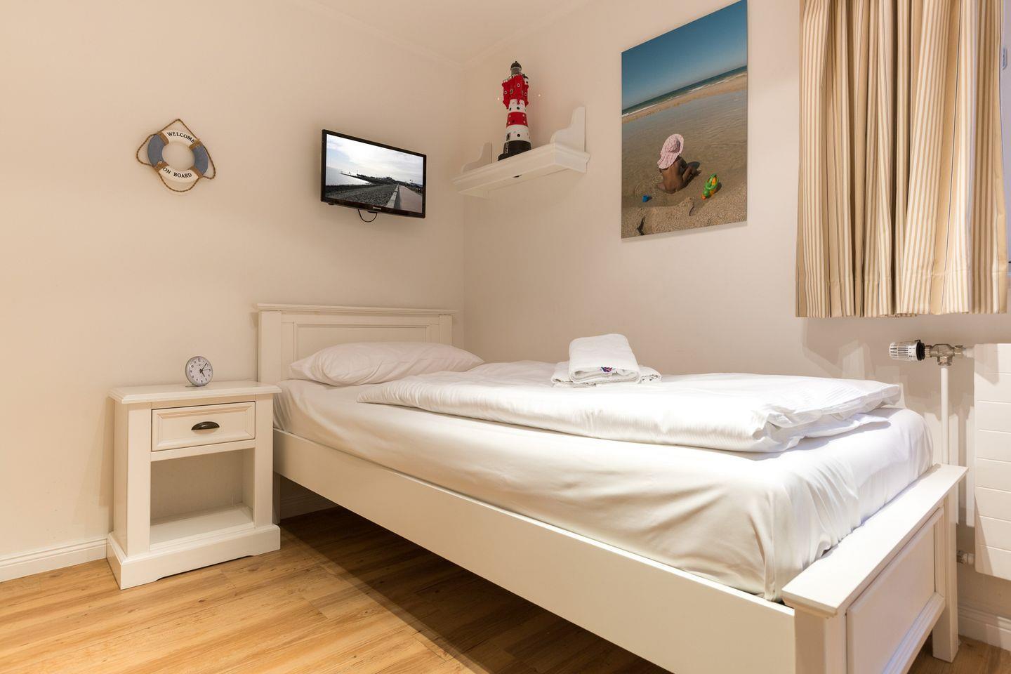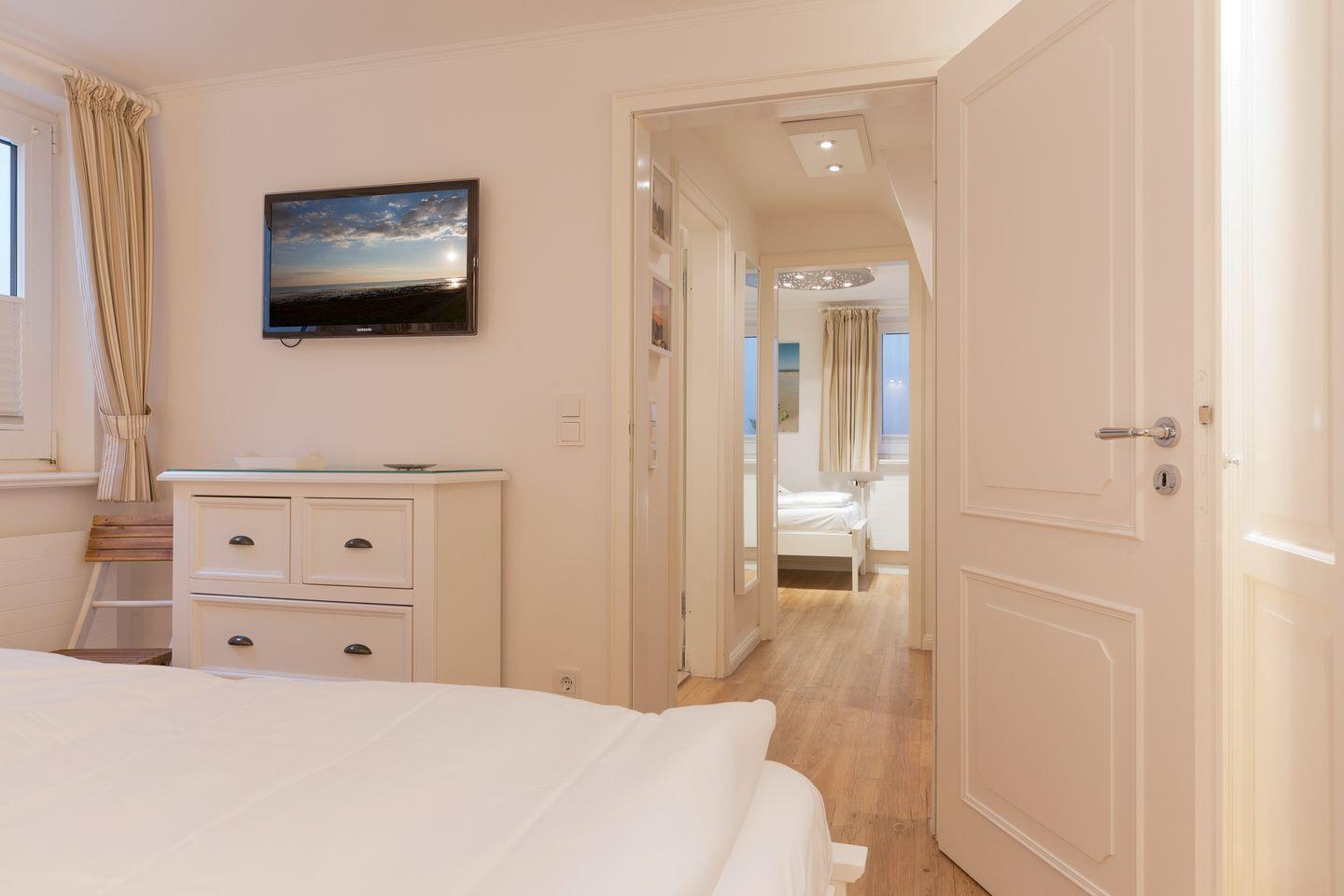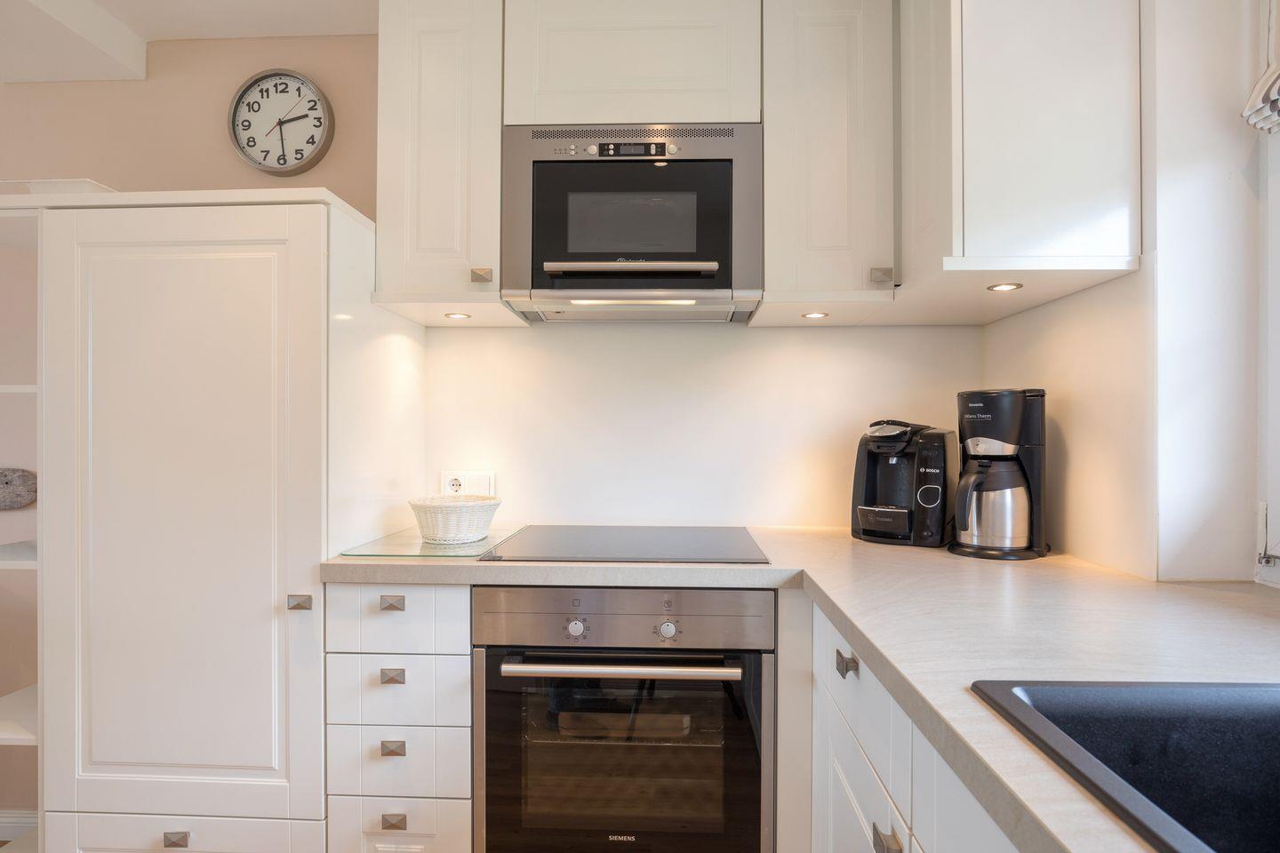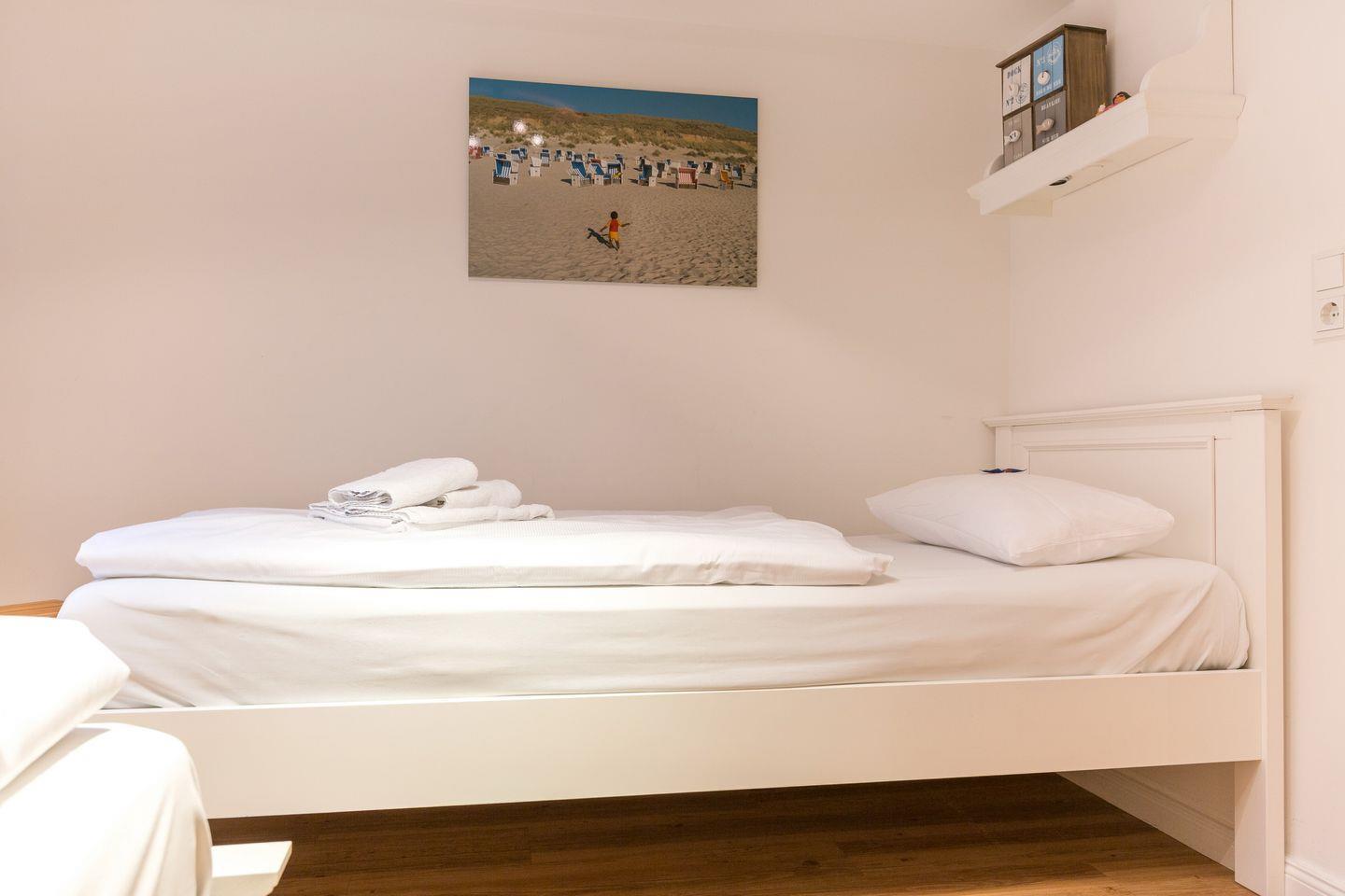 EG: Sehr schön gestalteter, lichtdurchfluteter Wohnraum mit gemütlicher Sitz- und Essecke. Charmante Bilder an den Wänden schaffen Sylt- und Urlaubsfeeling pur. Samsung Flat-TV und Bluetooth fähiges Internet Radio. WLAN mit Flatrate. Integrierte, hochwertige Küchenzeile mit Geschirrspüler, Mikrowelle und Backofen. Schöne, sonnige Südterrasse mit Gartenmöbeln und Strandkorb (ca. April-Oktober). Im Entrée Ihres Urlaubsdomizils empfangen Sie ebenfalls noch ein Gäste-WC sowie eine von Tischlerhand gefertigte kleine Diele.
