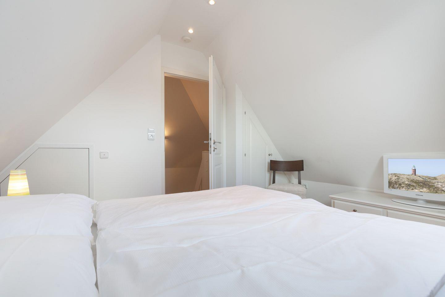 DG: ein heller Raum mit Luxus-Doppelbett (Marke "Treca", ca. 1,6x2m) und TV.