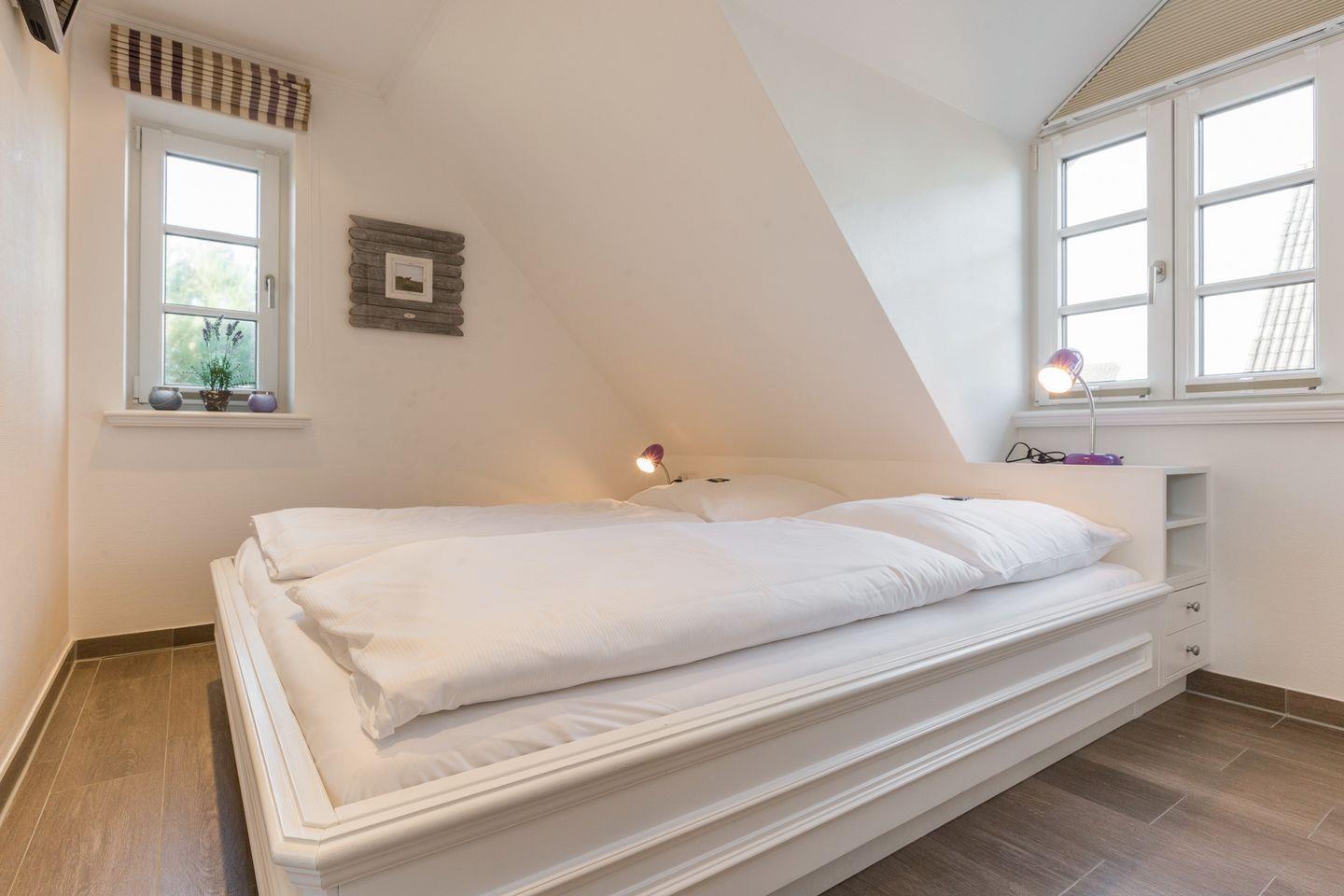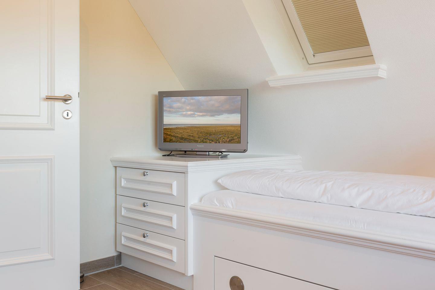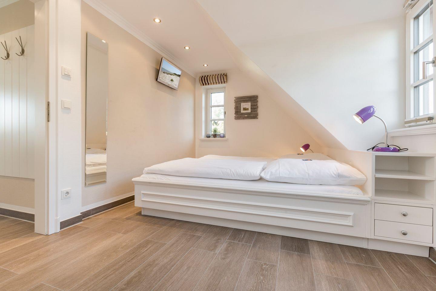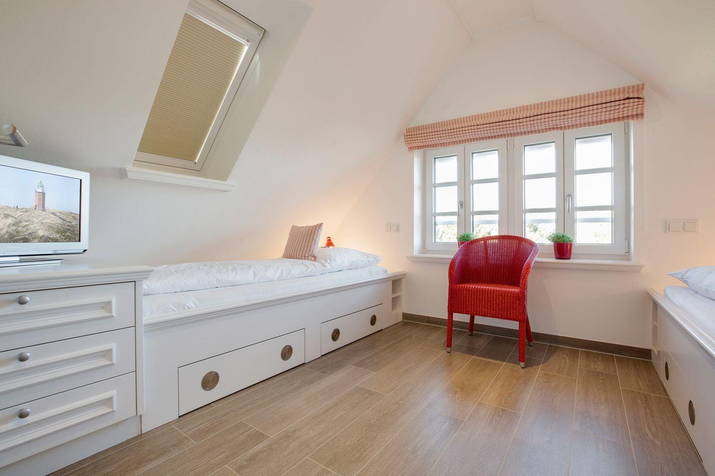 DG: im Dachgeschoss erwartet Sie eine weitere luftige Räumlichkeit mit zwei Einzelbetten (je ca. 2x0,9m) und Flat-TV. Freuen Sie sich auf Ihren kleinen Meerblick aus Ihrem Veluxfenster. Bad mit WC und Waschtisch.