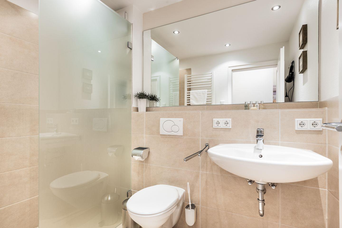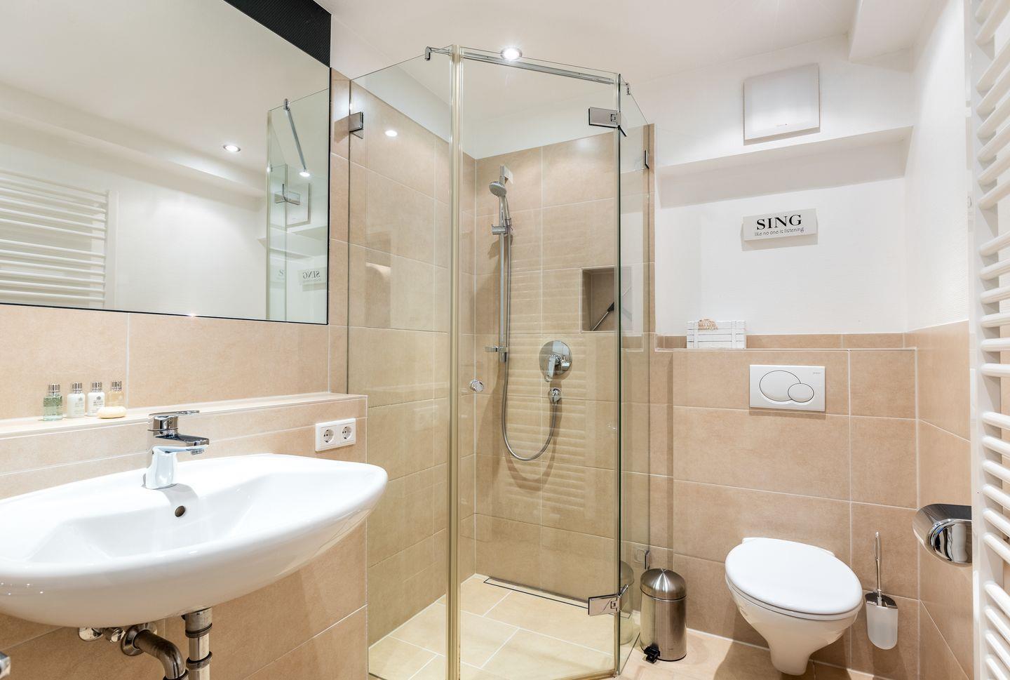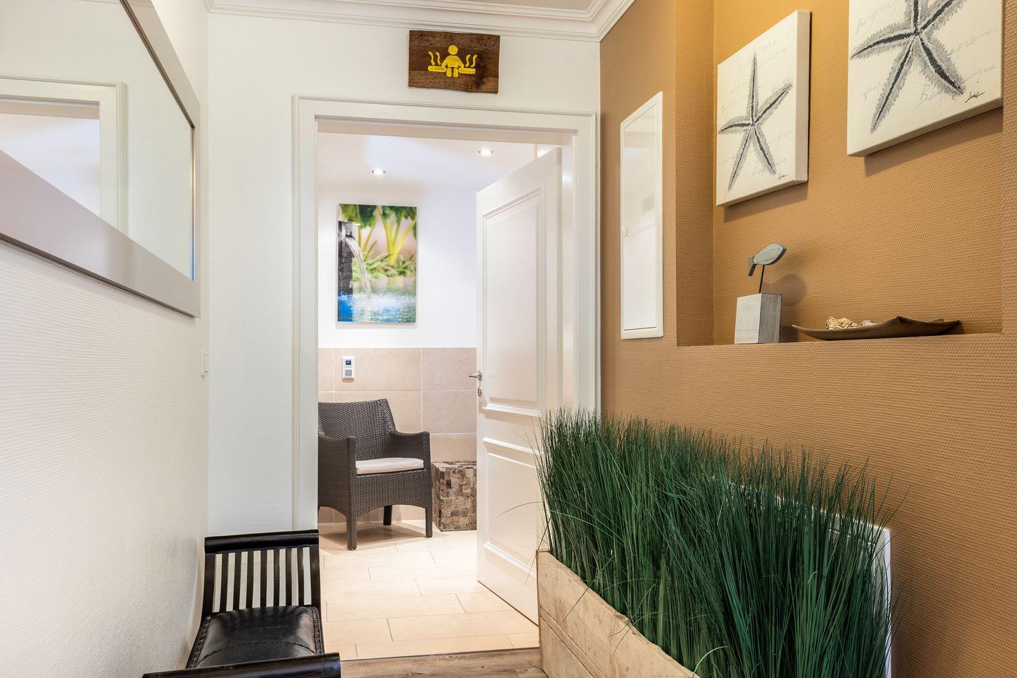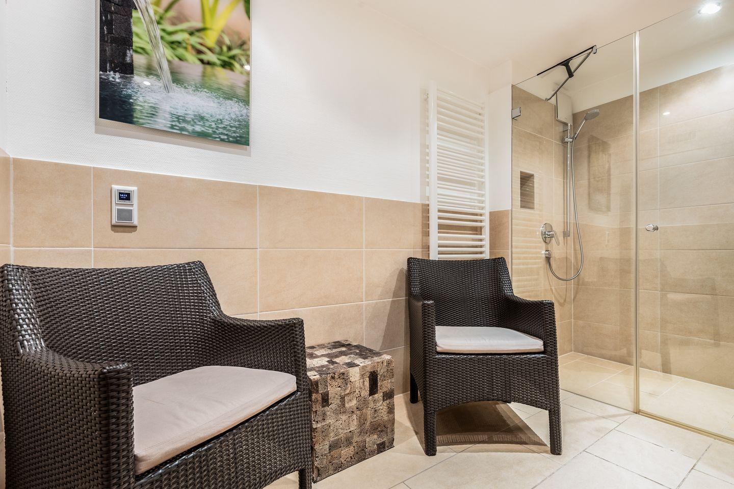 Und nicht, dass das bereits alles in Sachen Wellness wäre: als Highlight dürfen Sie sich ebenfalls noch auf einen Wellness-Saunabereich freuen. Eine kleine Ruhezone sowie eine XXL-Dusche, sogar mit Schwallfunktion ausgestattet, runden den Mini-Spa Bereich ab.