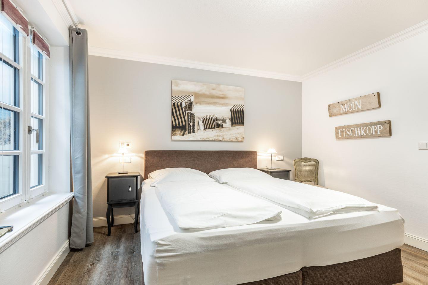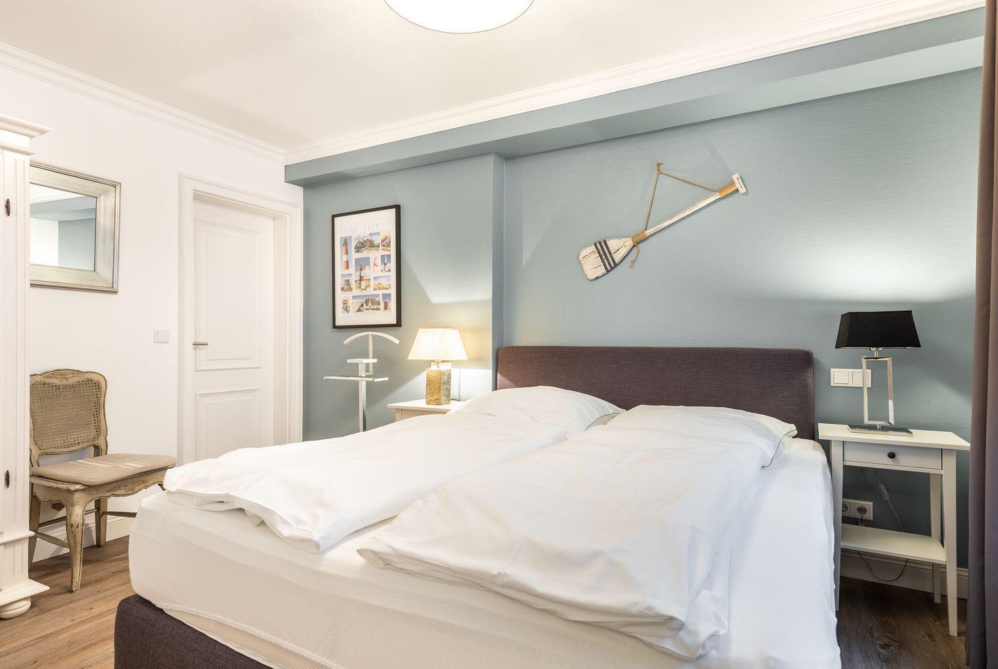 Ihre kleine, aber sehr feine und überkomplett ausgestattete Küche mit Geschirrspüler und Backofen lässt Herzen selbst ambitionierter Hobbyköche höher schlagen. Weiterhin finden Sie im Erdgeschoss ein sehr schön gestaltetes Schlafzimmer mit Doppelbett (1,8x2m), Wand-/Unterputzradio und Flat-TV. Ihr Wellness-En-Suite Bad mit XL-Dusche und WC lässt Sie beschwingt in den Tag kommen oder stilvoll Ihren Sylter Urlaubstag beschließen. Natürlich darf auch ein Gäste-WC im Entrée nicht fehlen.