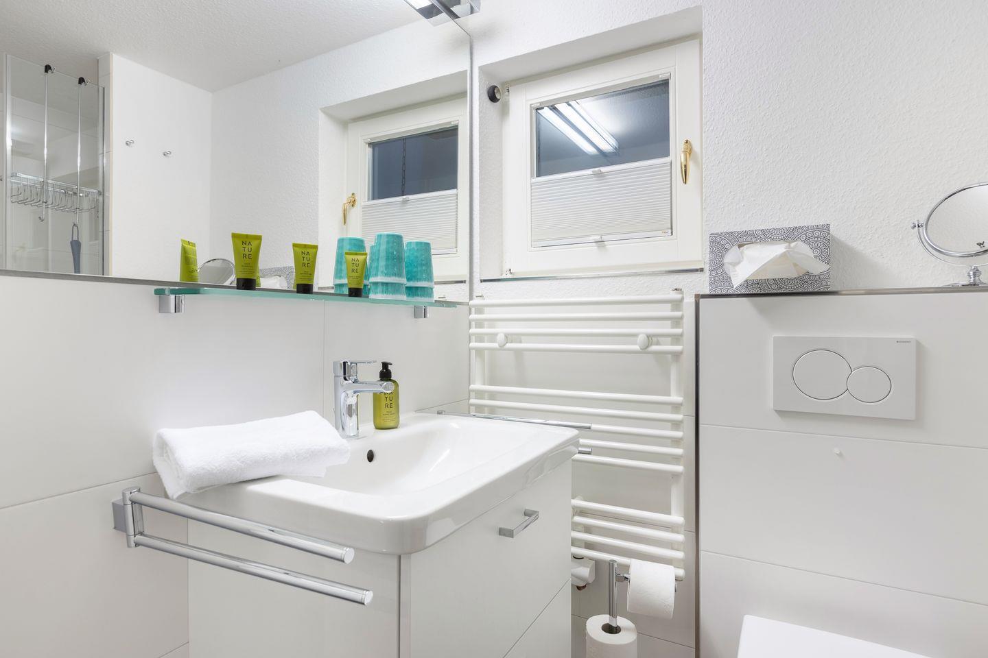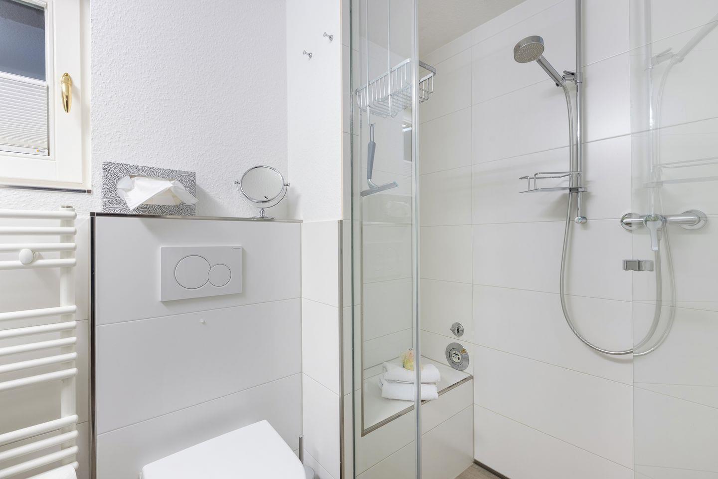 Vom Wohnzimmer führt eine Treppe in das Untergeschoss mit zwei Schlafzimmern (ein Raum mit Doppelbett (180x200cm), ein Raum mit zwei Einzelbetten (90x200cm) sowie einem Badezimmer mit Dusche, WC und Fenster.