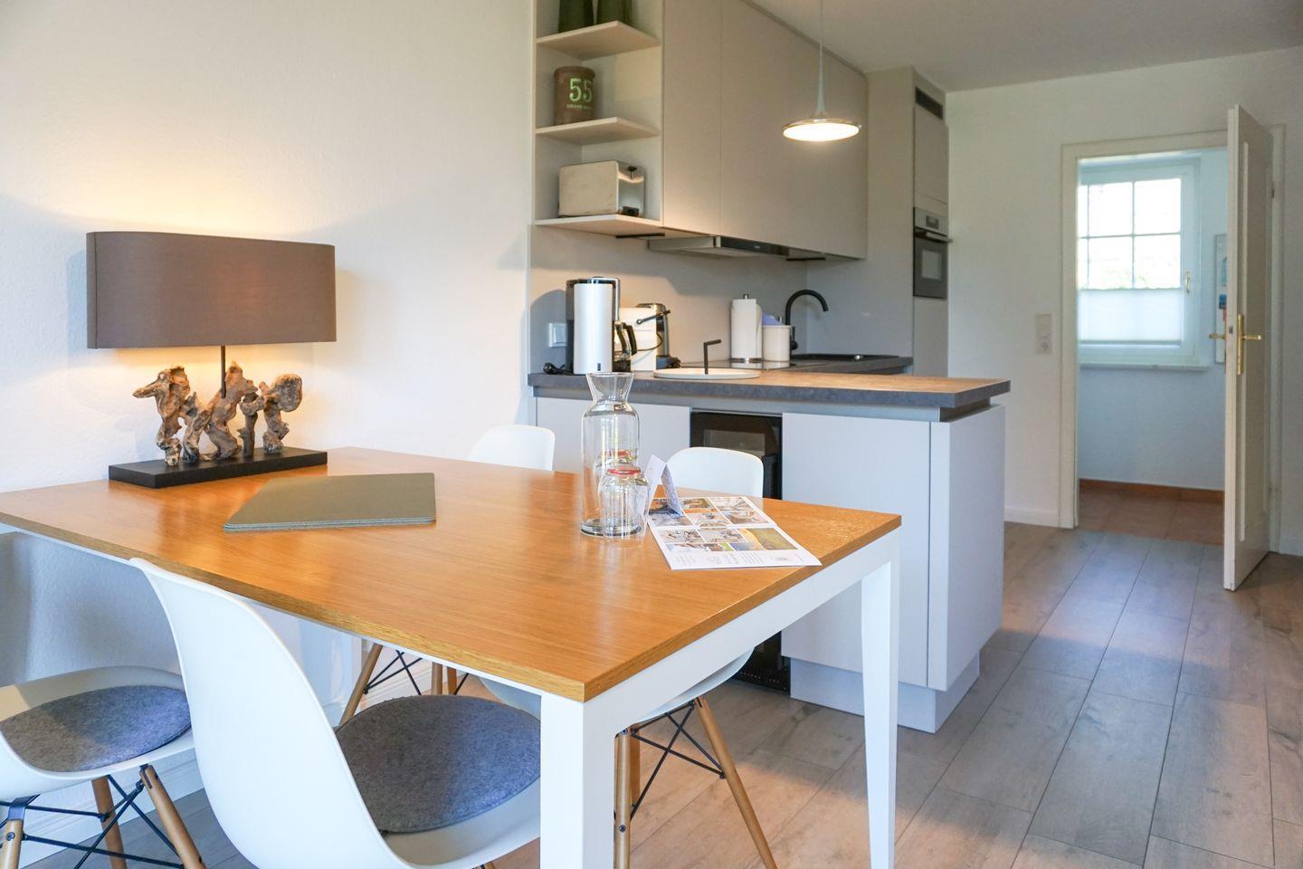 Von dort kommen Sie in die offene Küche (mit Mikrowelle-Backofen-Kombi, Weinkühlschrank, Geschirrspüler, Nespresso/Tchibo Kaffeemaschine) und das helle Wohnzimmer, wo die Sofaecke zum Entspannen einlädt. Die Westterrasse mit Strandkorb und Gartenmöbeln schließt sich direkt an (Gemeinschaftsgarten).