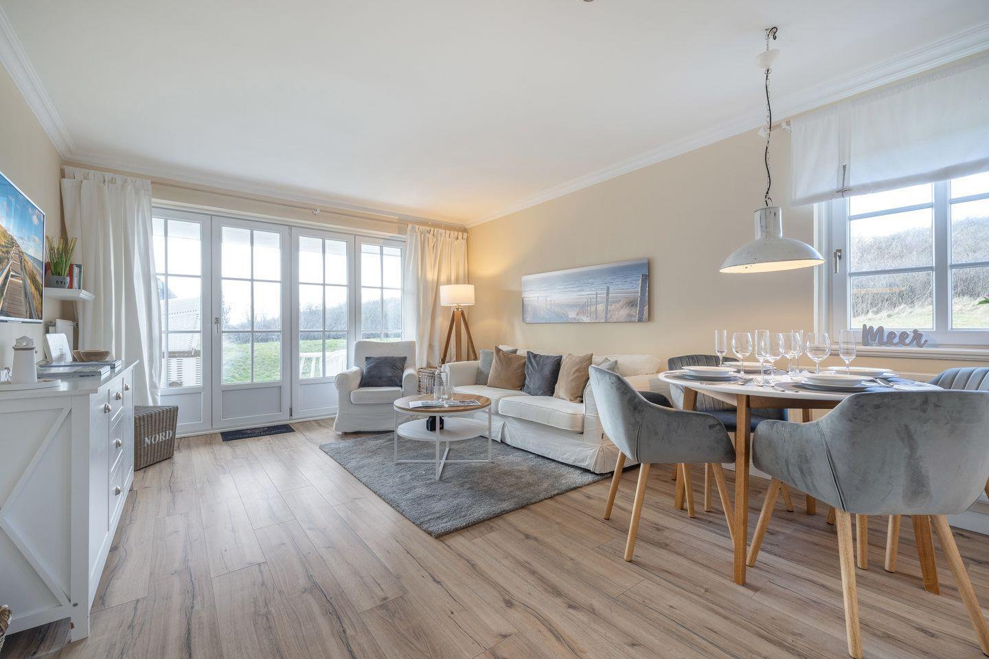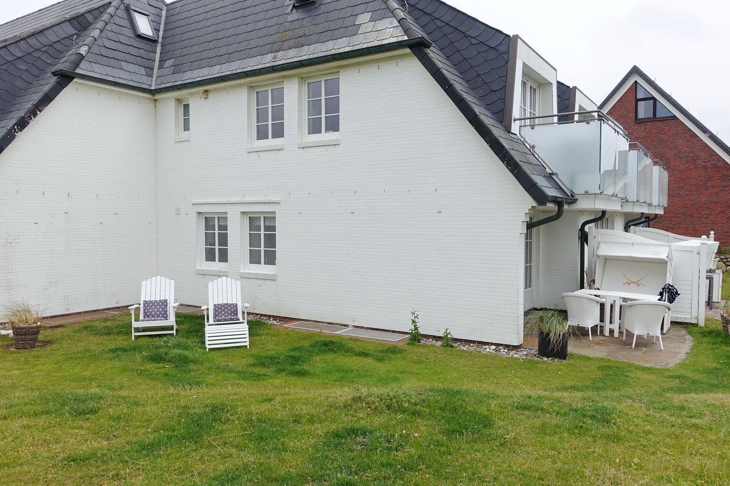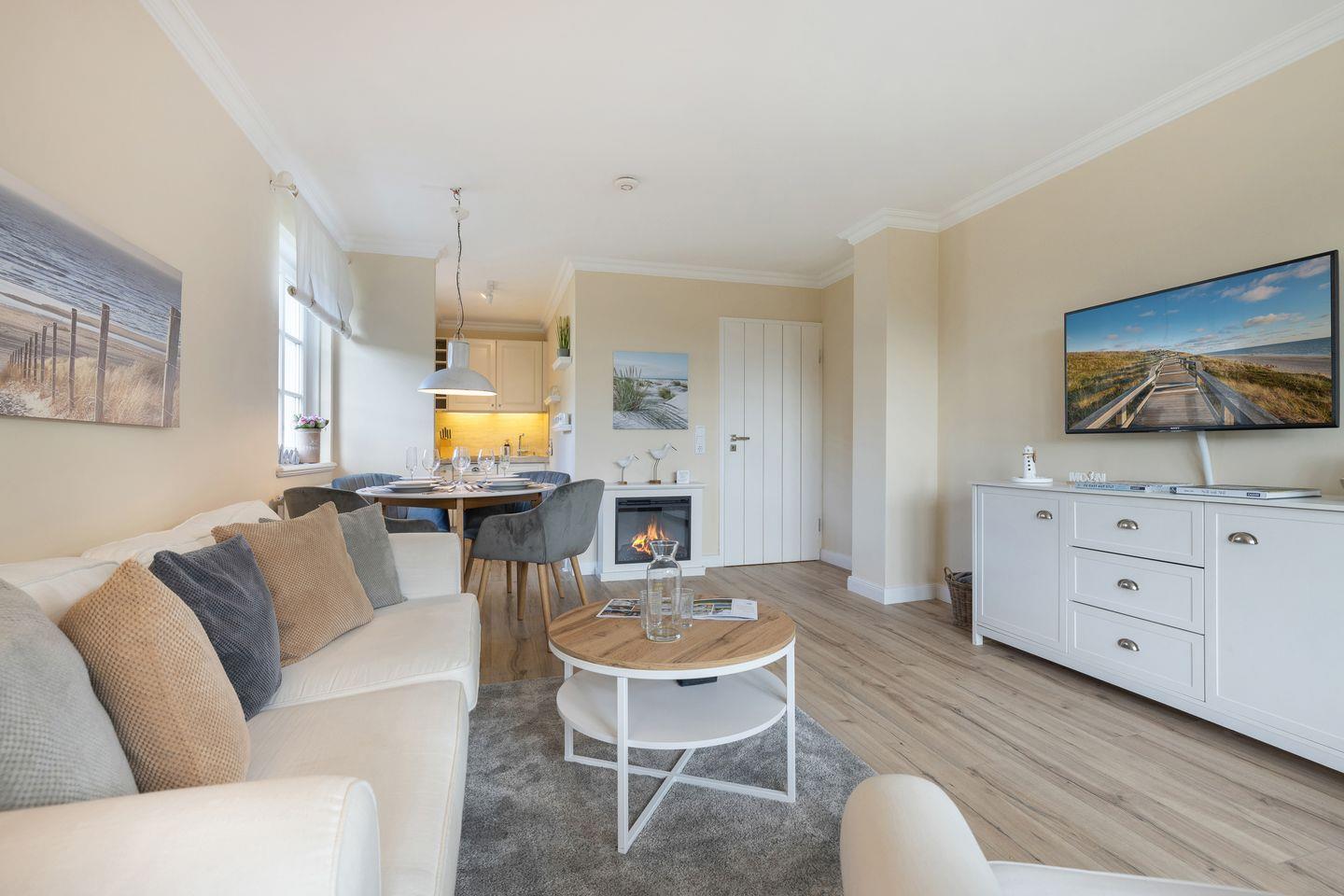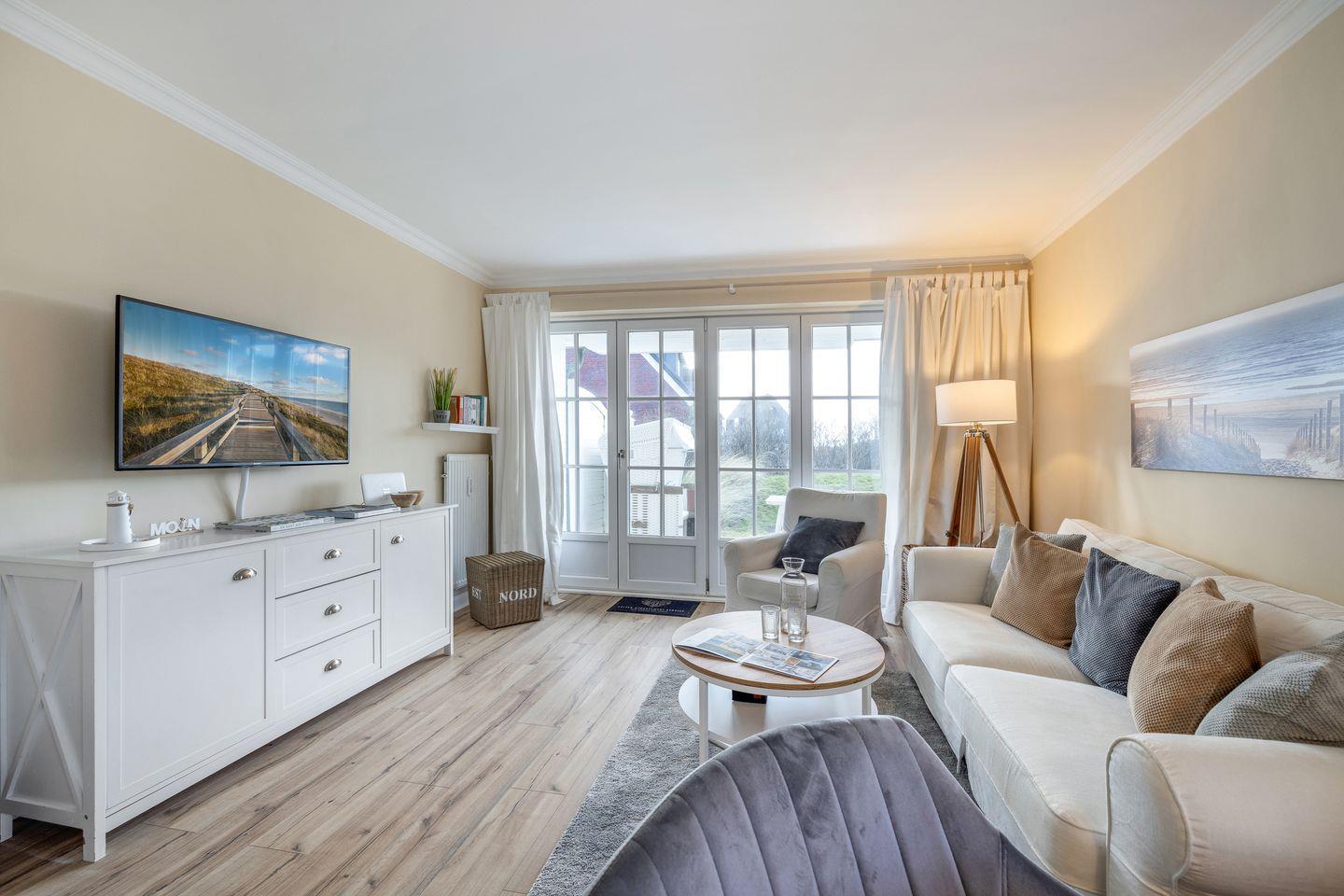 EG: Wohnraum mit Flatscreen-TV, BluRay Player, W-Lan und Elektrokamin, Essbereich, offene Küche mit Backofen-Microwellen-Kombi, Geschirrspüler, Induktionskochfeld, Filterkaffeemaschine, Cafissimo Espressomaschine, großer Garten nach hinten mit Terrasse zur Alleinnutzung, Adirondack Chairs mit Fußbank und XXL-Strandkorb von der Sansibar. Gäste-WC.