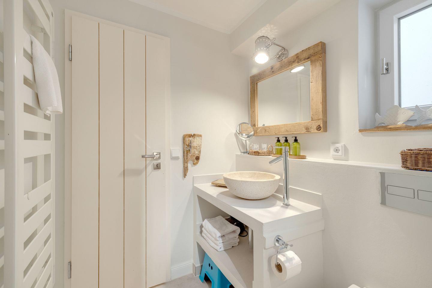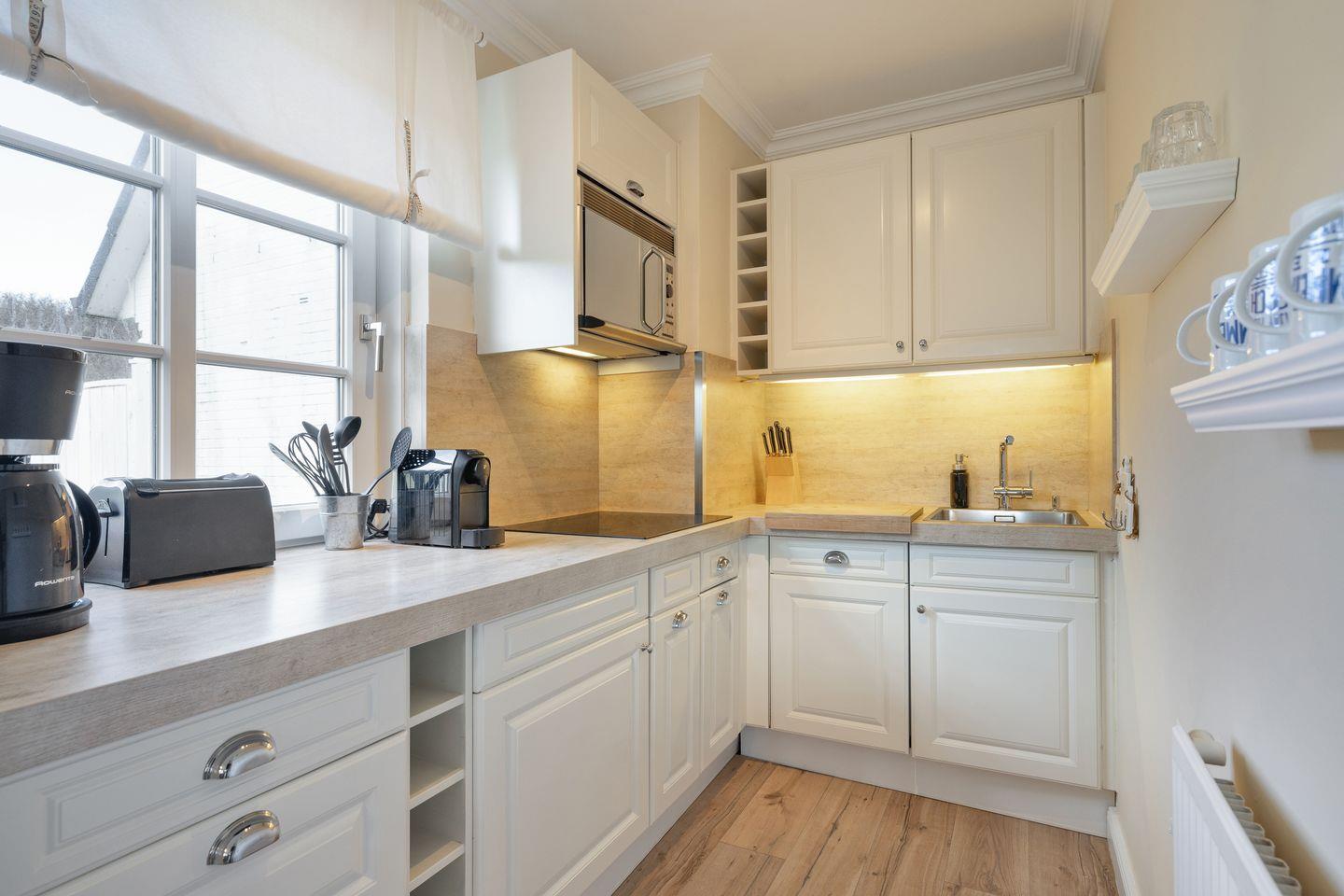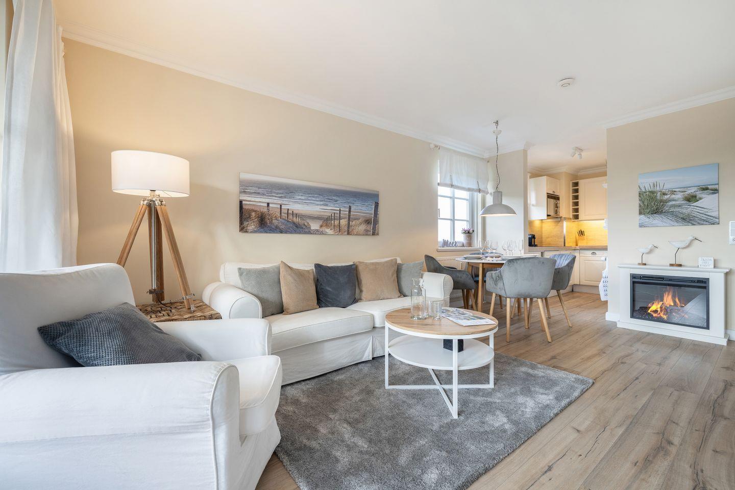 EG: Wohnraum mit Flatscreen-TV, BluRay Player, W-Lan und Elektrokamin, Essbereich, offene Küche mit Backofen-Microwellen-Kombi, Geschirrspüler, Induktionskochfeld, Filterkaffeemaschine, Cafissimo Espressomaschine, großer Garten nach hinten mit Terrasse zur Alleinnutzung, Adirondack Chairs mit Fußbank und XXL-Strandkorb von der Sansibar. Gäste-WC.