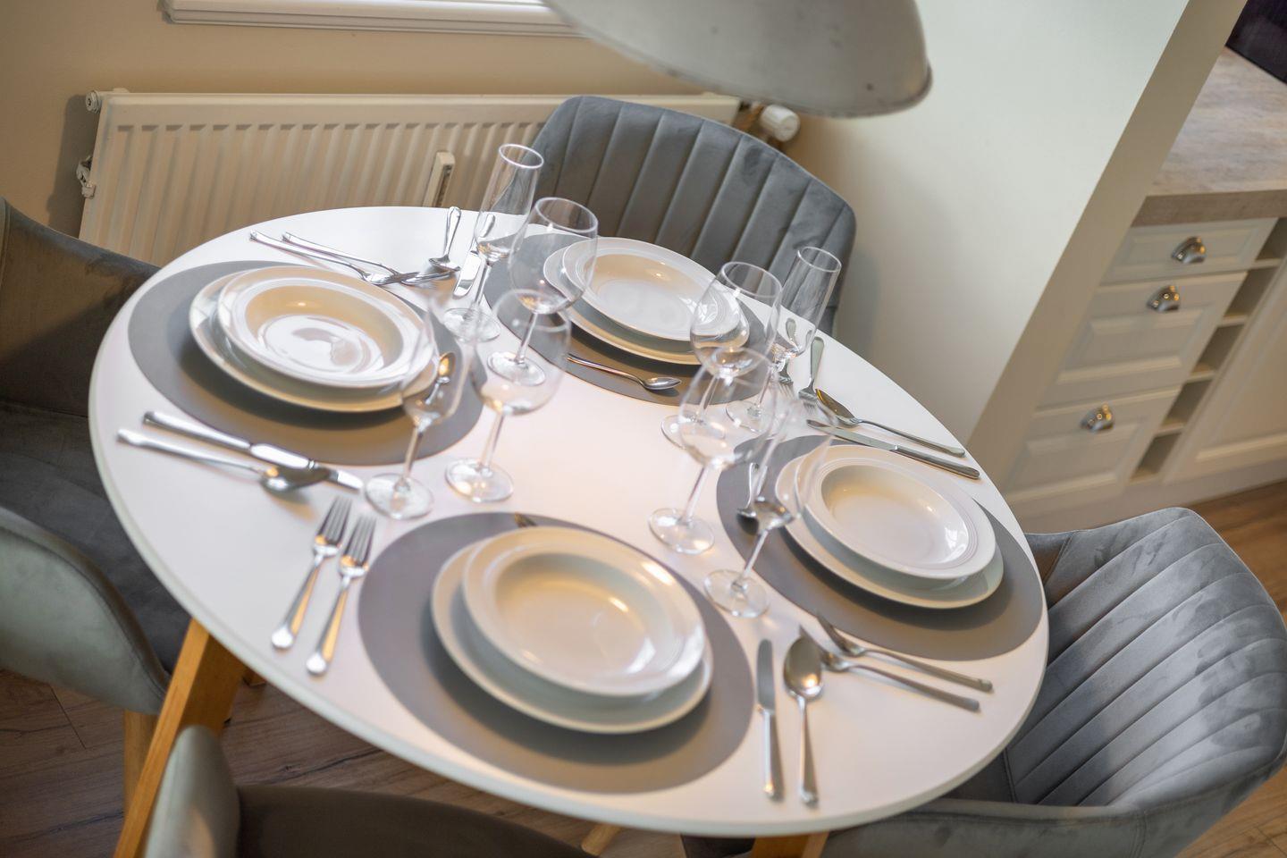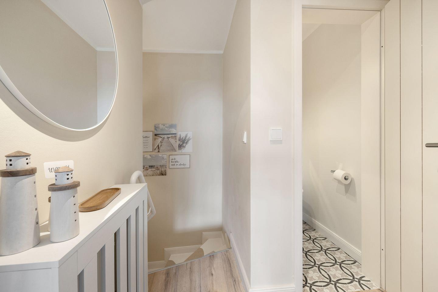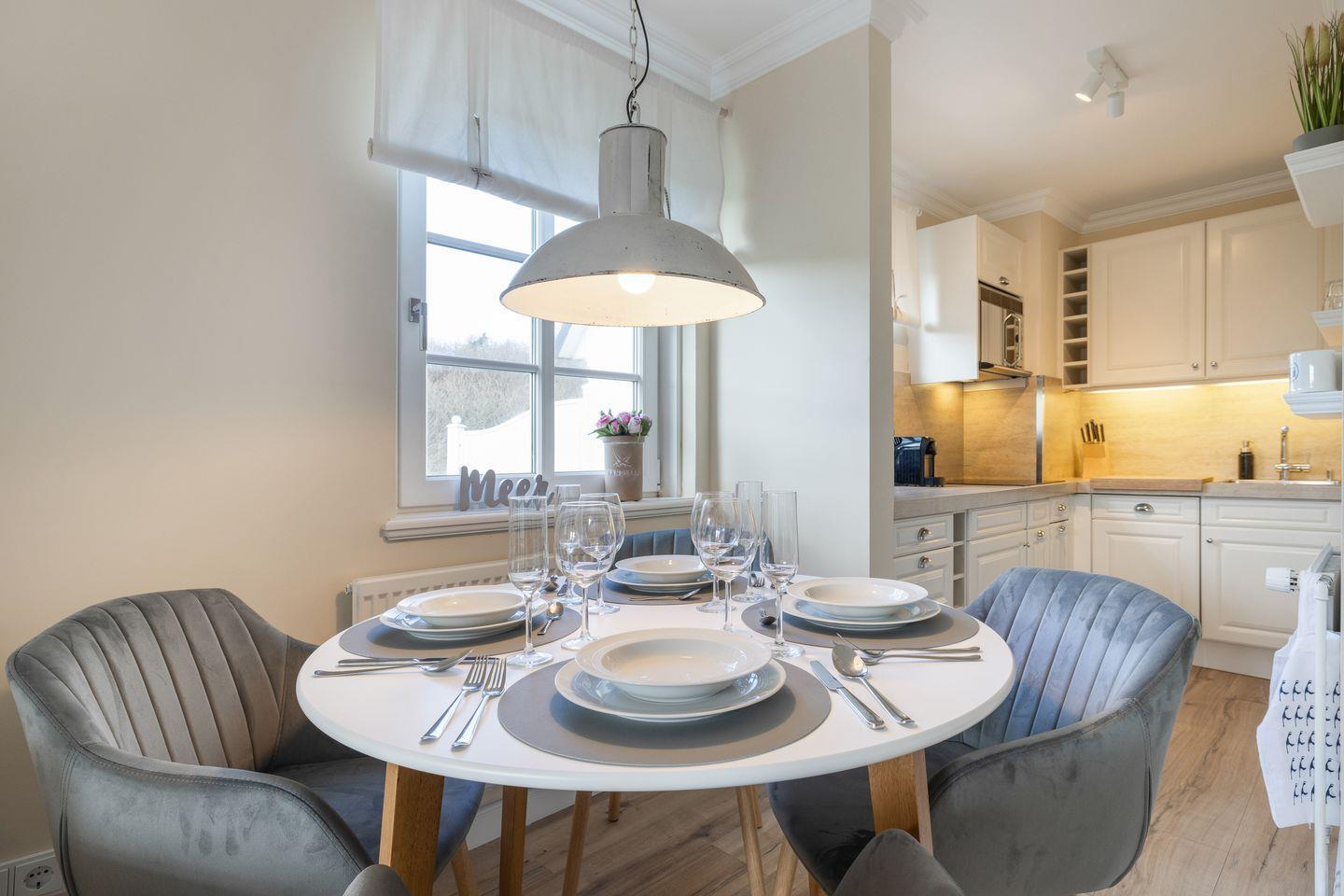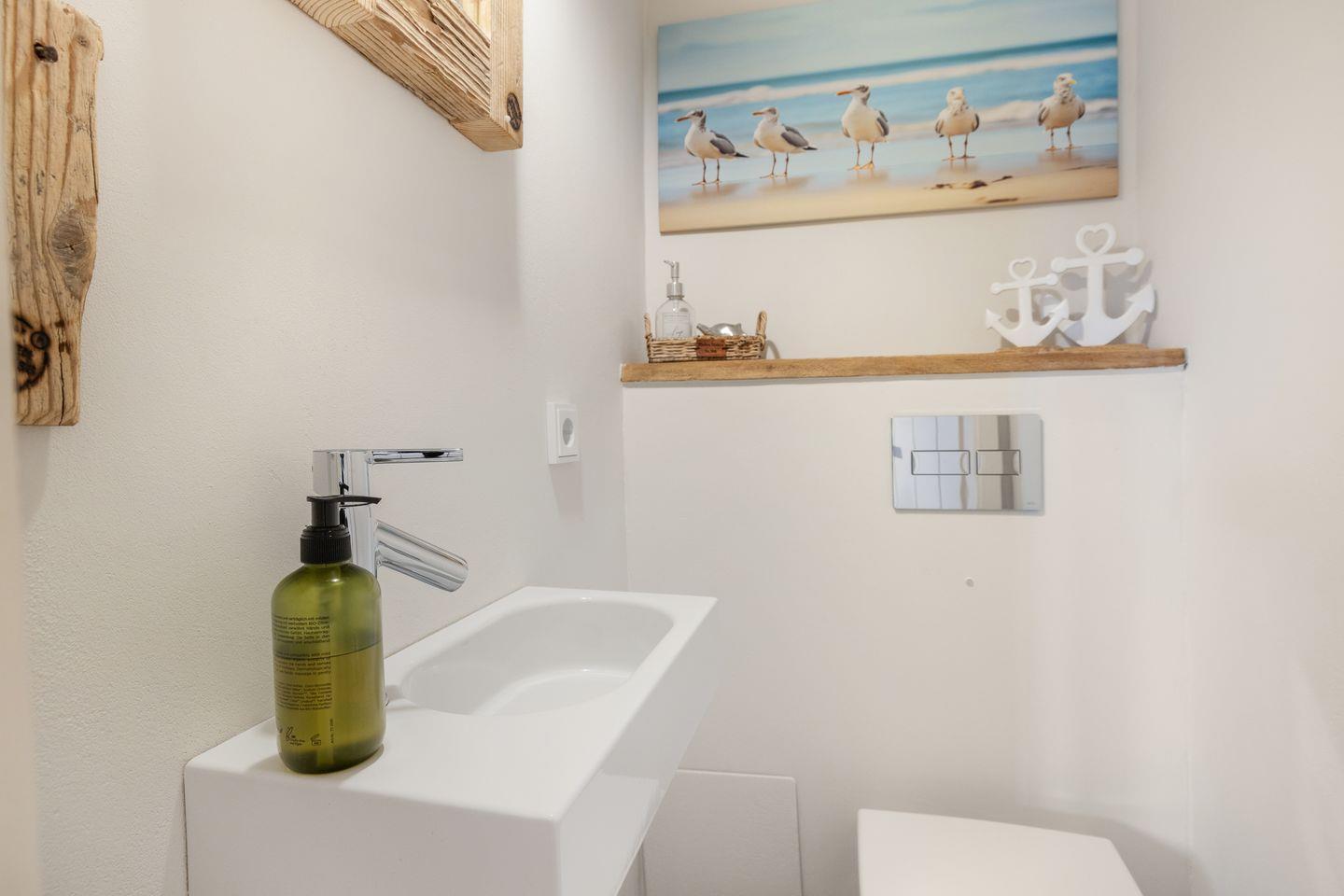 EG: Wohnraum mit Flatscreen-TV, BluRay Player, W-Lan und Elektrokamin, Essbereich, offene Küche mit Backofen-Microwellen-Kombi, Geschirrspüler, Induktionskochfeld, Filterkaffeemaschine, Cafissimo Espressomaschine, großer Garten nach hinten mit Terrasse zur Alleinnutzung, Adirondack Chairs mit Fußbank und XXL-Strandkorb von der Sansibar. Gäste-WC.