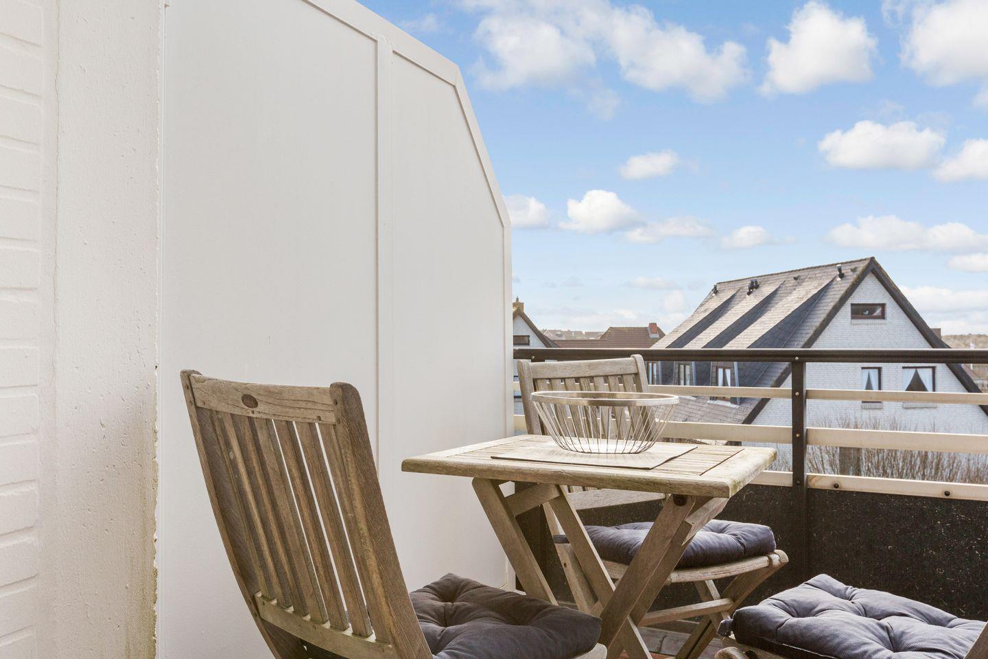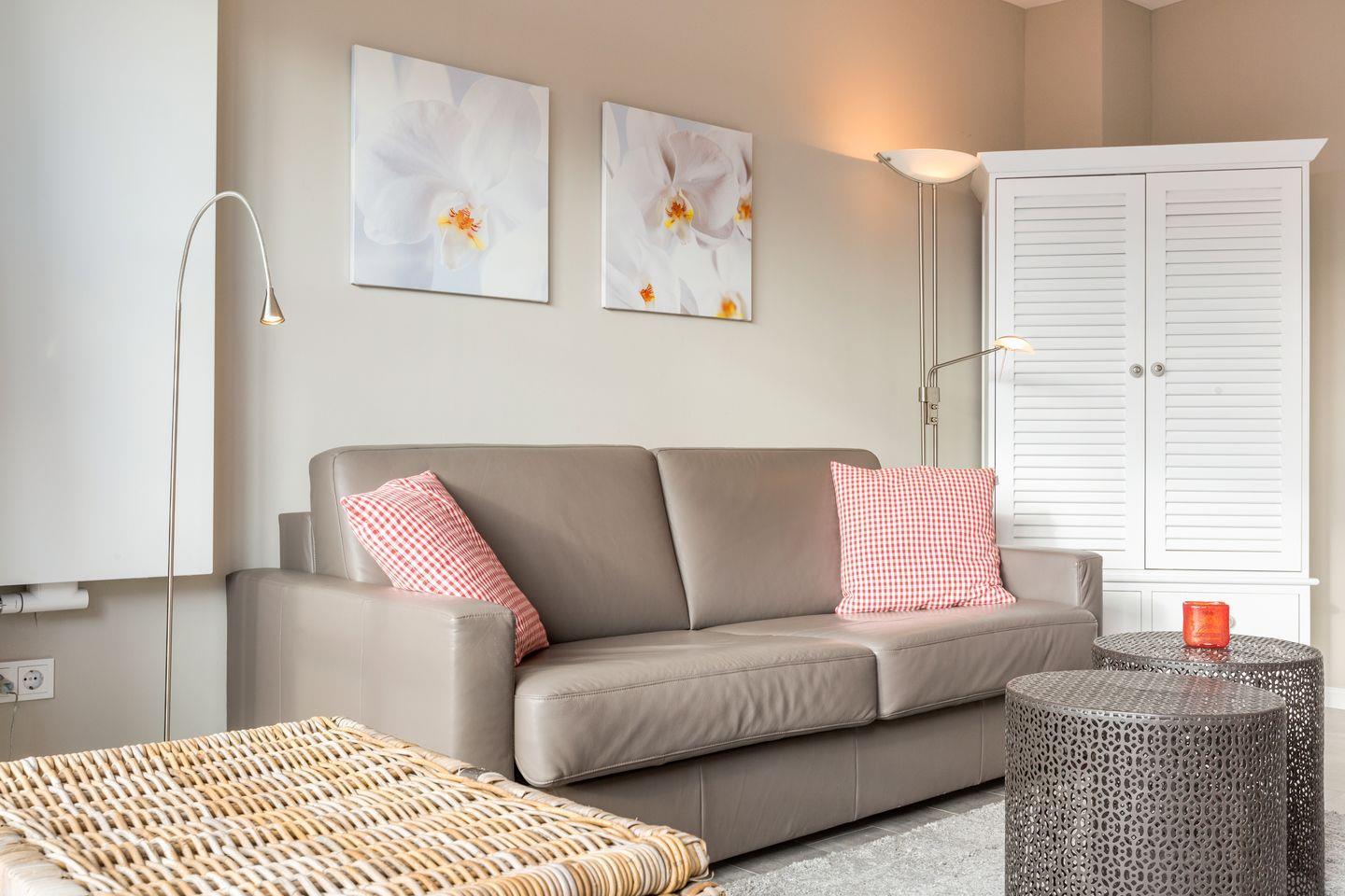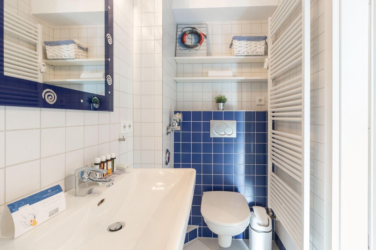 Gemütliche, kleine Sitzecke. Großzügiger Süd-Balkon mit Strandkorb und Teakholzmöbeln. Modernes Badezimmer mit Dusche.