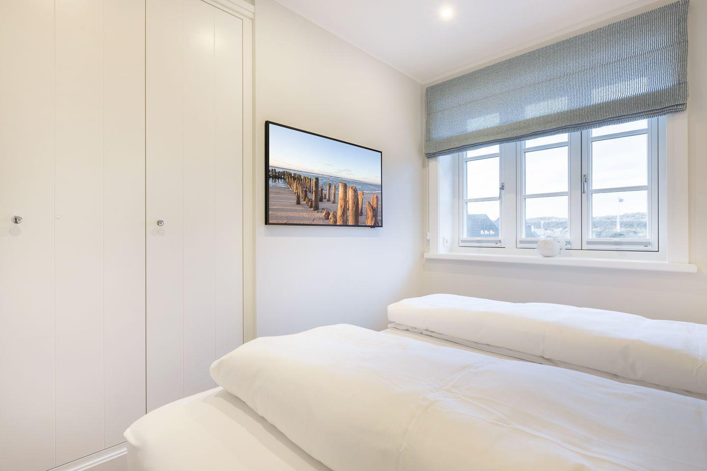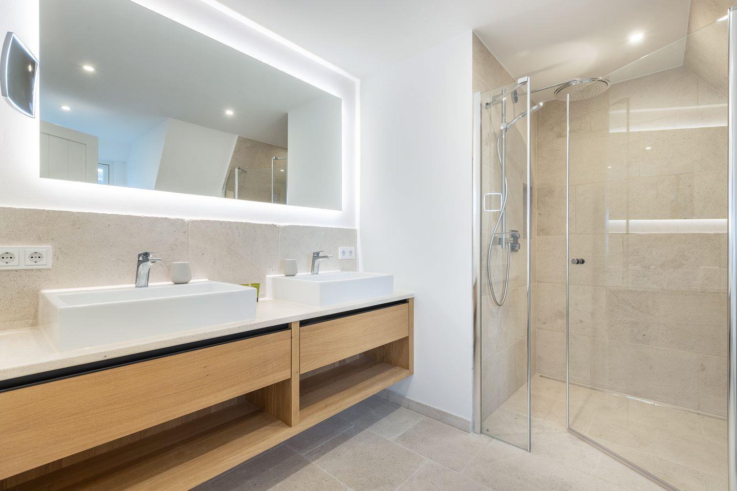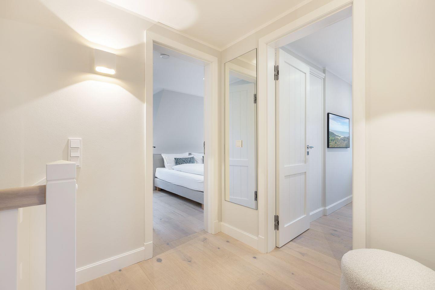Im Obergeschoss befinden sich 2 Schlafzimmer mit eingebauten Kleiderschränken (integriertes Licht) und jeweils einem Bett (180x200cm) und TV. Auch sind 2 geräumige Duschbäder mit WC vorhanden, davon ist ein Duschbad en Suite.