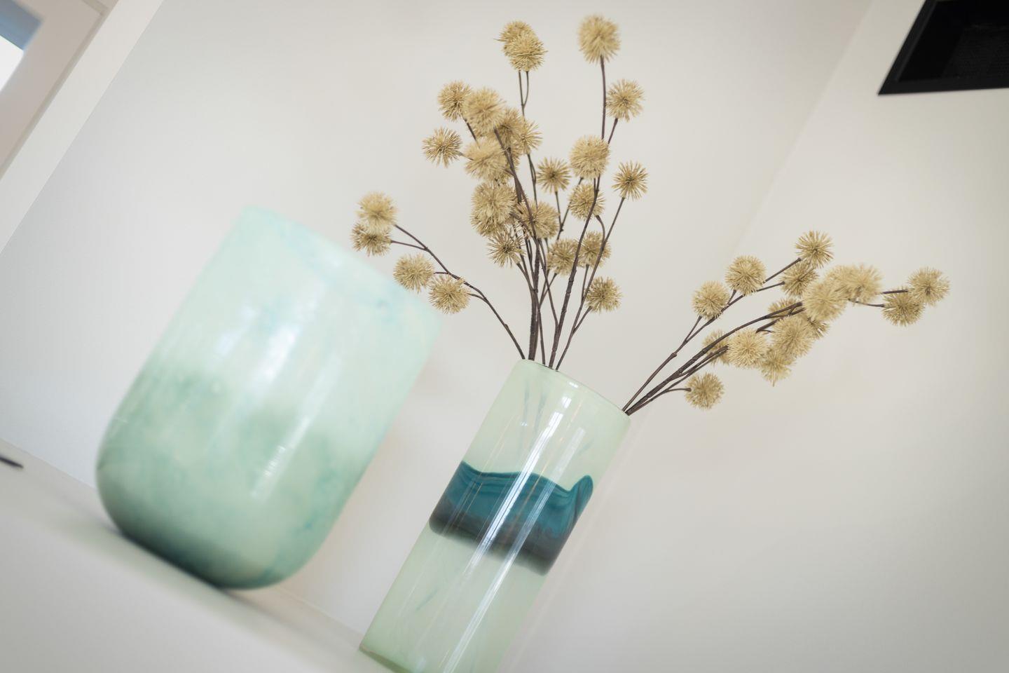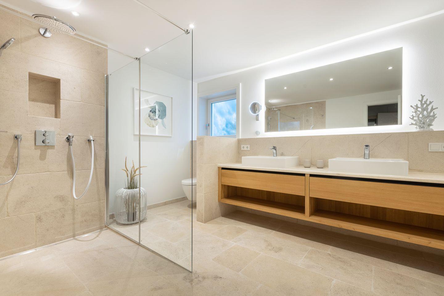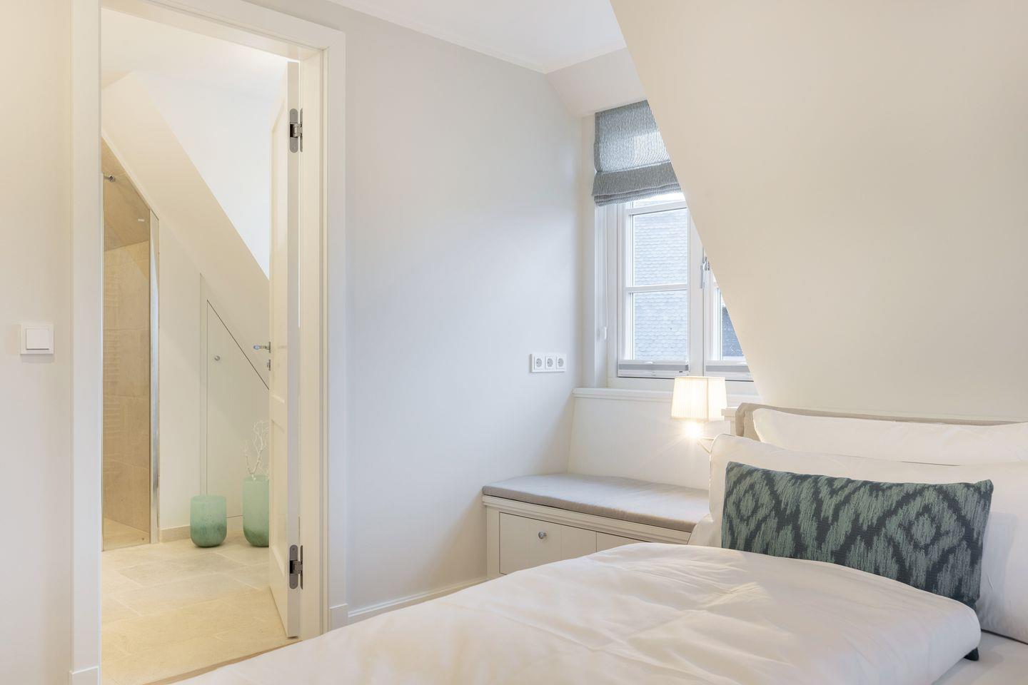 Im Obergeschoss befinden sich 2 Schlafzimmer mit eingebauten Kleiderschränken (integriertes Licht) und jeweils einem Bett (180x200cm) und TV. Auch sind 2 geräumige Duschbäder mit WC vorhanden, davon ist ein Duschbad en Suite.