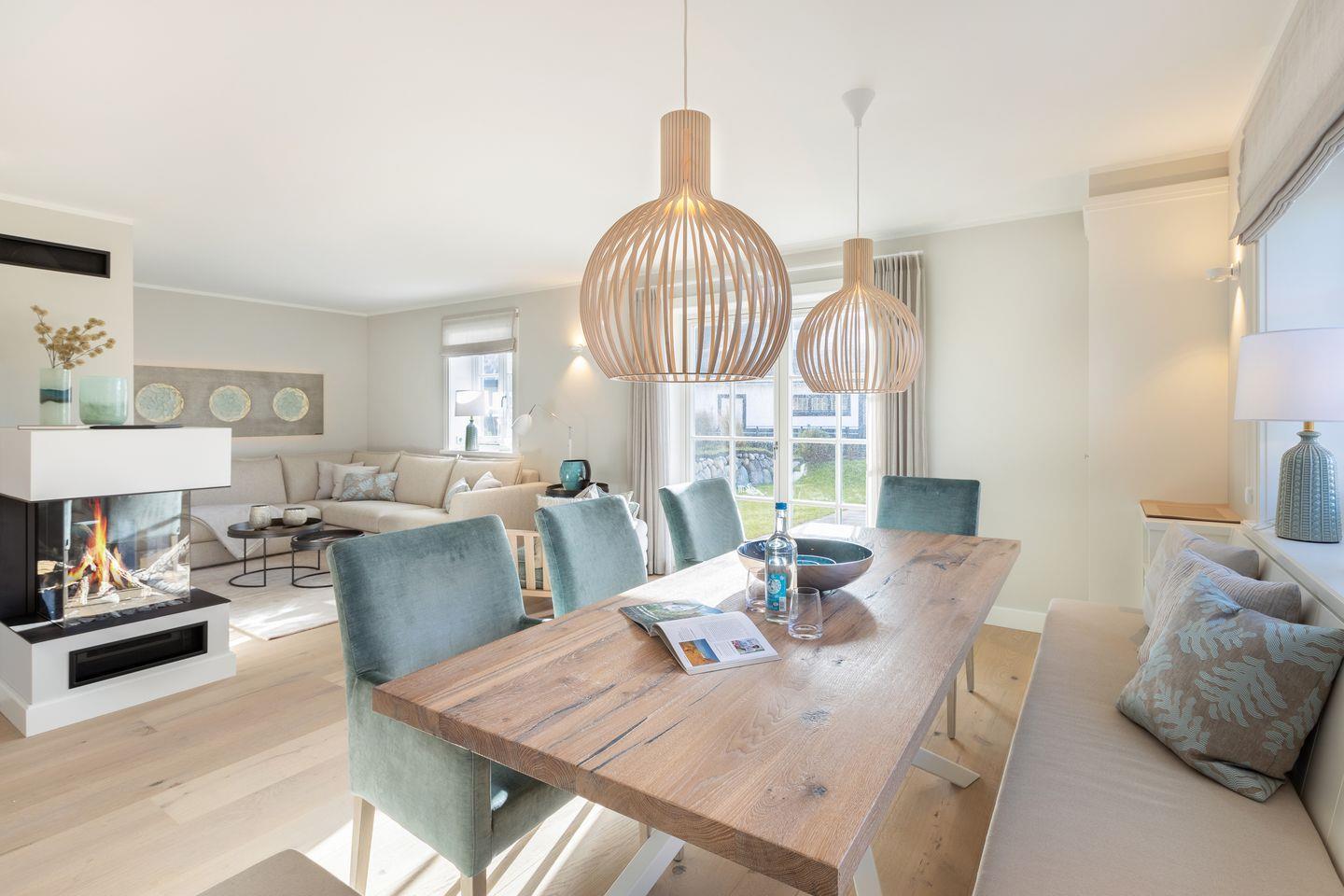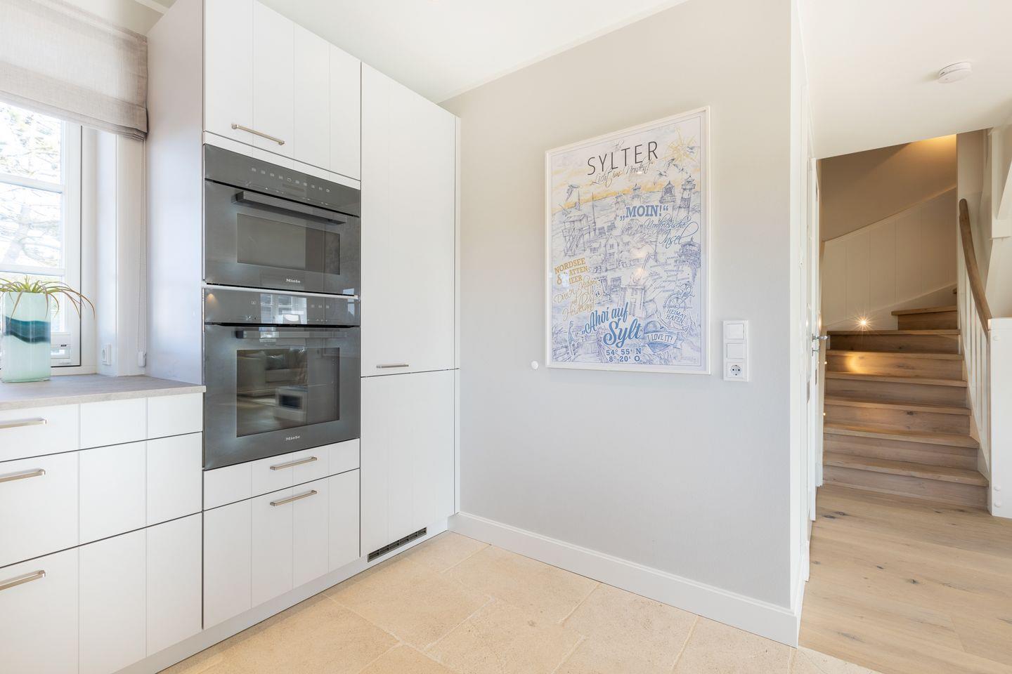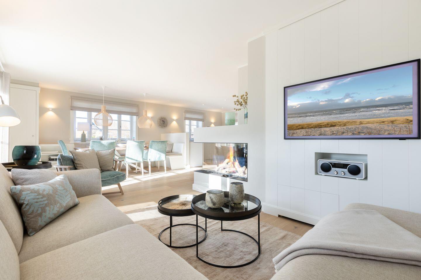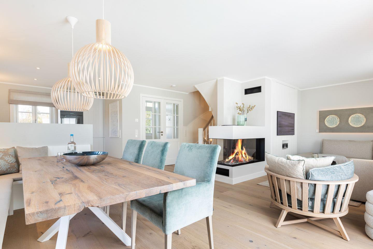 Im Erdgeschoß befindet sich die offenen Küche (Induktionskochfeld, Backofen, Mikrowelle, Geschirrspüler, Jura Kaffeevollautomat und Kaffeefiltermaschine), der Ess- und Wohnbereich (mit Gaskamin und TV) schließt übergangslos an. Die Terrasse in Südlage (Möblierung von April - Oktober) lädt im Sommer zum Verweilen ein, der Strandkorb (April - Oktober) bietet auch bei leicht windigem Wetter genügend Schutz. Im Erdgeschoss ist ein Gäste-WC.