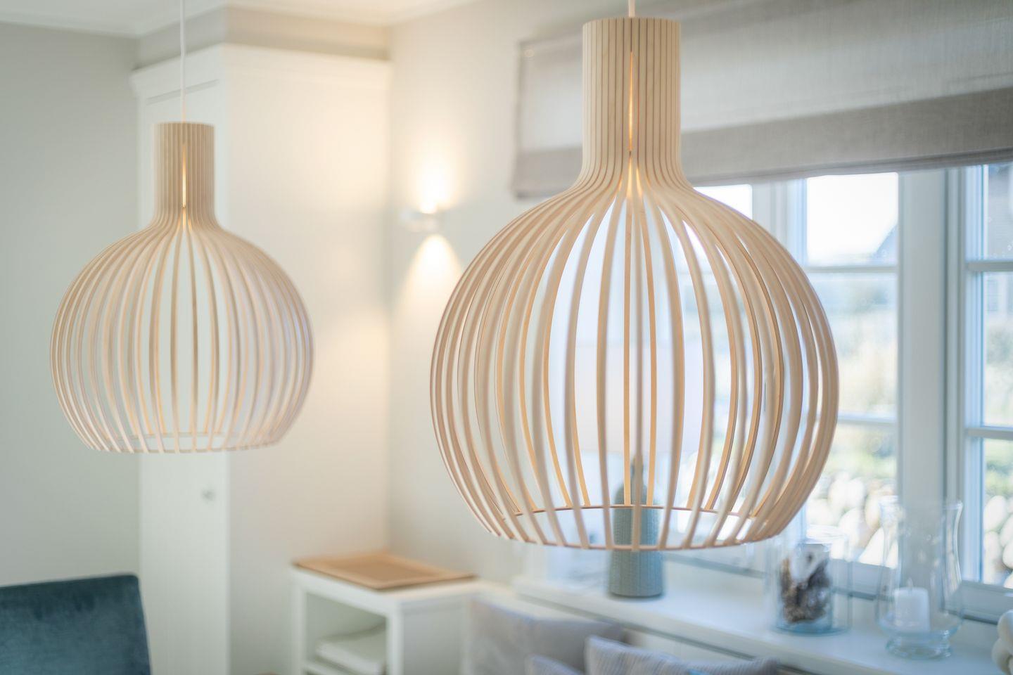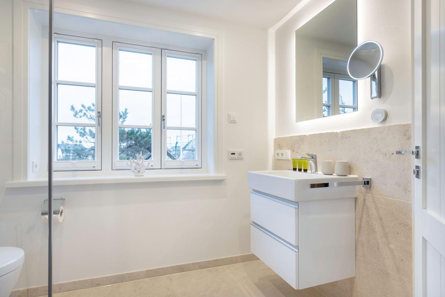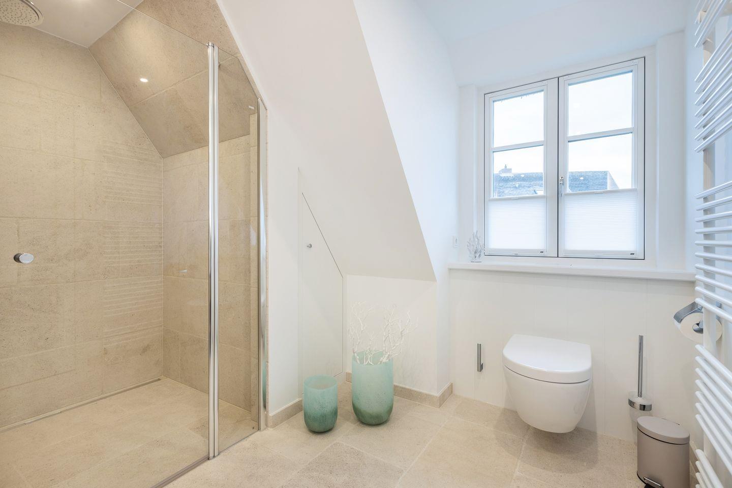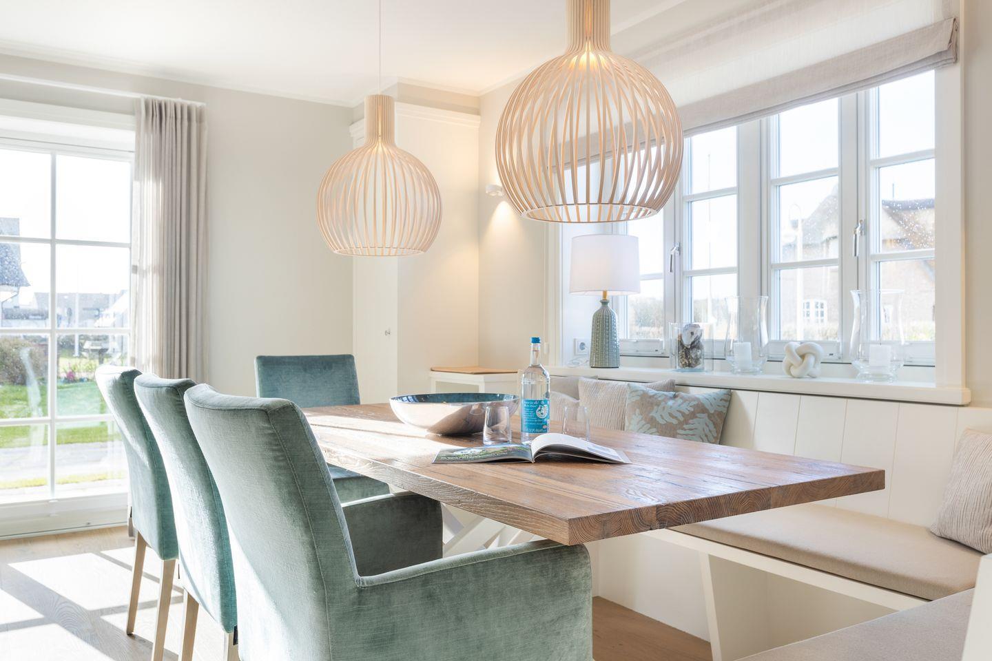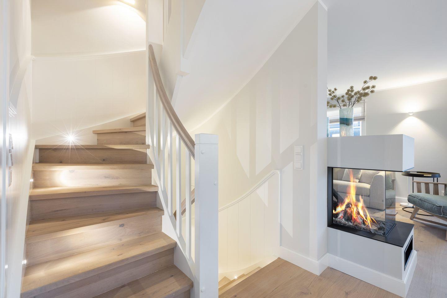 Im Erdgeschoß befindet sich die offenen Küche (Induktionskochfeld, Backofen, Mikrowelle, Geschirrspüler, Jura Kaffeevollautomat und Kaffeefiltermaschine), der Ess- und Wohnbereich (mit Gaskamin und TV) schließt übergangslos an. Die Terrasse in Südlage (Möblierung von April - Oktober) lädt im Sommer zum Verweilen ein, der Strandkorb (April - Oktober) bietet auch bei leicht windigem Wetter genügend Schutz. Im Erdgeschoss ist ein Gäste-WC.