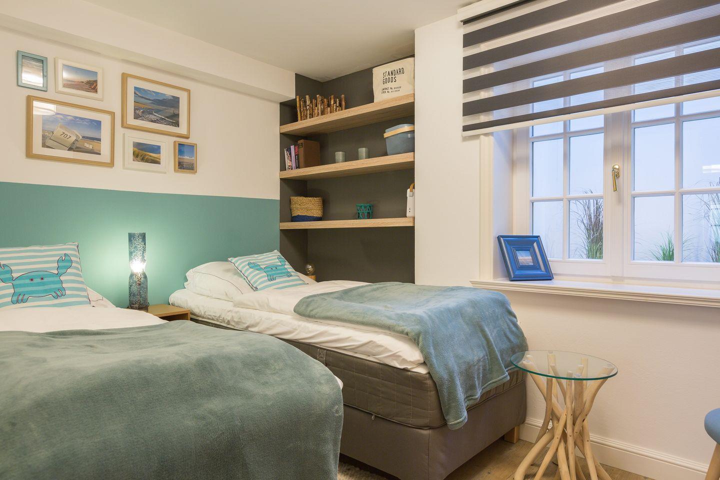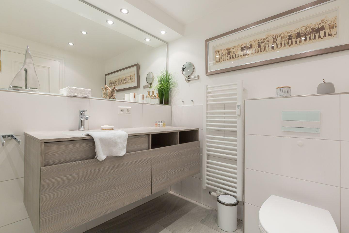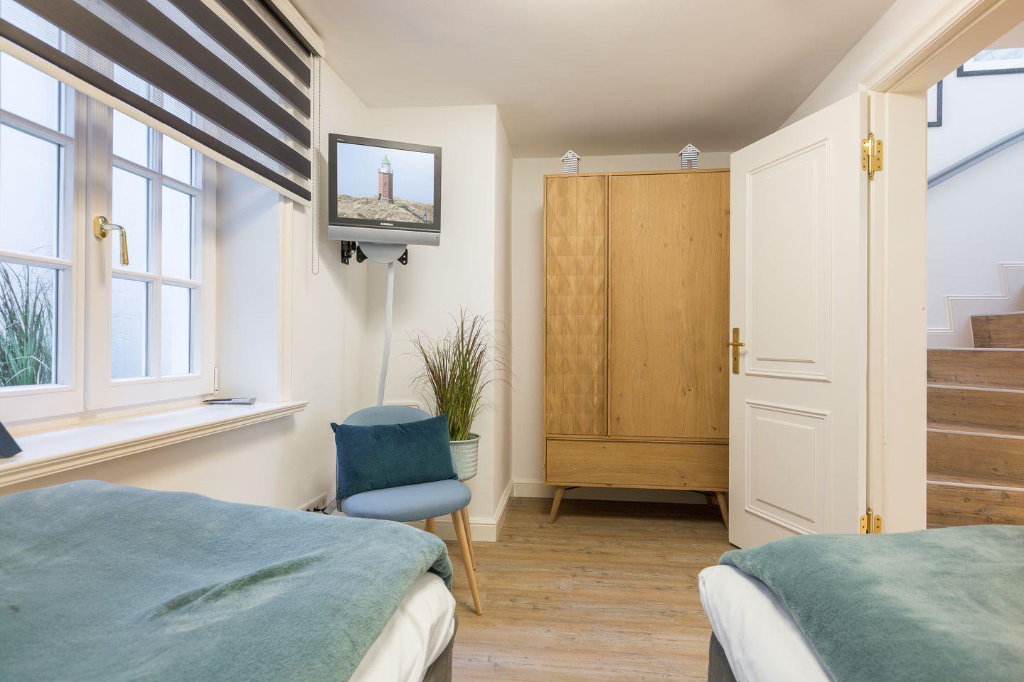 Souterrain: Eine Massivholztür trennt Wohnzimmer und Treppe zum Untergeschoss. Perfekt also auch für Familien mit kleinen Kindern. Im Souterrain erwartet Sie ein großzügiger und schön gestalteter Raum mit hochwertigem Doppelbett (1,8 m x 2 m), Flat-TV und ausreichend Schrankfläche. Das zweite Schlafzimmer mit Flat-TV ist ebenfalls liebevoll und praktisch zugleich eingerichtet. Die beiden Boxspring-Einzelbetten (0,8m x 2 m) lassen sich je nach Bedarf zusammen oder auseinander stellen. Durch die großen beleuchteten Lichtschächte präsentieren sich beide Räume zu jeder Uhrzeit freundlich und hell. Das komplett sanierte und modernisierte Badezimmer rundet das Angebot ab. Hochwertige Sanitärobjekte und Einbauten namhafter Hersteller. Lassen Sie sich von der bodentiefe Rain-Dusche verwöhnen und starten Sie entspannt in den Tag. Eine Waschmaschine steht im separaten Abstellraum für Sie zur Verfügung.