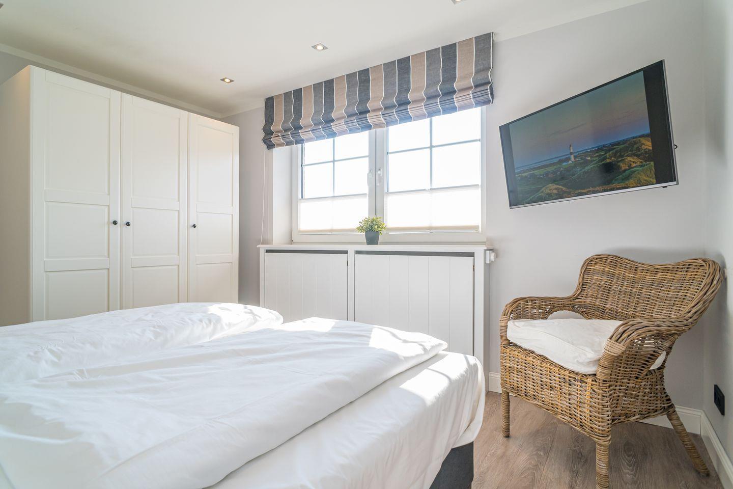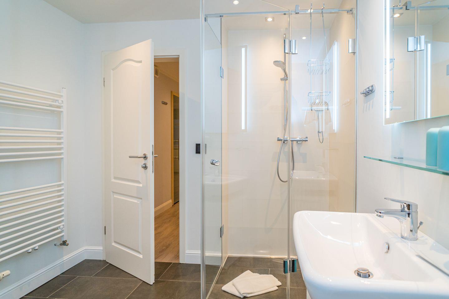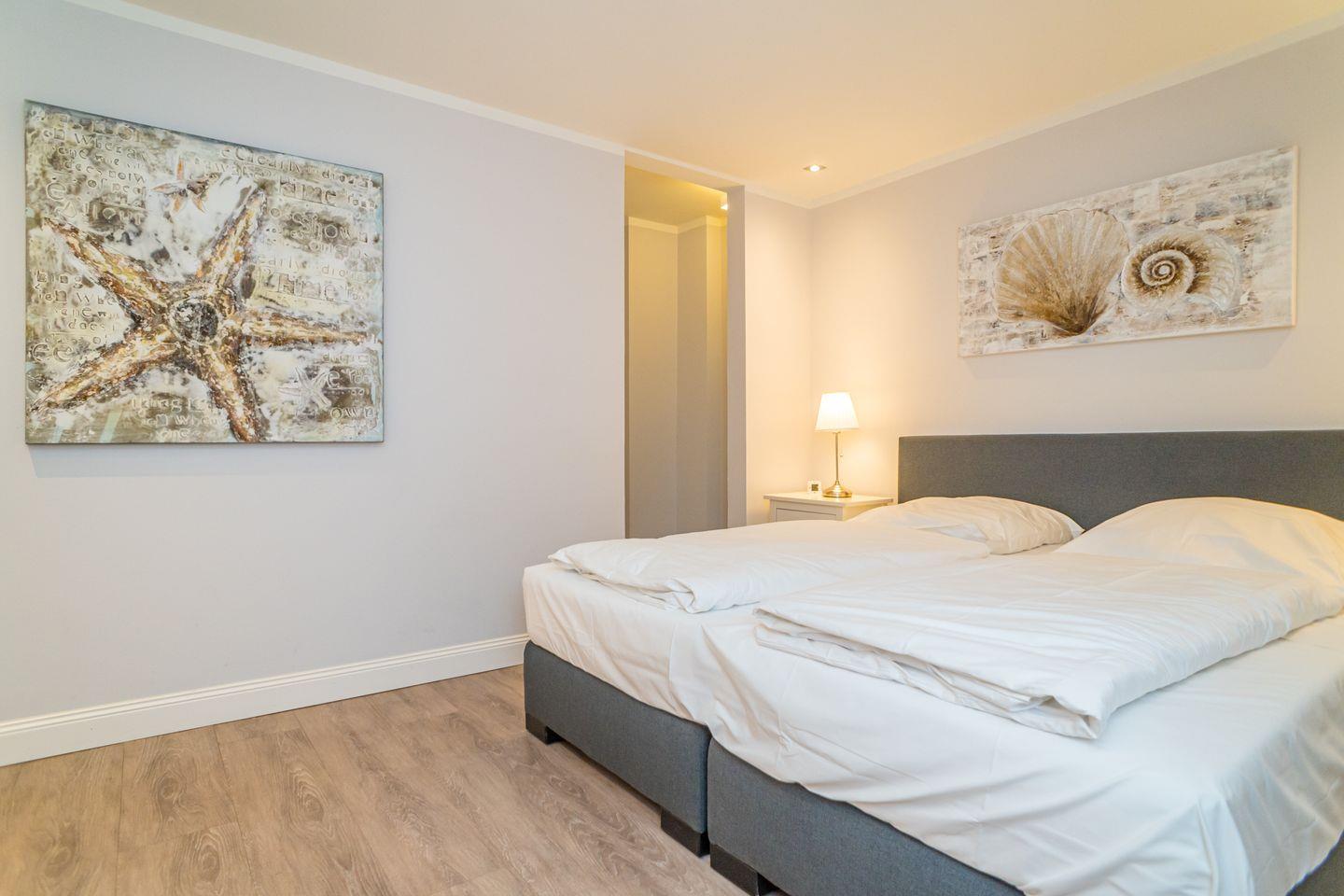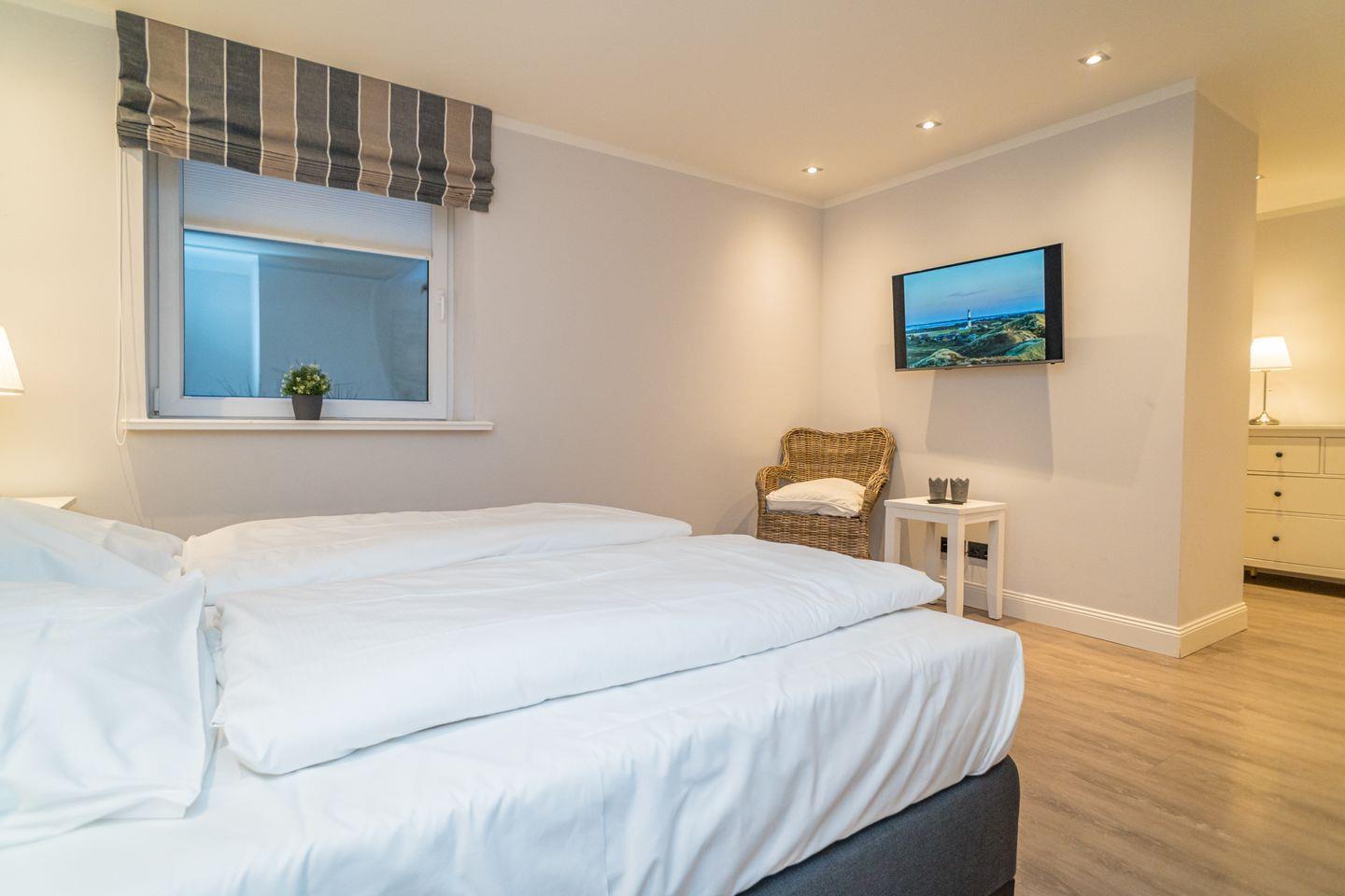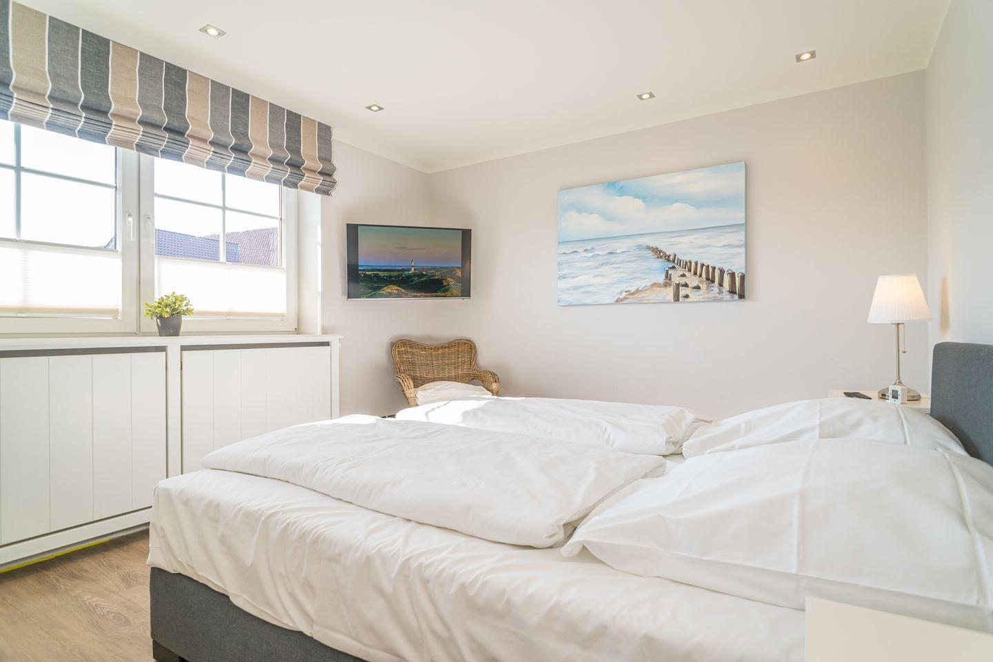 Insgesamt drei Schlafzimmer laden mit komfortablen Boxspringbetten zum wohligen Schlummern ein: eins im Erdgeschoss (Doppelbett) und zwei im Souterrain (begehbarer Kleiderschrank, Doppel- und Einzelbett). Zwei moderne Bäder mit bodengleicher Dusche und on-top noch einer Sauna runden das Appartement Lachmöwe ab.