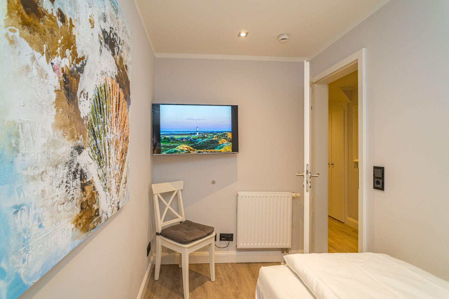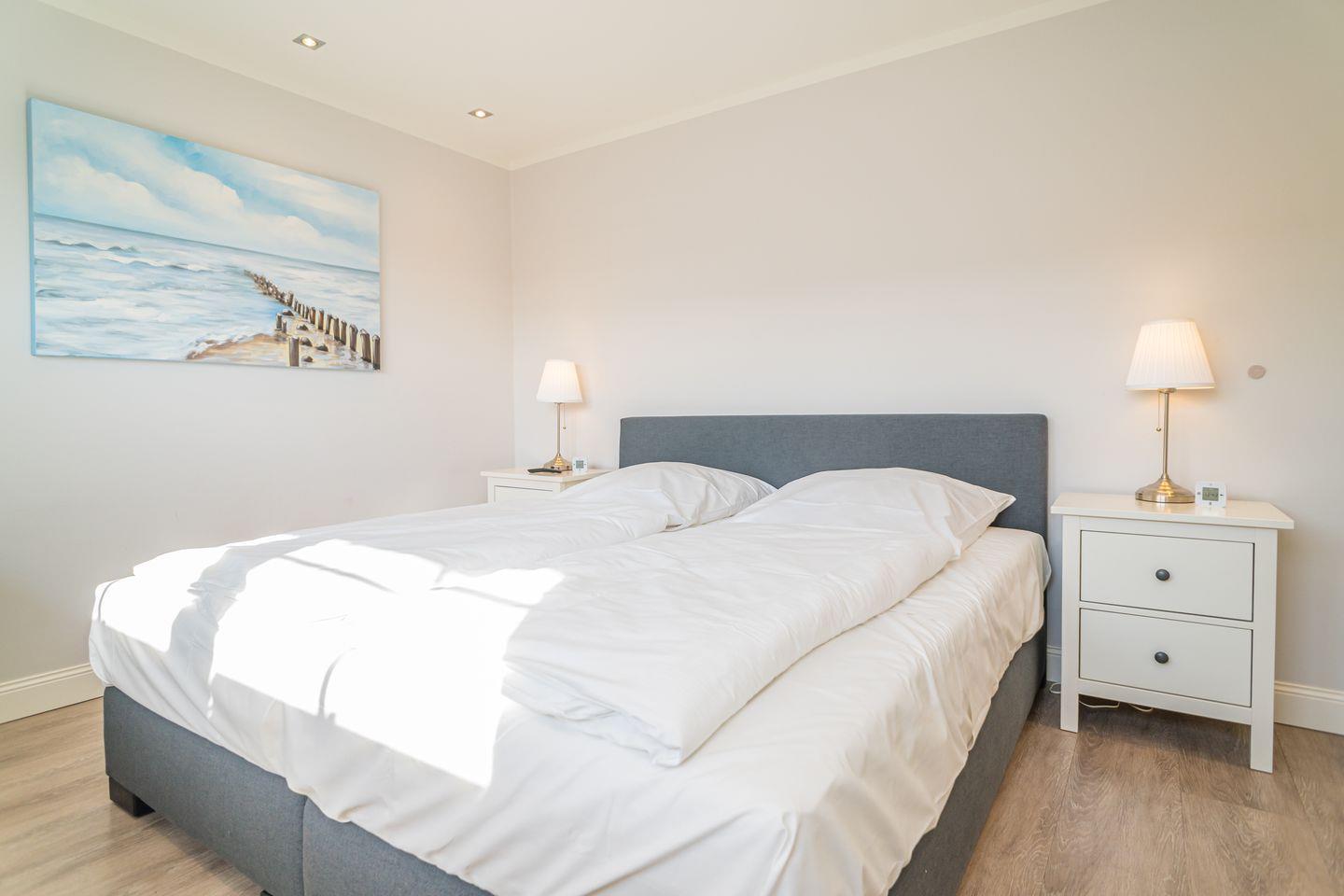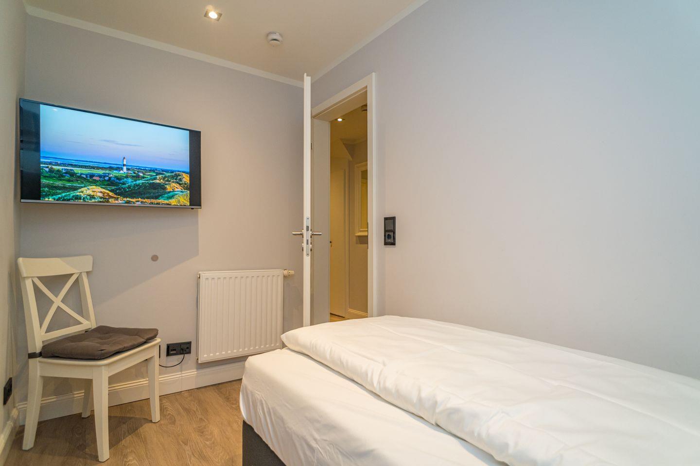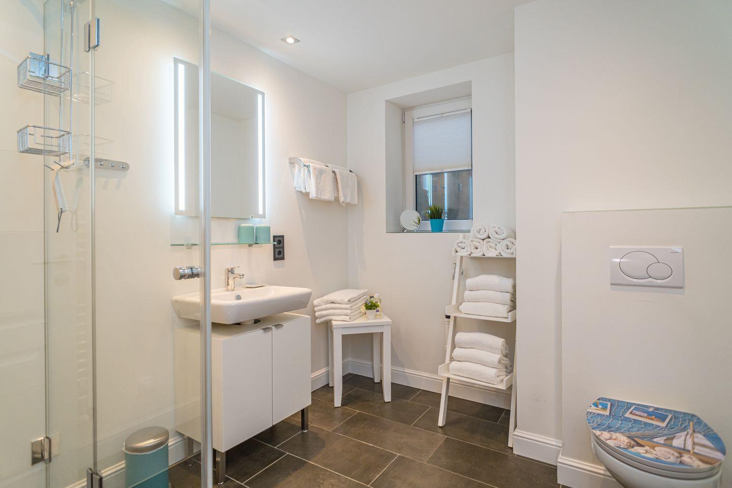 Insgesamt drei Schlafzimmer laden mit komfortablen Boxspringbetten zum wohligen Schlummern ein: eins im Erdgeschoss (Doppelbett) und zwei im Souterrain (begehbarer Kleiderschrank, Doppel- und Einzelbett). Zwei moderne Bäder mit bodengleicher Dusche und on-top noch einer Sauna runden das Appartement Lachmöwe ab.