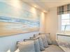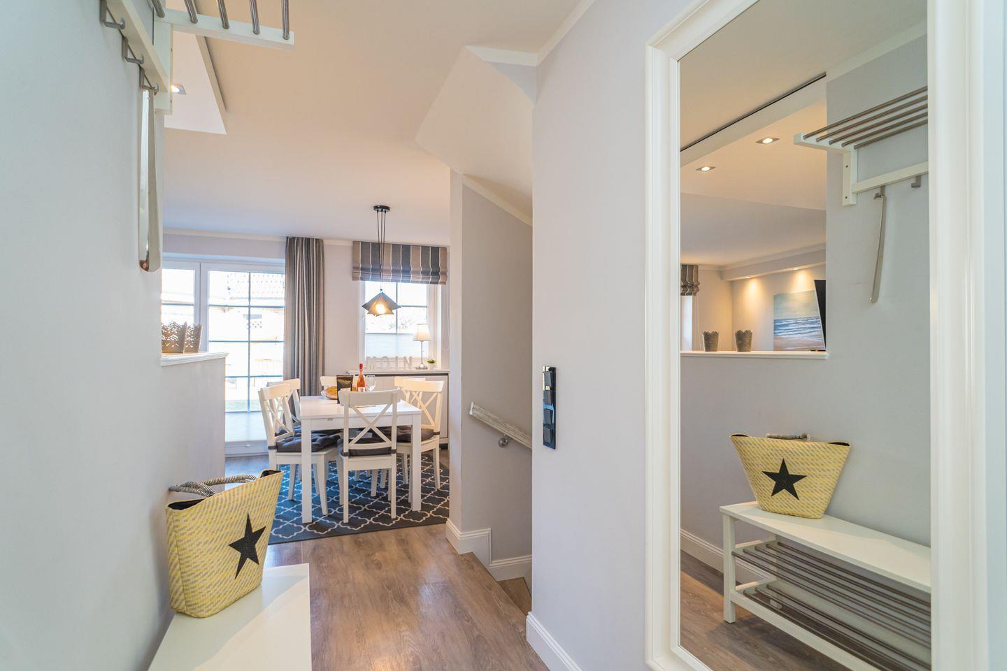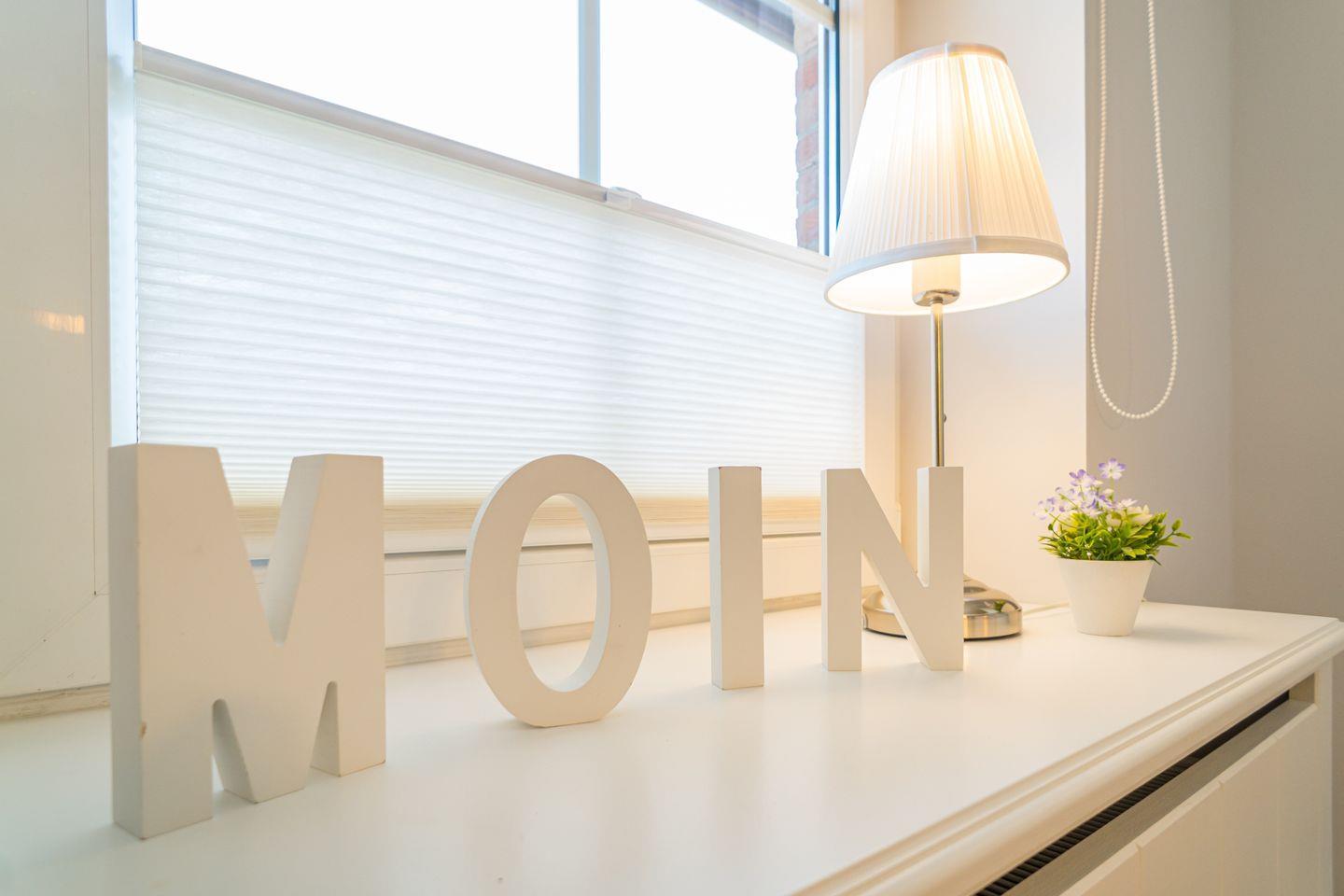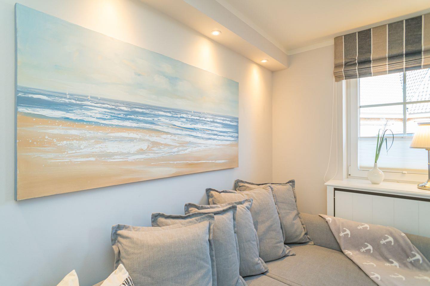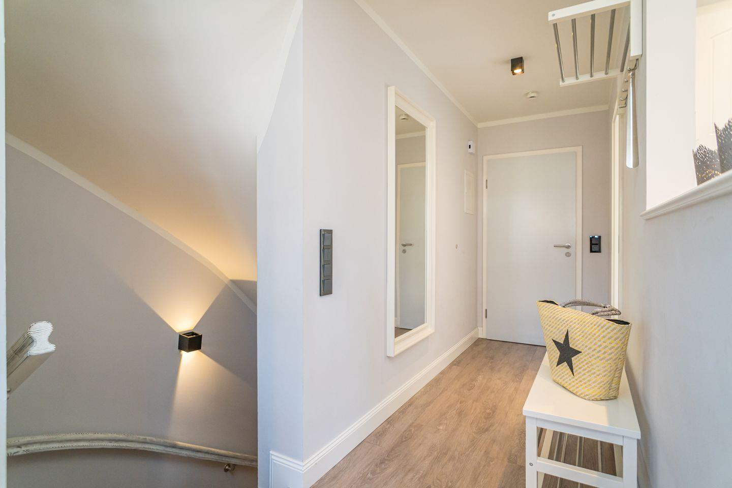 Die gekreideten Töne der Eichendielen ziehen sich durch alle Räumen und sorgen so für eine warme Atmosphäre. Helle Holzarbeiten und stilsichere Farbgestaltung verschaffen dabei eine behagliche Gemütlichkeit, die den nordischen Charakter dieses Appartements im Sylter Strandhaus Look prägt.