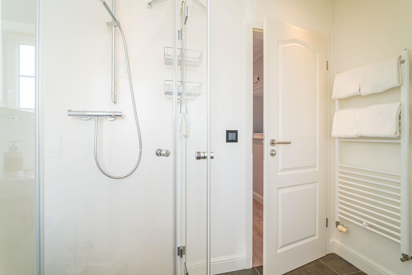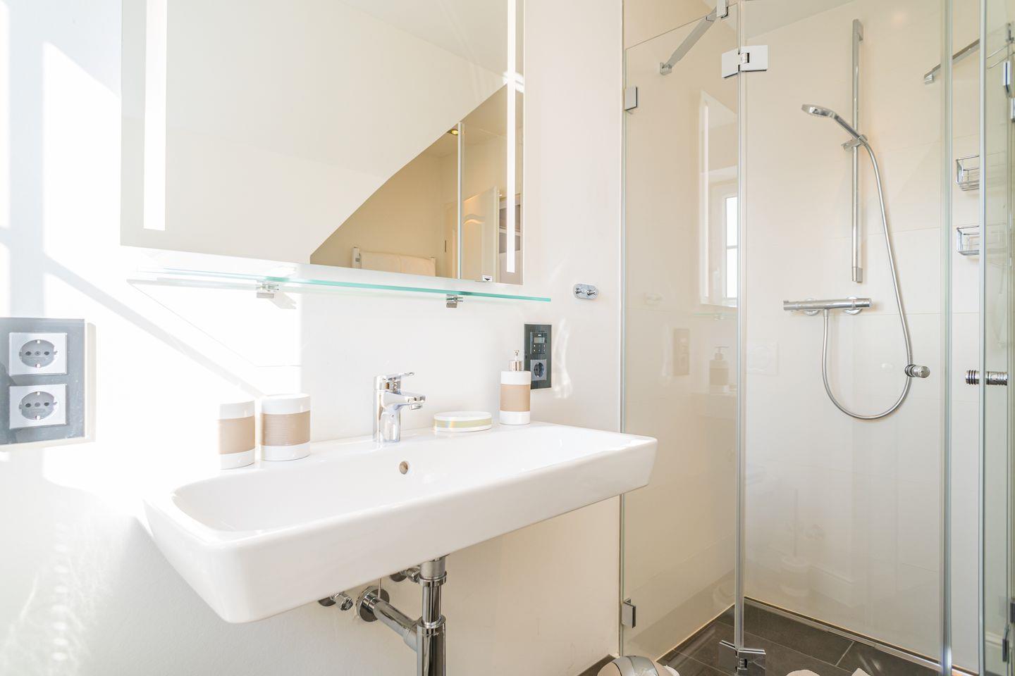 Ein modernes Bad mit bodengleicher Dusche machen das Glück perfekt. Gästen des Appartements Nordlicht steht darüber hinaus ein Gartenplatz mit Strandkorb und Gartenmöbeln auf dem Grundstück zur Verfügung.