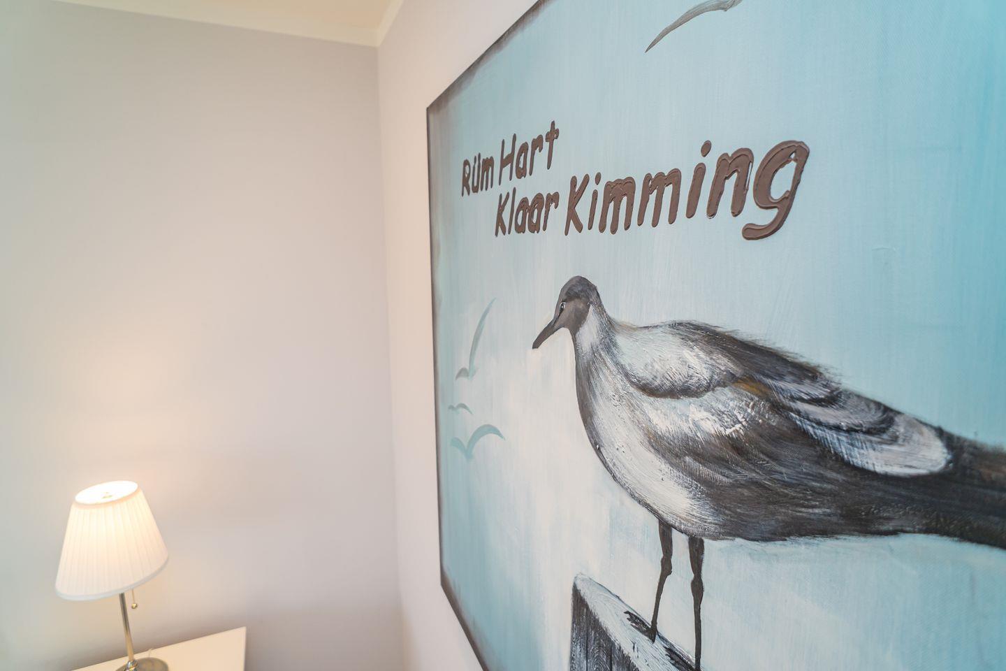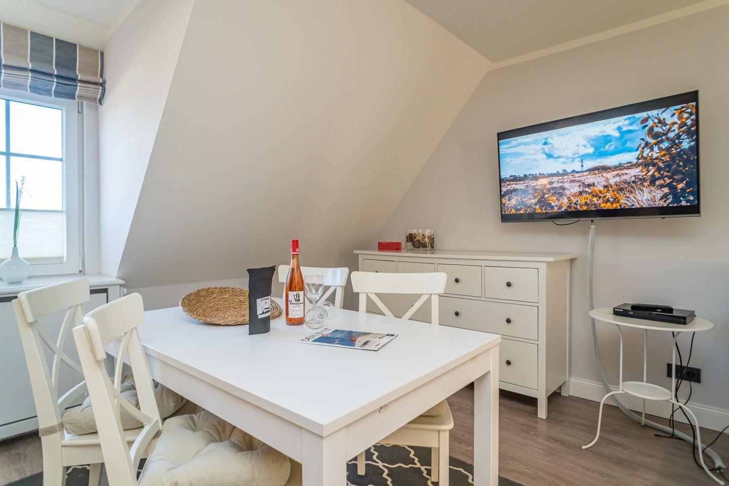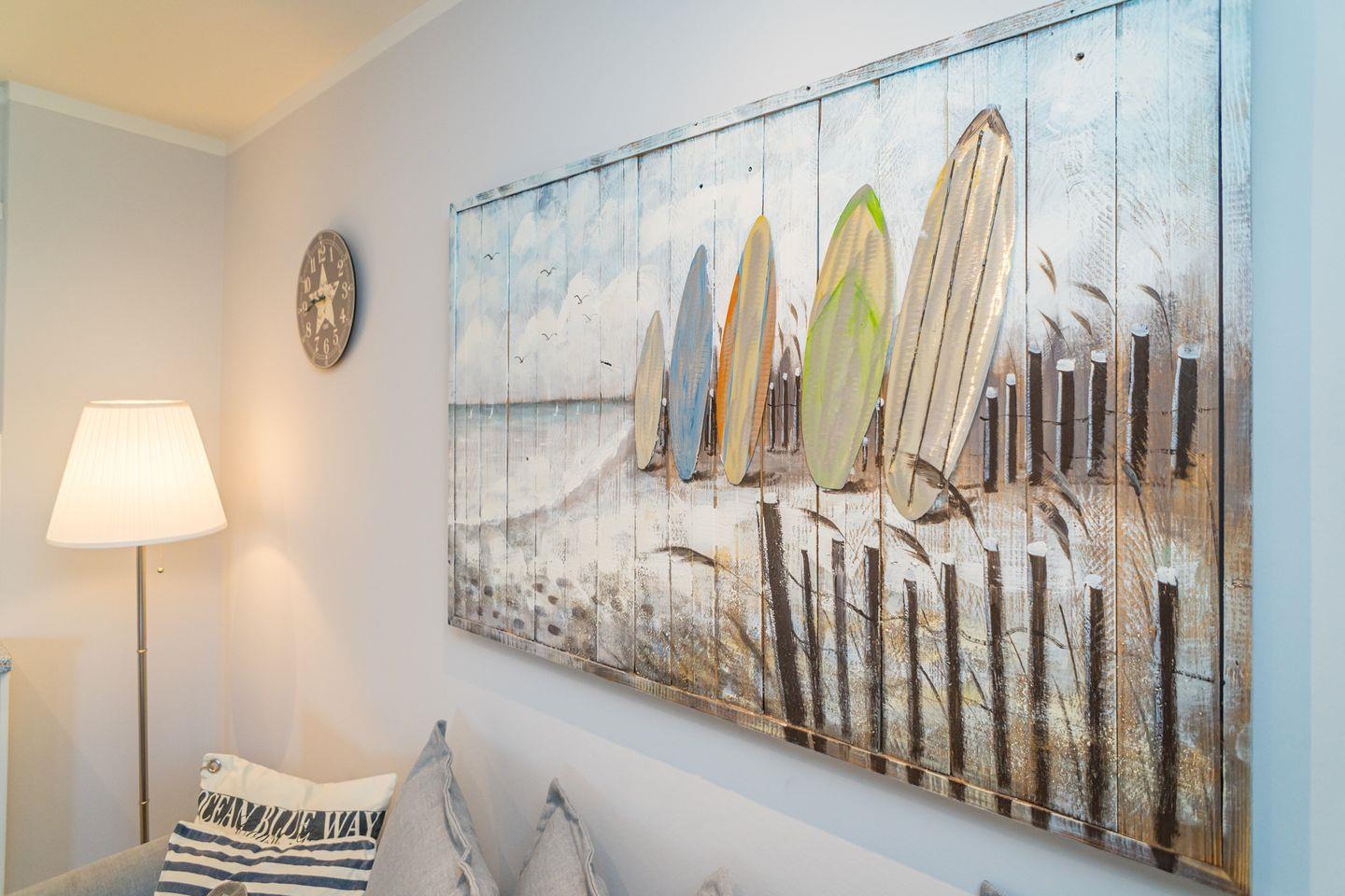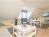 Die gekreideten Töne der Eichendielen ziehen sich durch alle Räumen und sorgen so für eine warme Atmosphäre. Helle Holzarbeiten und stilsichere Farbgestaltung verschaffen dabei eine behagliche Gemütlichkeit, die den nordischen Charakter dieses Appartements im Sylter Strandhaus Look prägt.
