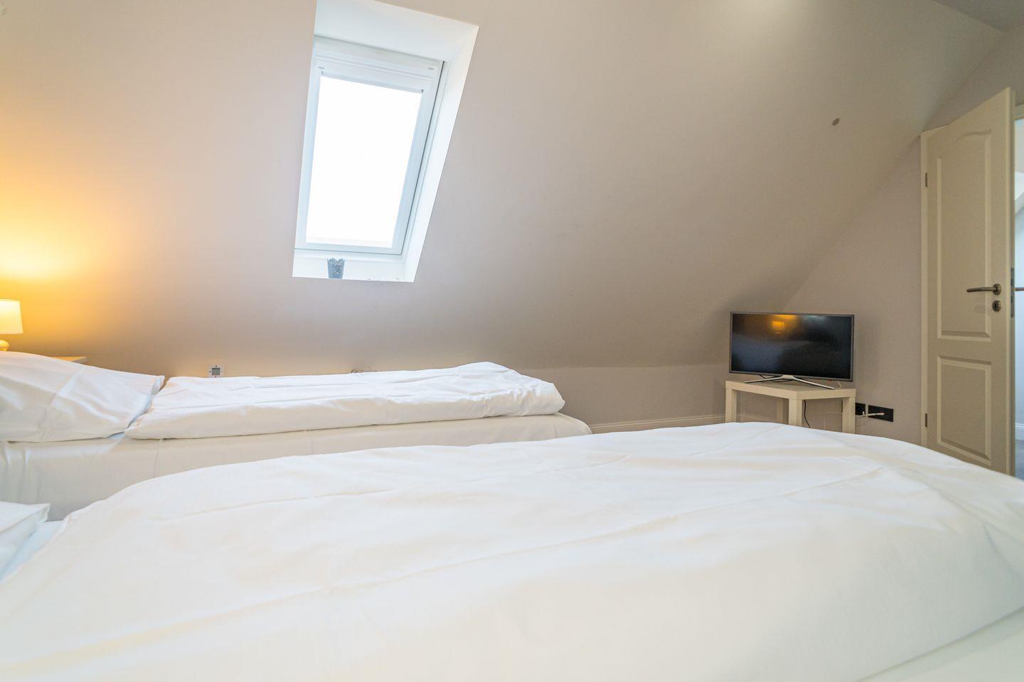 Die beiden Schlafzimmer befinden sich im Ober- bzw. Dachgeschoss und verfügen über komfortable Boxspringetten (1 x Doppelbett, 2 x Einzelbett) und schallisolierte Fenster.