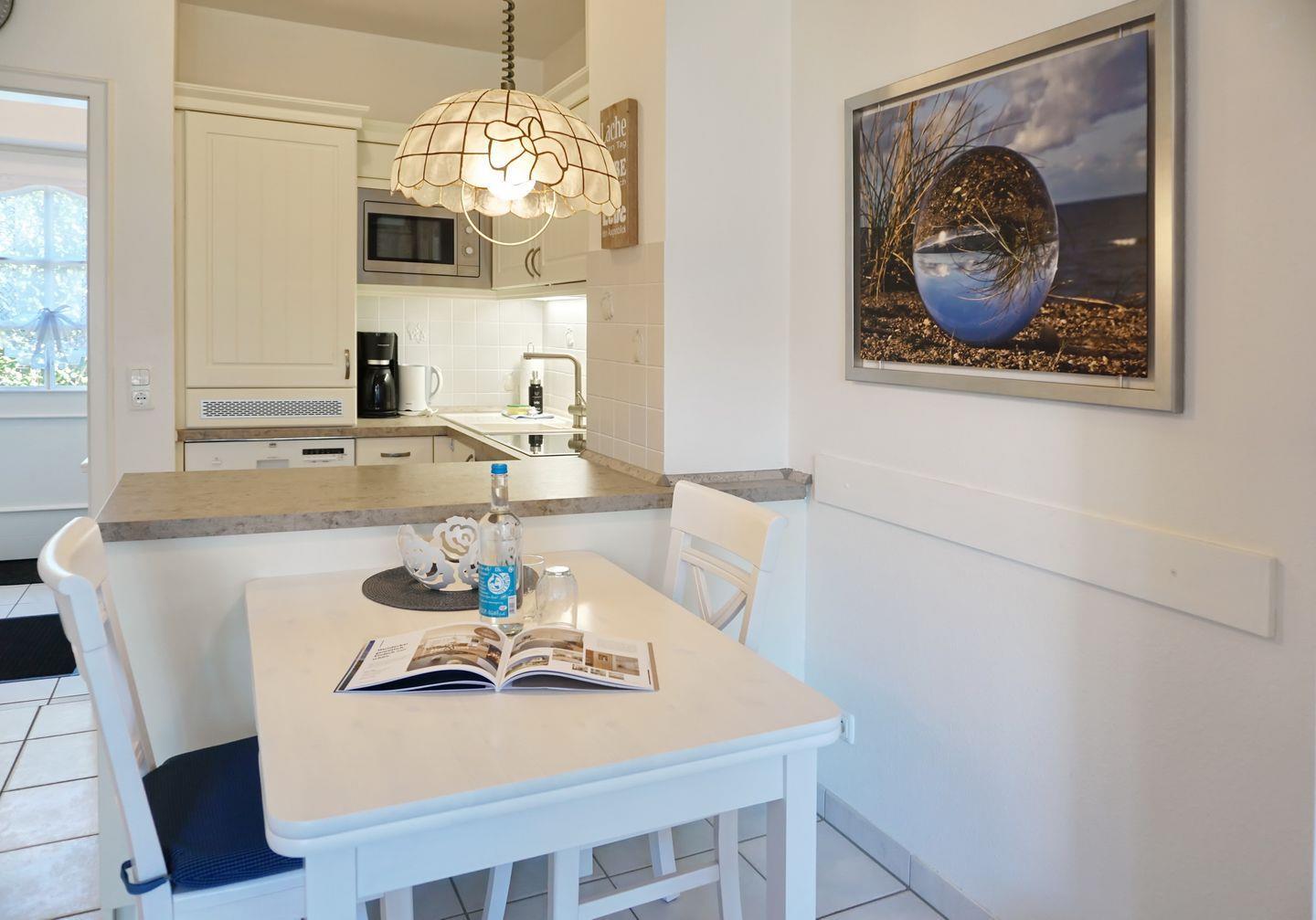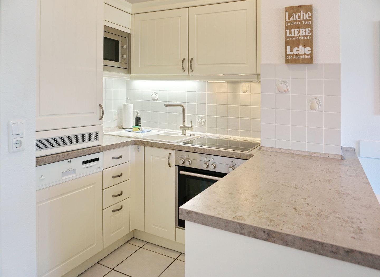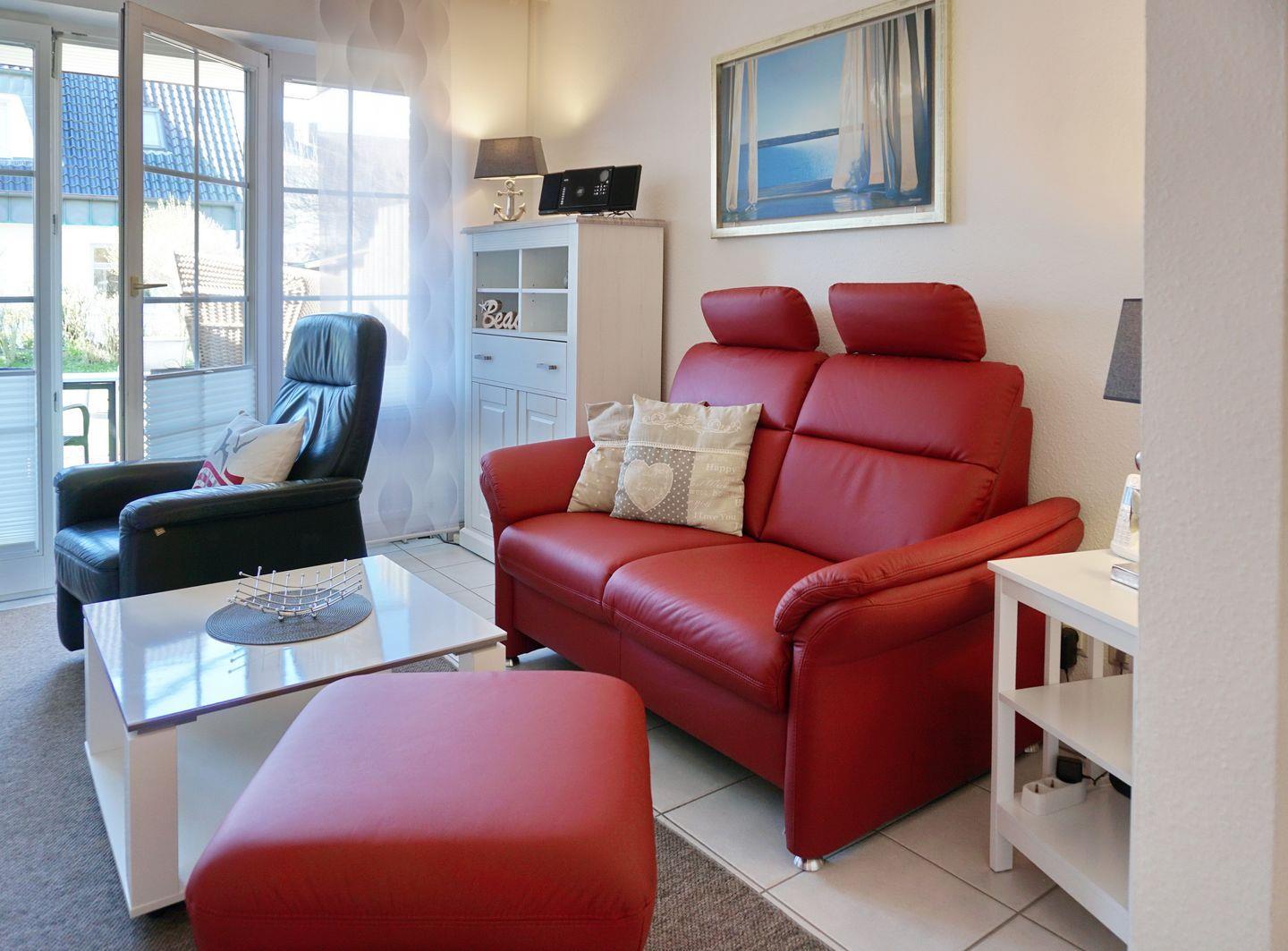 Der Wohnraum des Domizils bietet Ihnen eine große Couchecke zum Entspannen und durch die bodentiefen Fenster fällt viel Licht in das Wohnzimmer. Am geräumigen Esstisch können Sie Ihre Urlaubsleckereien genießen und die offene Küche bietet Ihnen mit ihrer vollen Ausstattung alles, was das Urlaubsherz begehrt. Vom Wohnraum aus betreten Sie Ihre sonnige Süd-Terrasse, die von April bis Oktober möbliert ist. Im Erdgeschoss der Wohnung finden Sie außerdem ein Gäste-WC.