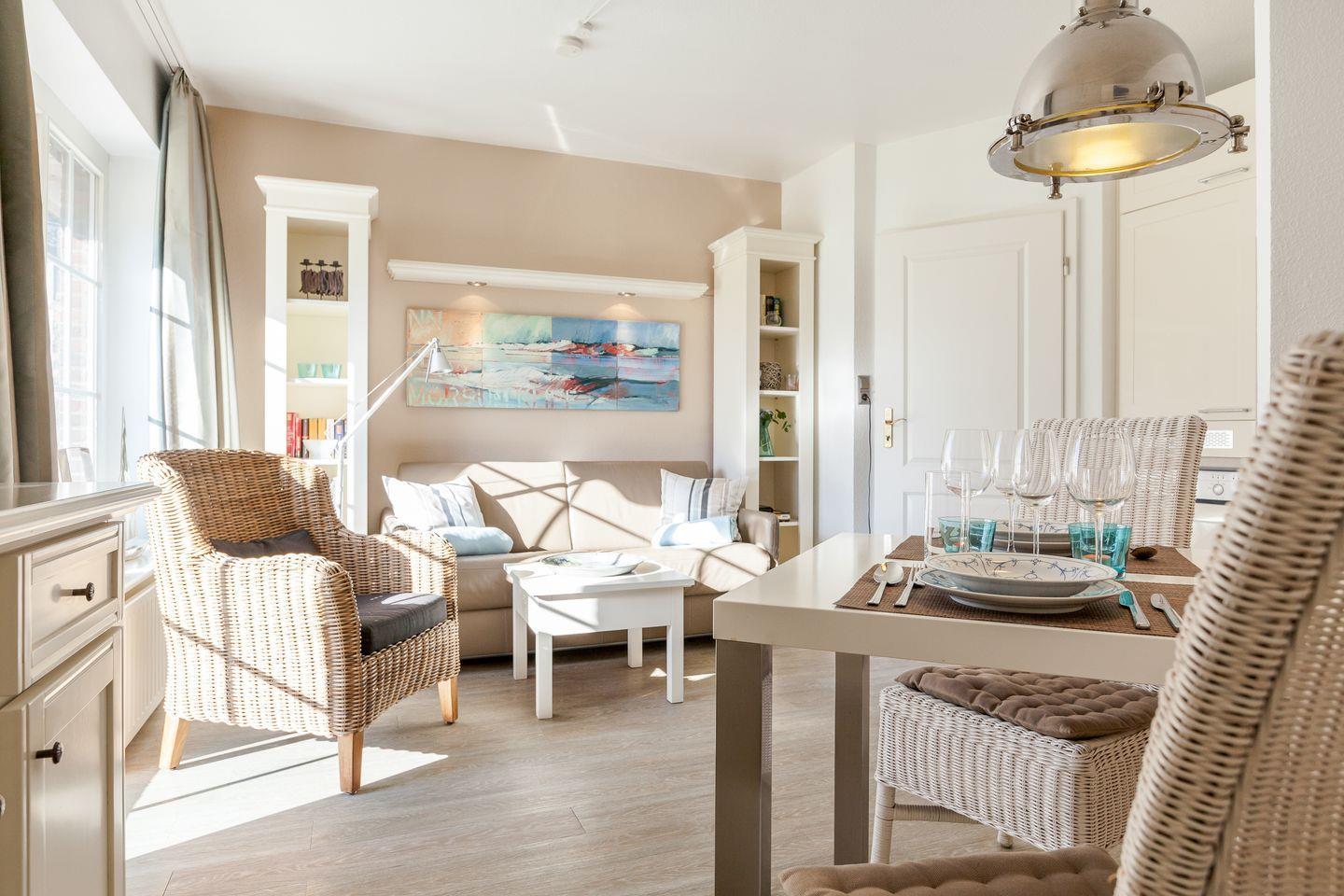 Im Erdgeschoss des Domizils finden Sie einen hellen, gemütlich eingerichteten Wohnraum mit Couchbereich und einem kleinen Esstisch. Durch die bodentiefen Fenster zur Terrasse fällt viel Tageslicht in die Wohnung.