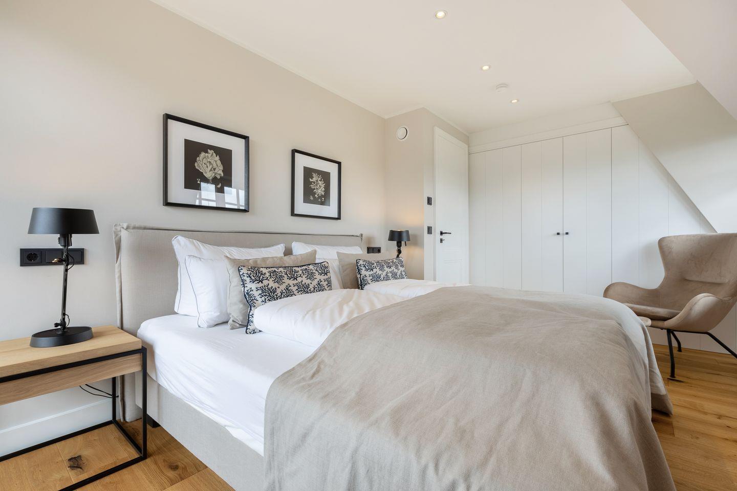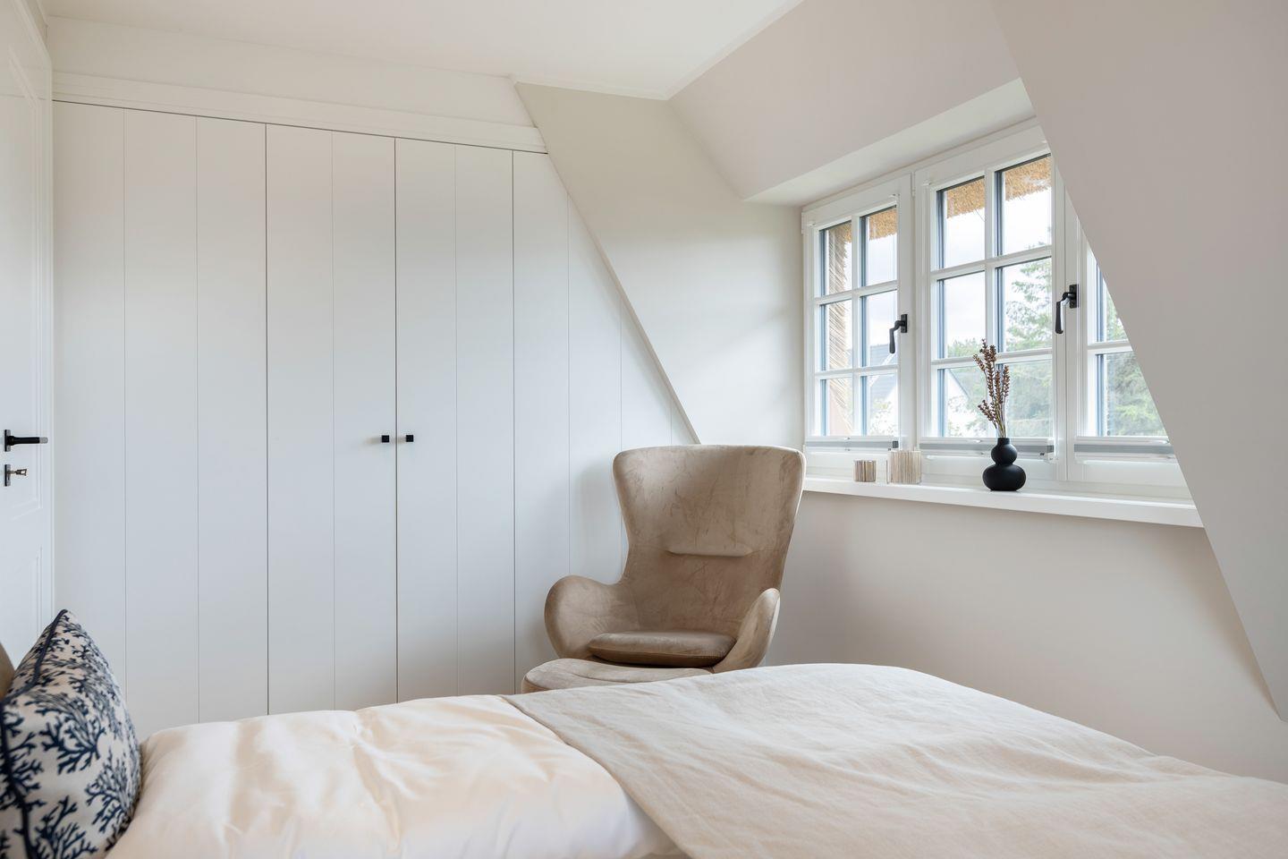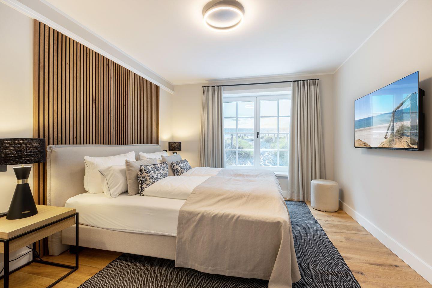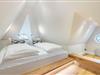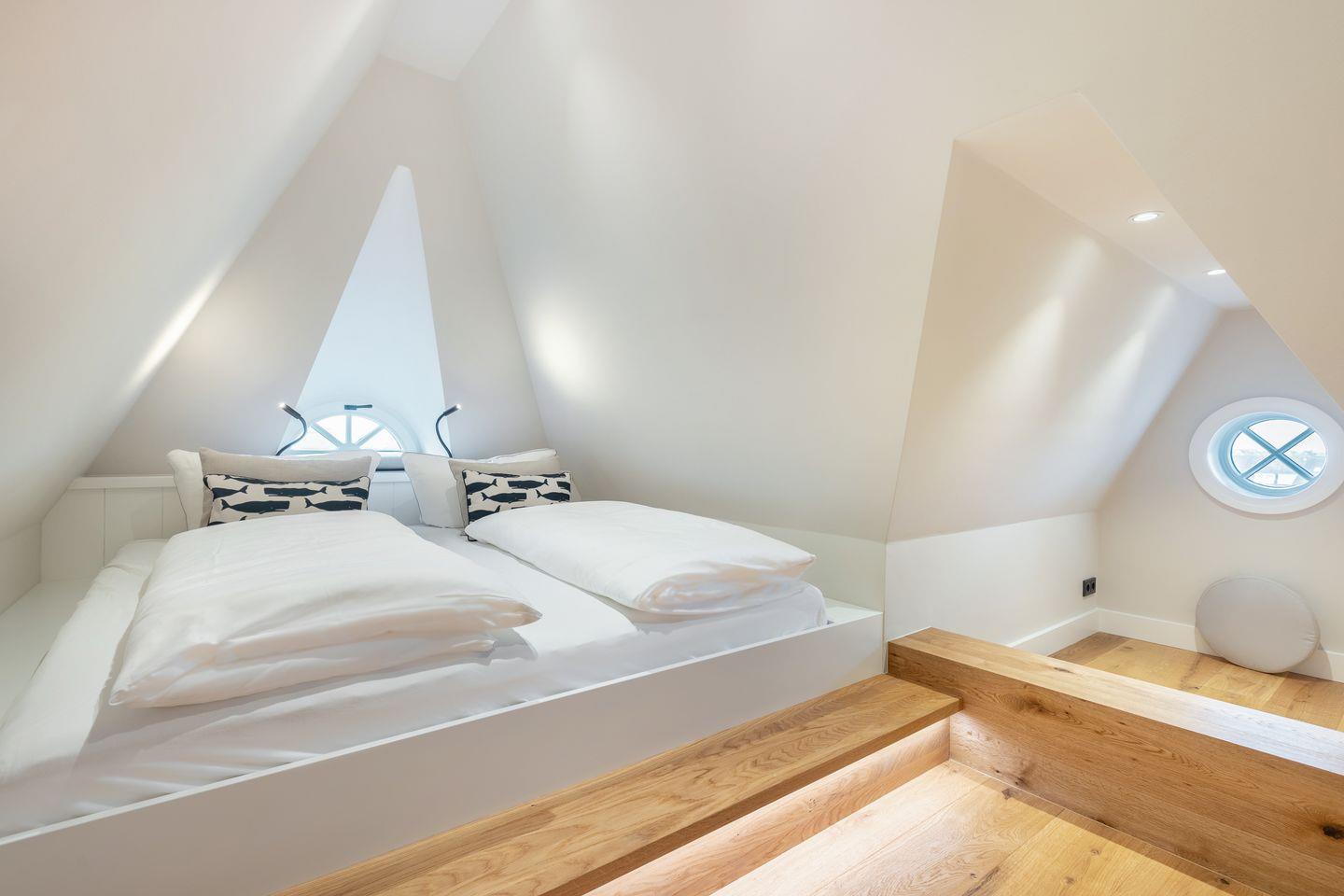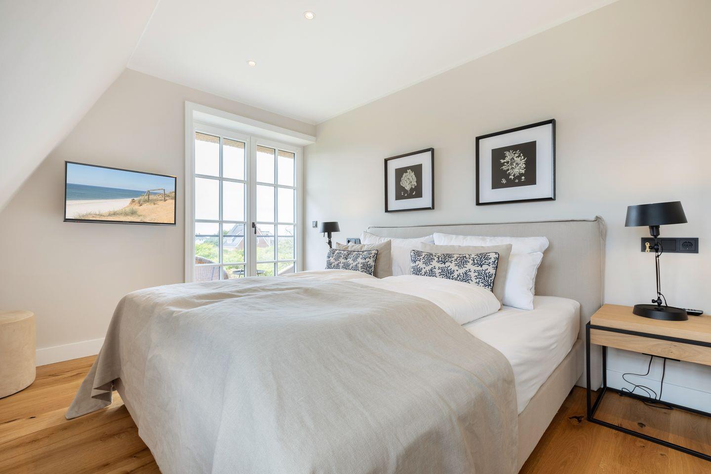 Obergeschoss: Schlafraum mit Doppelbett (180 x 200cm) und begehbarem Kleiderschrank. Von Ihrem nach Westen ausgerichteten Balkon haben Sie sogar einen kleinen Meerblick.[nbsp] Das Bad mit Badewanne/Dusche [&] WC ist stilvollendet und mit hochwertigen Armaturen ausgestattet.
