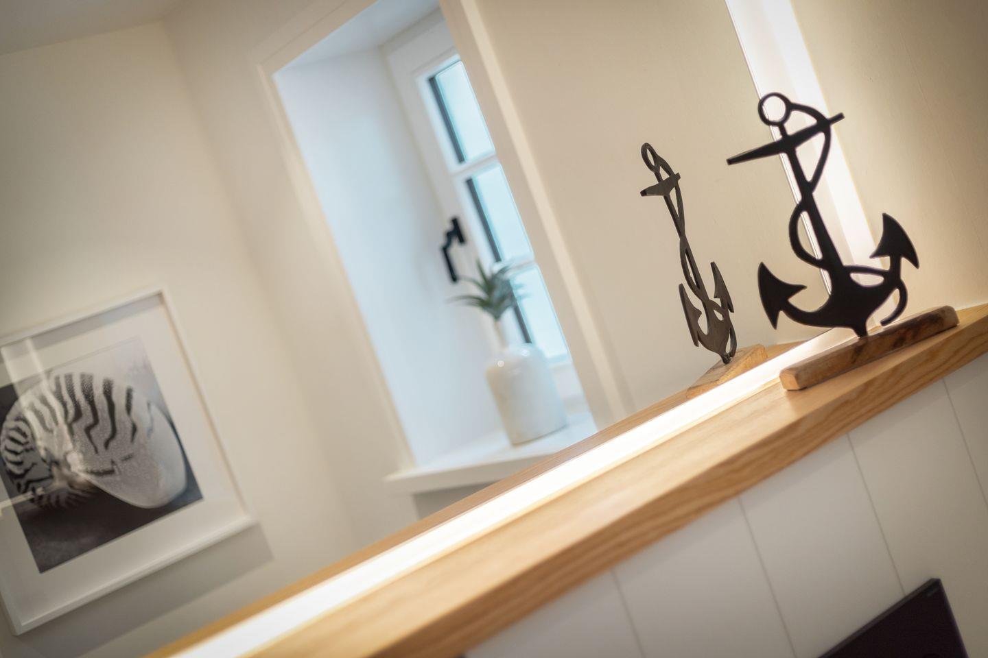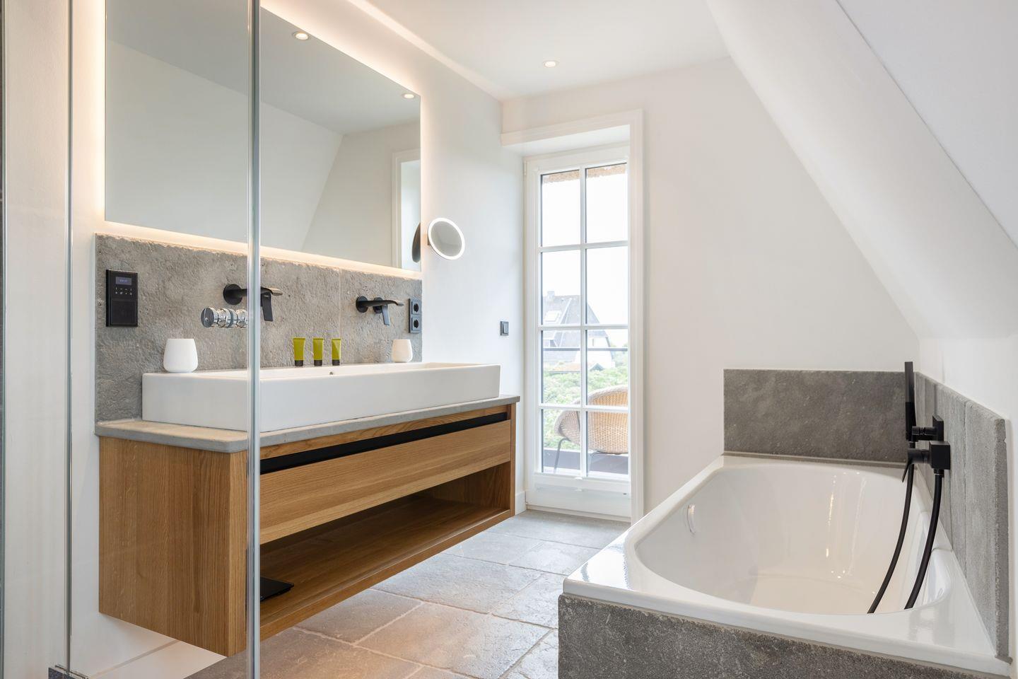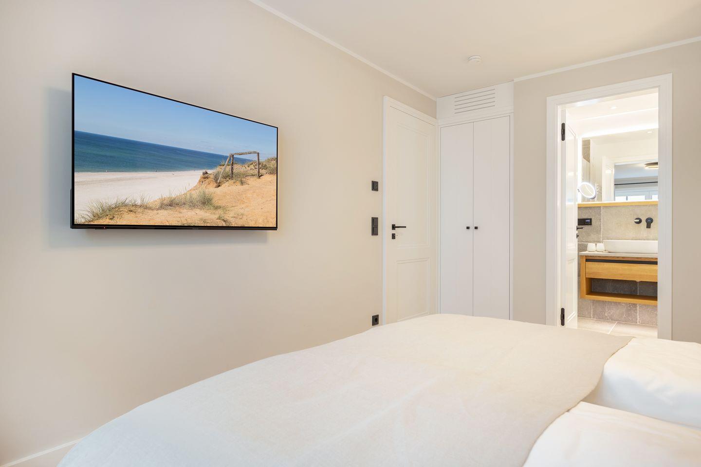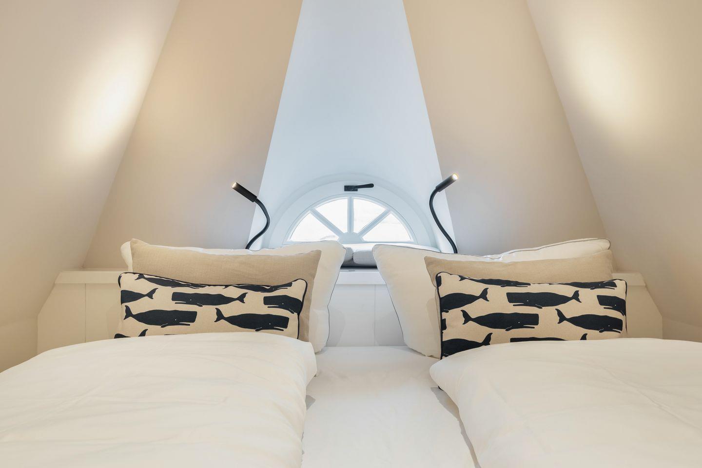 Obergeschoss: Schlafraum mit Doppelbett (180 x 200cm) und begehbarem Kleiderschrank. Von Ihrem nach Westen ausgerichteten Balkon haben Sie sogar einen kleinen Meerblick.[nbsp] Das Bad mit Badewanne/Dusche [&] WC ist stilvollendet und mit hochwertigen Armaturen ausgestattet.