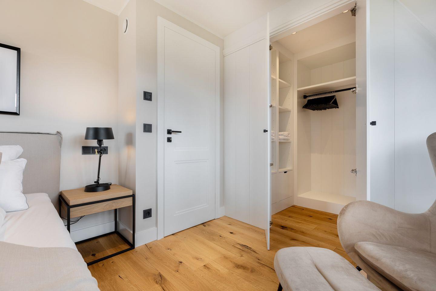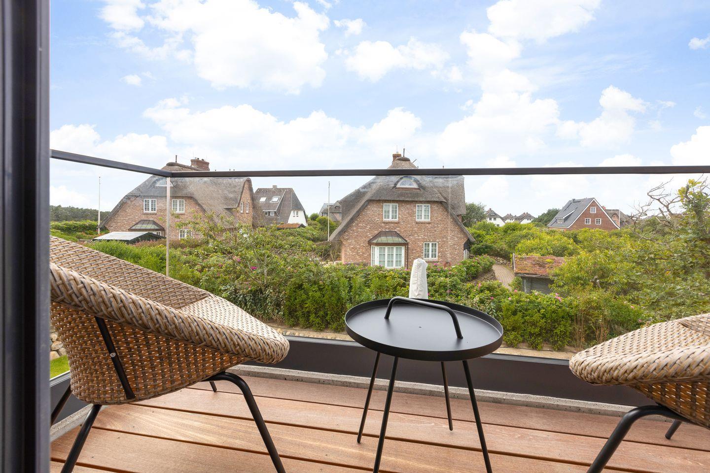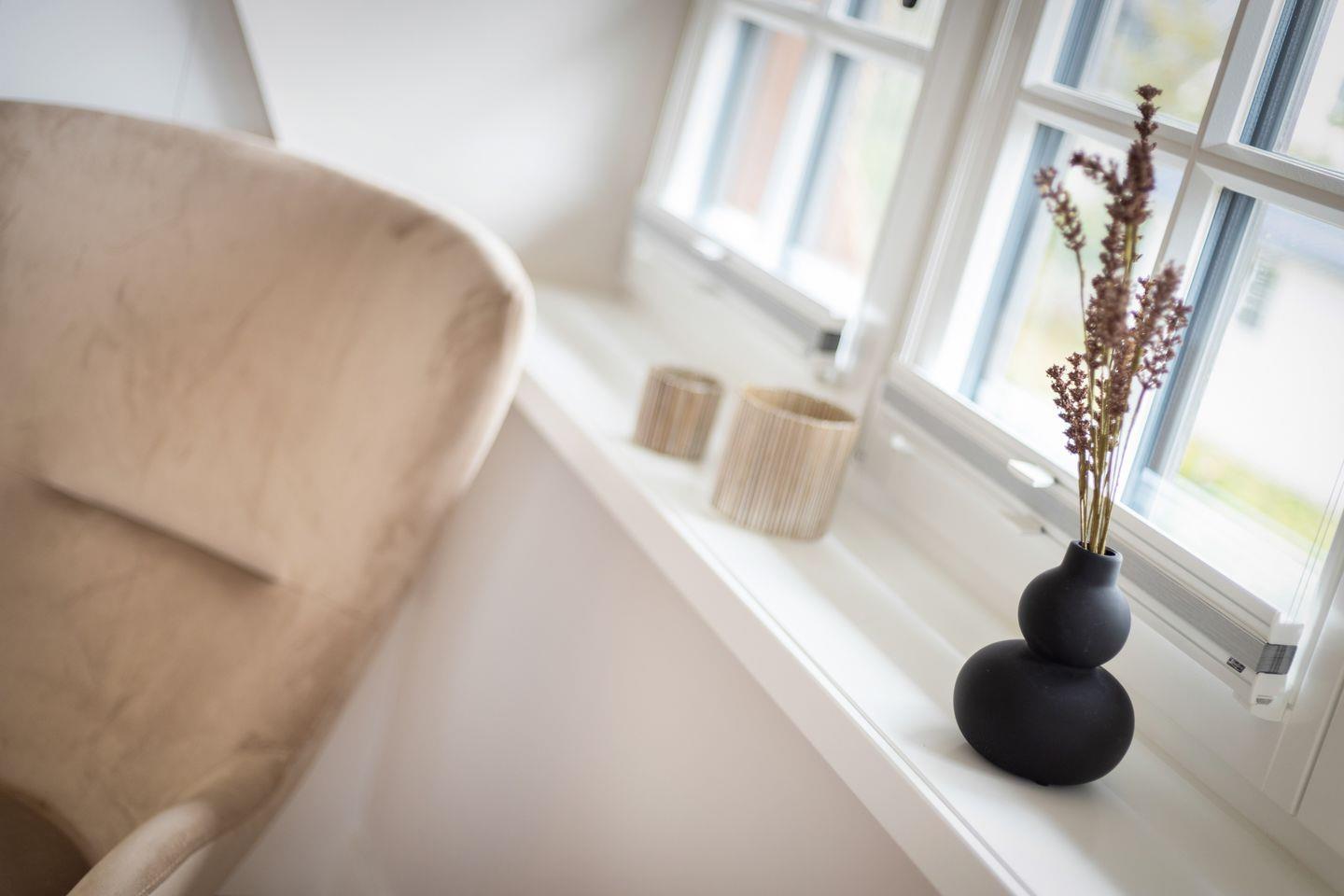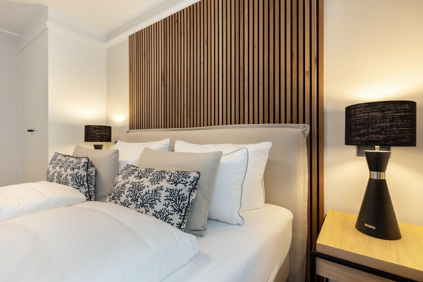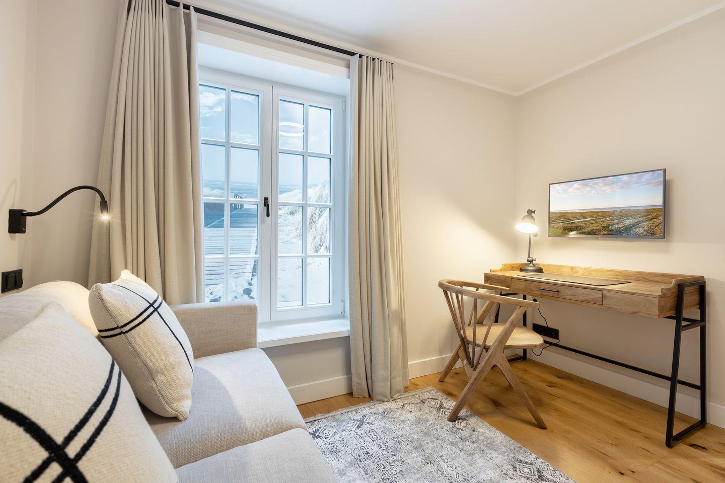 Obergeschoss: Schlafraum mit Doppelbett (180 x 200cm) und begehbarem Kleiderschrank. Von Ihrem nach Westen ausgerichteten Balkon haben Sie sogar einen kleinen Meerblick.[nbsp] Das Bad mit Badewanne/Dusche [&] WC ist stilvollendet und mit hochwertigen Armaturen ausgestattet.