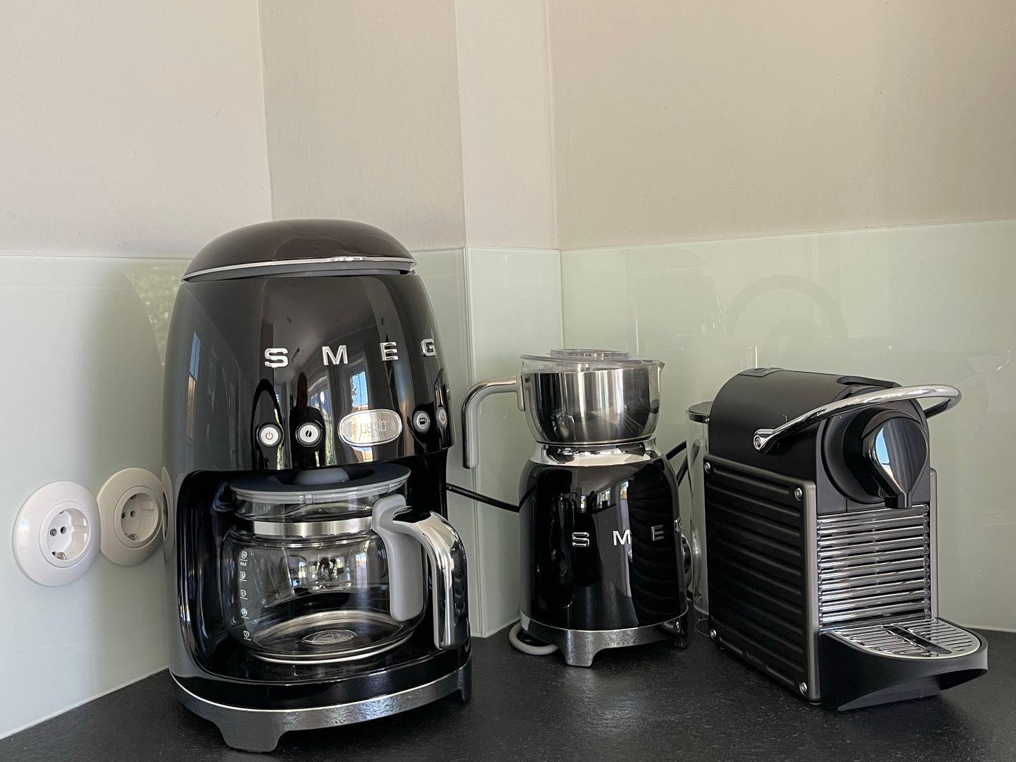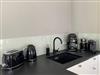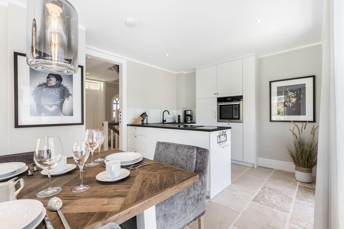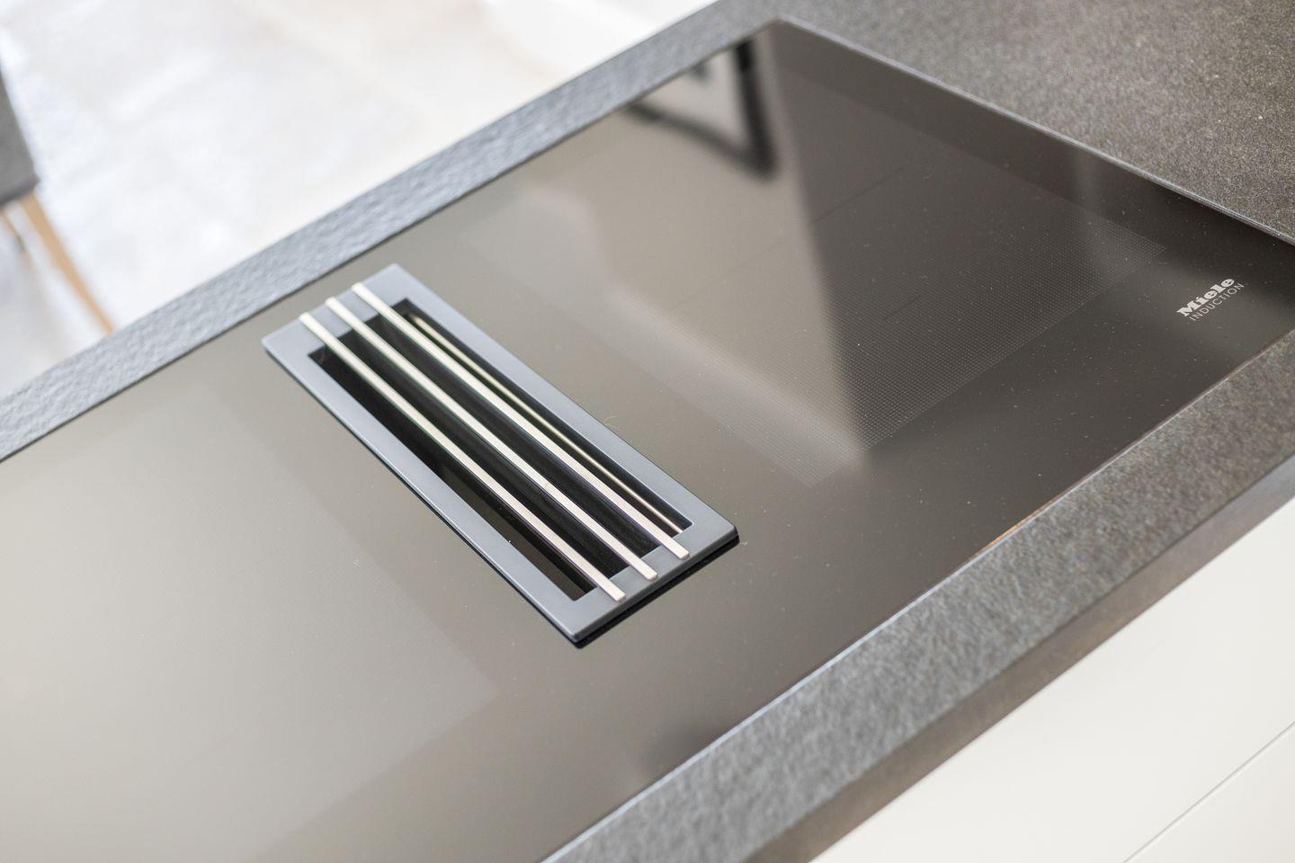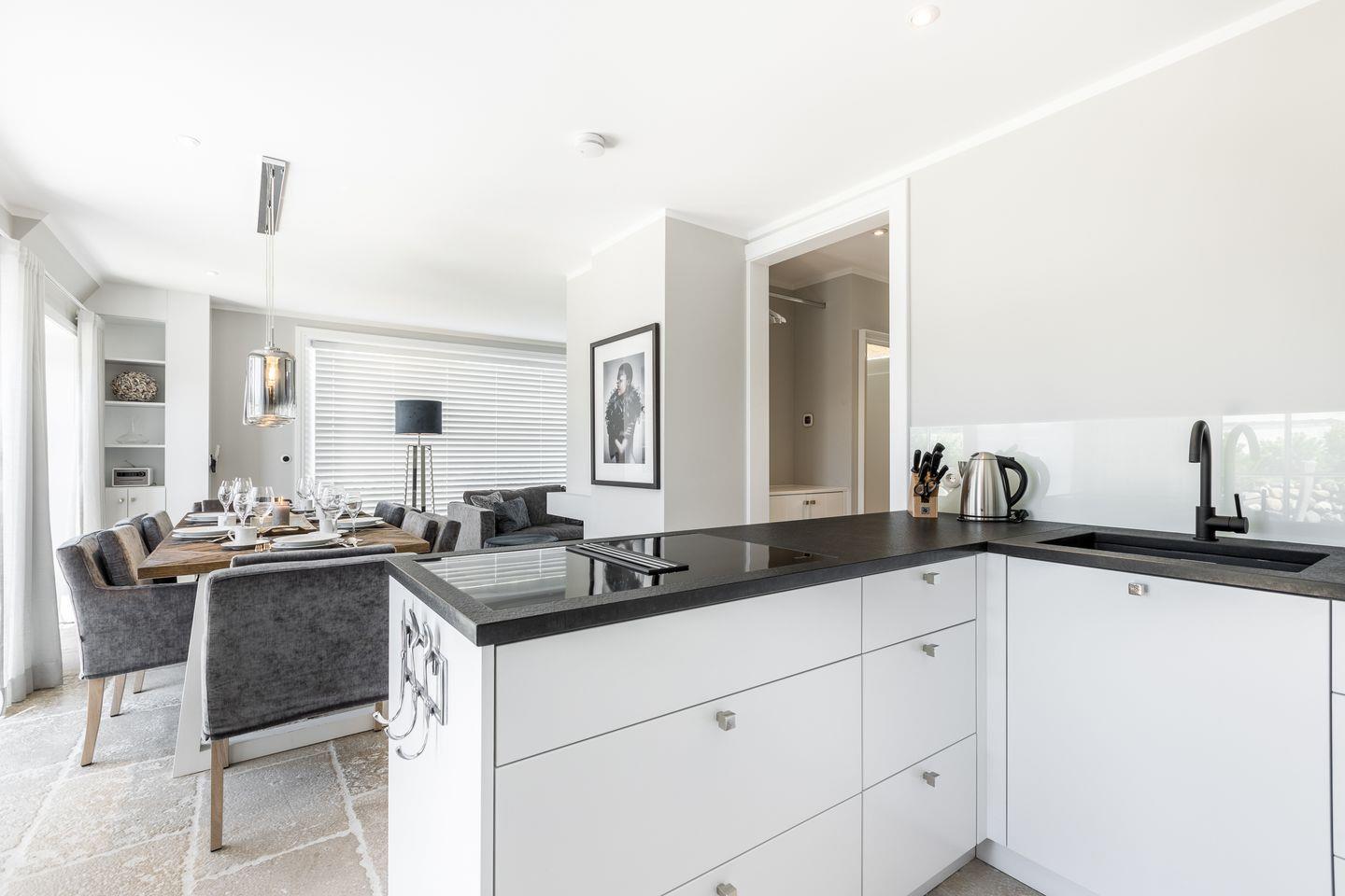 Die offene Küche präsentiert sich in dezent in Weiß mit einer Arbeitsplatte aus grauem Granit und ist selbstverständlich