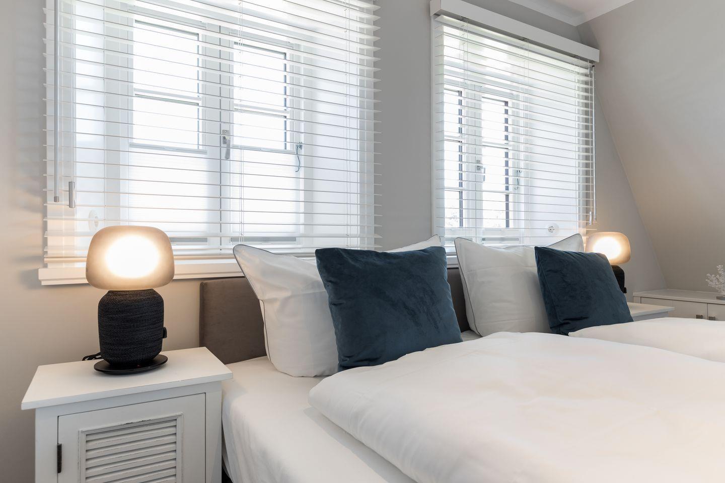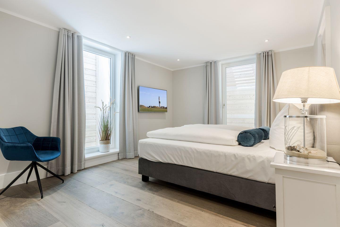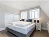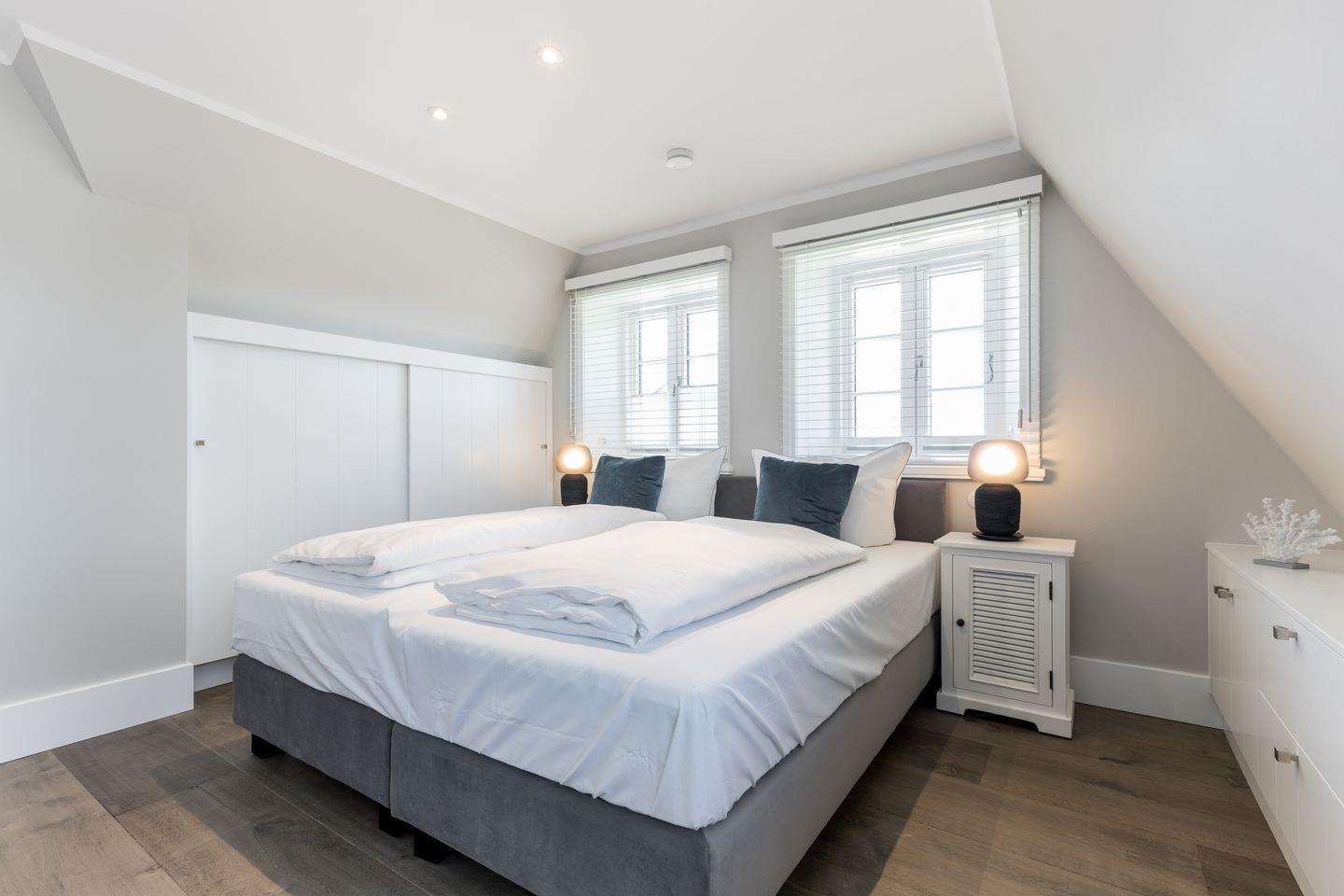 Schlafzimmer mit luxuriösem Boxspringbett und ein großes Duschbad. Ein ähnliches Bild bietet sich auch im Untergeschoss,
