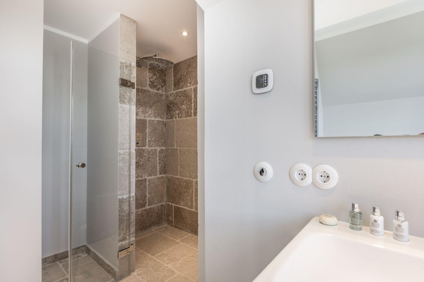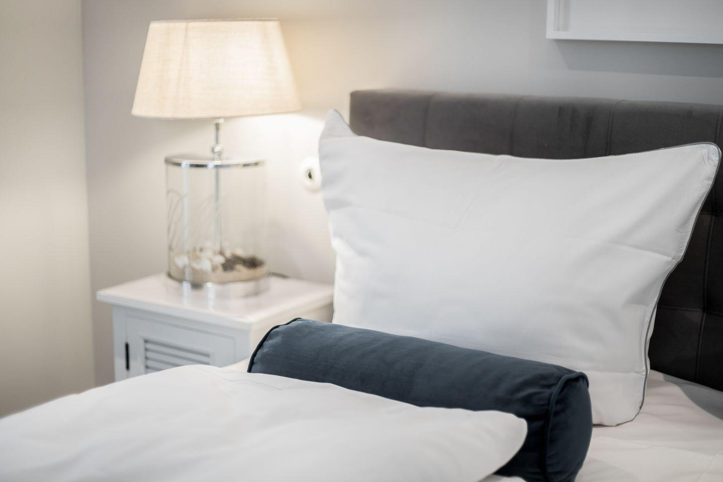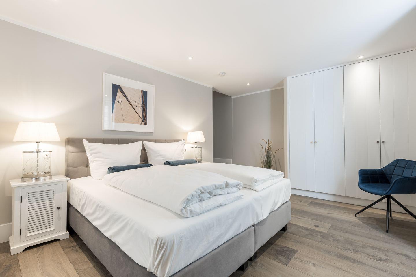 Schlafzimmer mit luxuriösem Boxspringbett und ein großes Duschbad. Ein ähnliches Bild bietet sich auch im Untergeschoss,