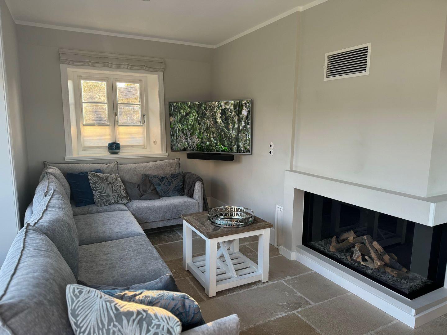 EG: Wohnzimmer mit Gaskamin und Flatscreen-TV; Sonos Soundsystem mit Subwoofer, offene Küche mit Backofen, Induktionsherd, Geschirrspülmaschine;