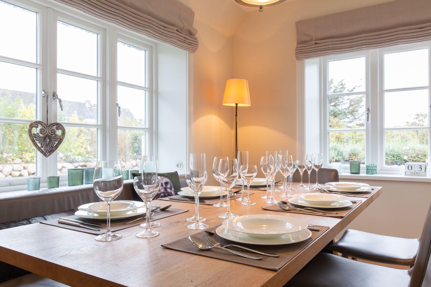 Auch Ihre Küche ist ein Traum, bietet diese voll ausstaffiert alles, auch ein anspruchsvolles Menue zu zaubern. An Ihrem schönen Holztisch mit Bank und Design-Stühlen (u.a. Vitra) lässt sich dieses bei einem guten Glas Rotwein bestens zelebrieren. Oder einfach bei einem morgendlichen Espresso mit schweifendem Blick über Ihren traumhaften Garten easy in den Tag starten.