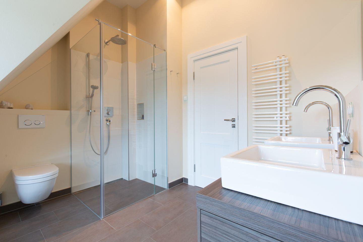 Ein Luxusbad mit großer Dusche, Badewanne und Doppelwaschtisch lässt Sie bester Laune in den Sylter Urlaubstag starten.